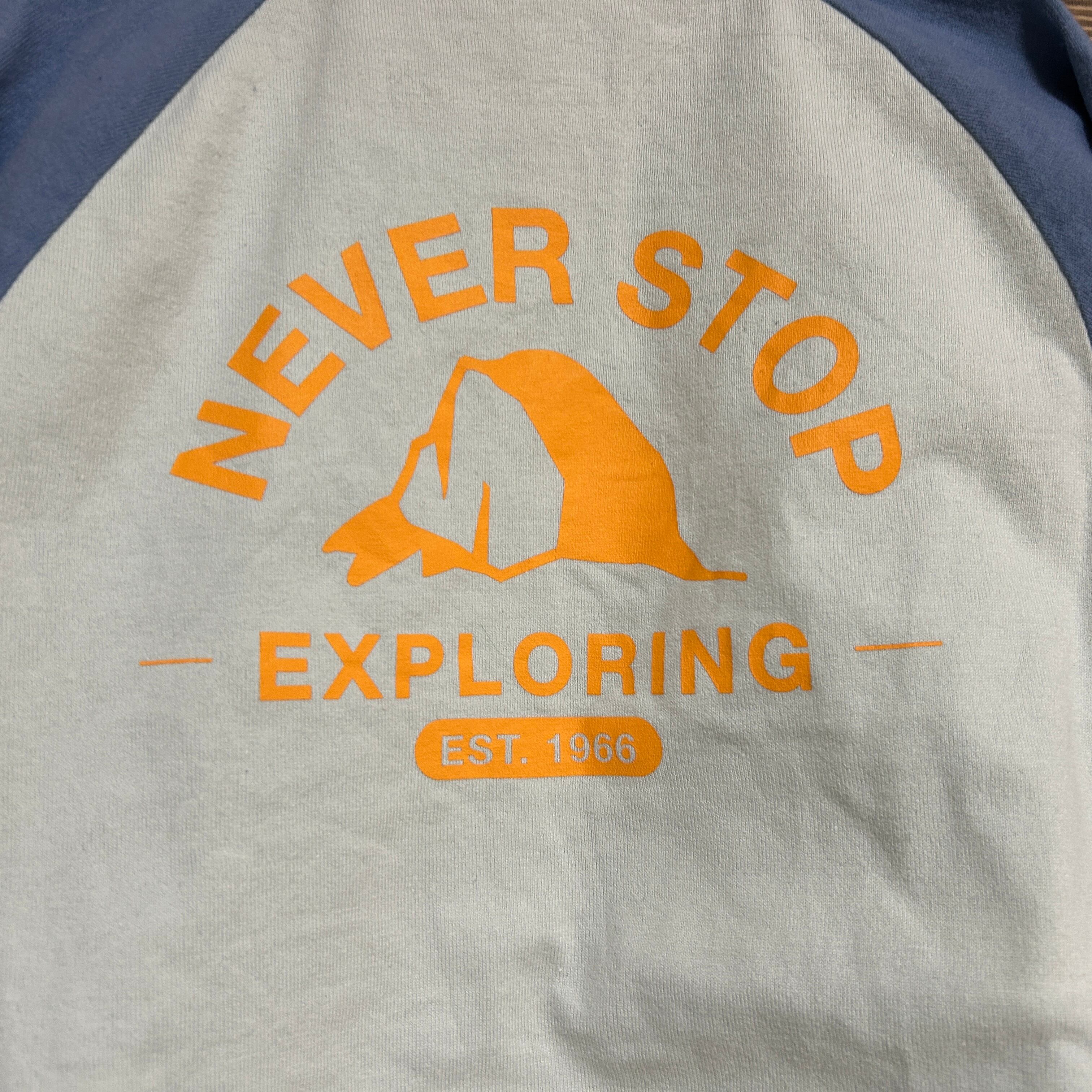 ノースフェイス 長袖TシャツロンT ネイビー デカロゴ 子供140キャンプF1 古着 キッズ バックプリント