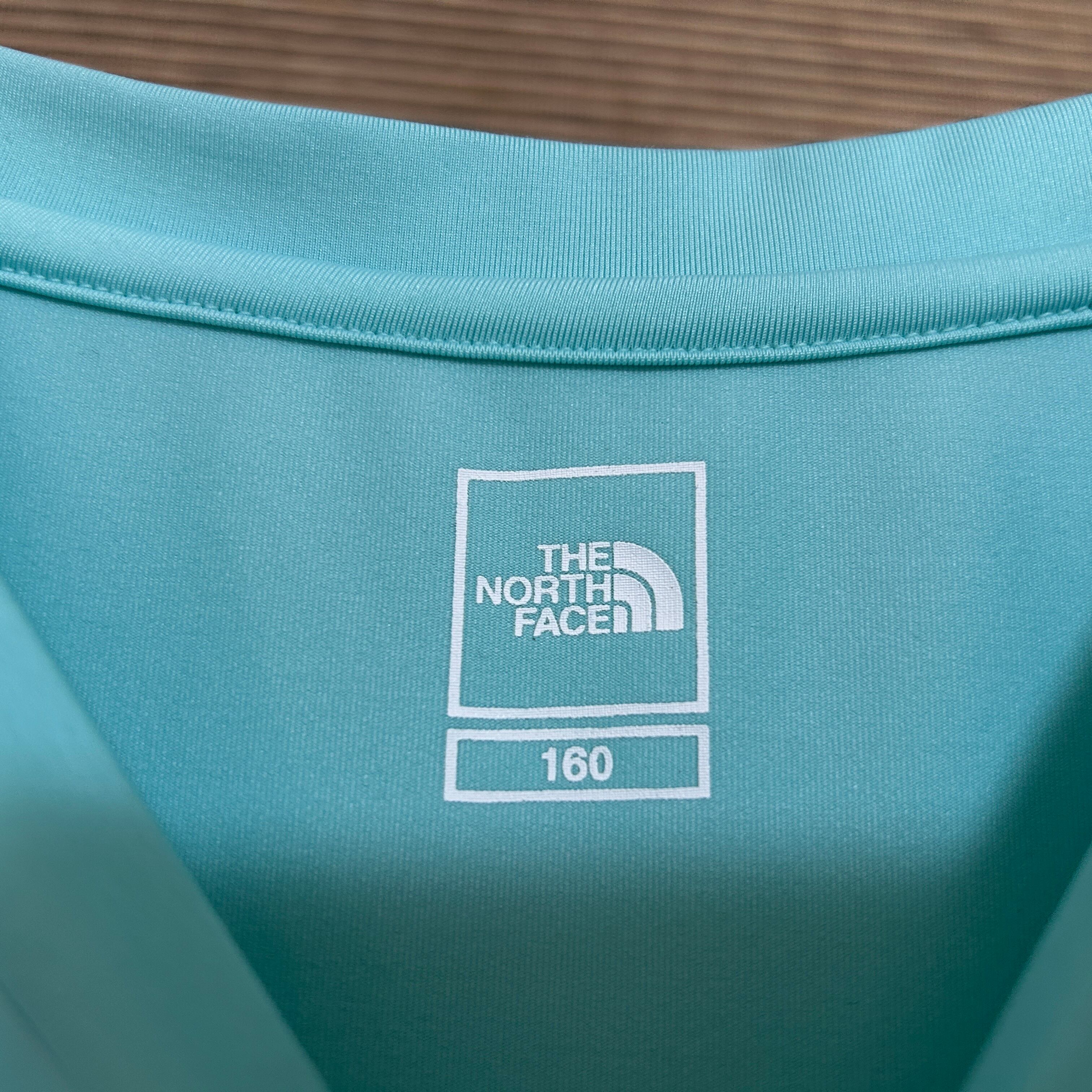 ノースフェイス 半袖ドライTシャツ 速乾 子供160キッズ ミントグリーンF1 古着 レディース 肩ロゴ 袖ロゴ ストレッチ伸縮性