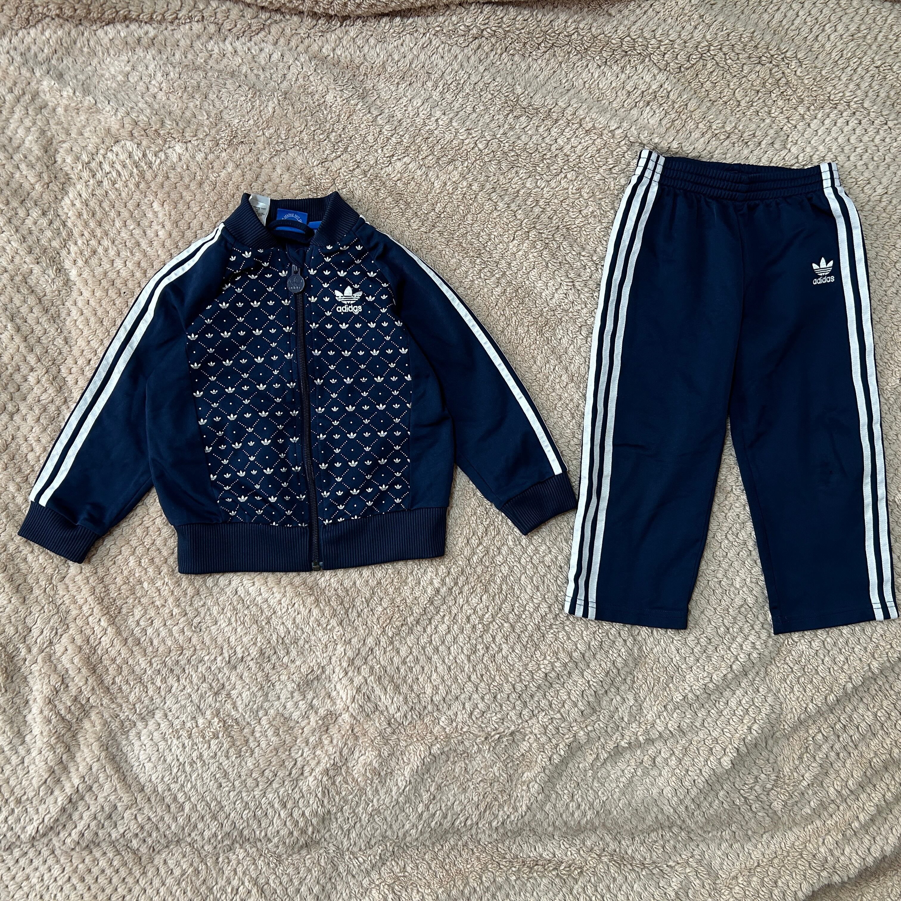 アディダス セットアップジャージキッズ90 総柄 ネイビー トレフォイルF1 古着 スーパースター SST 子供