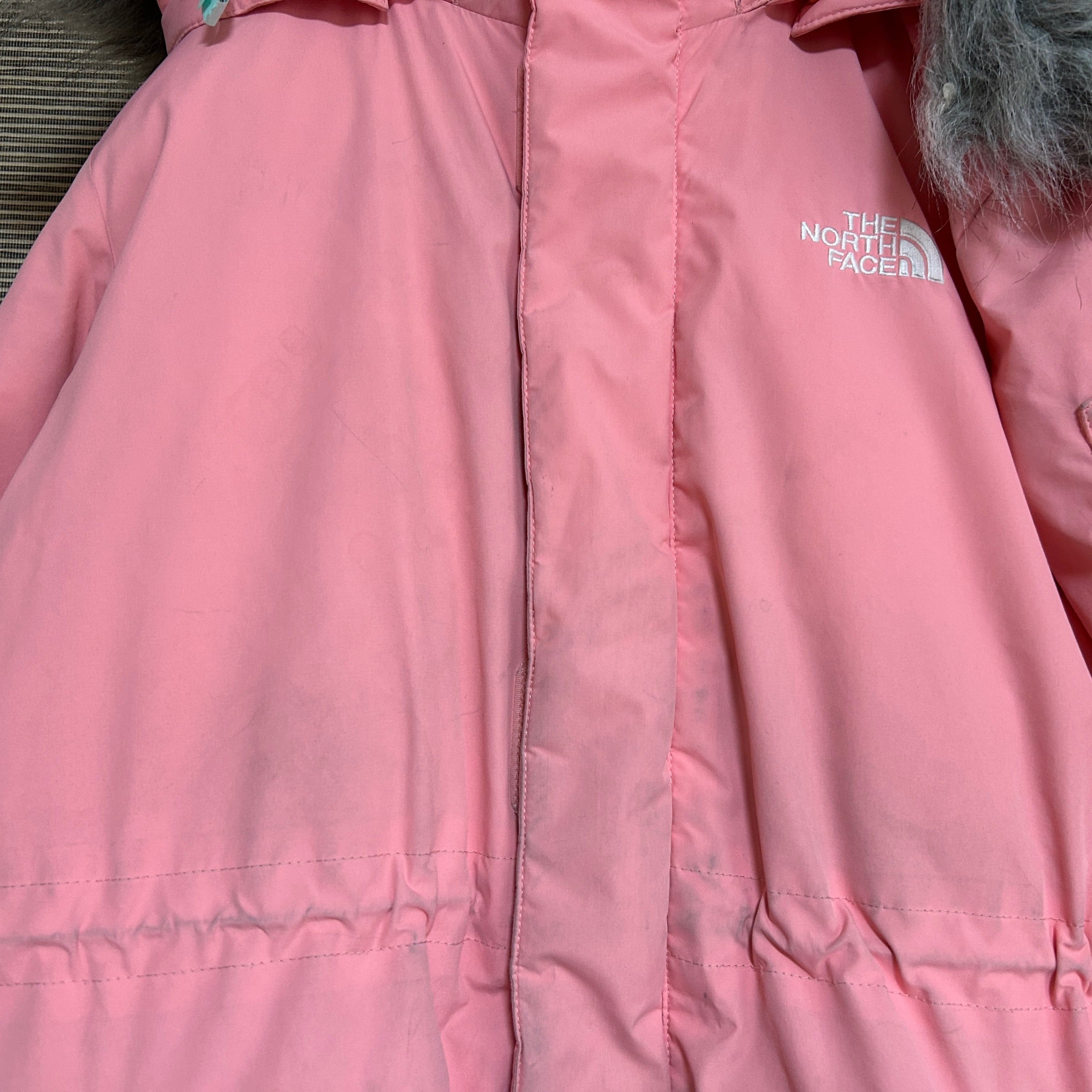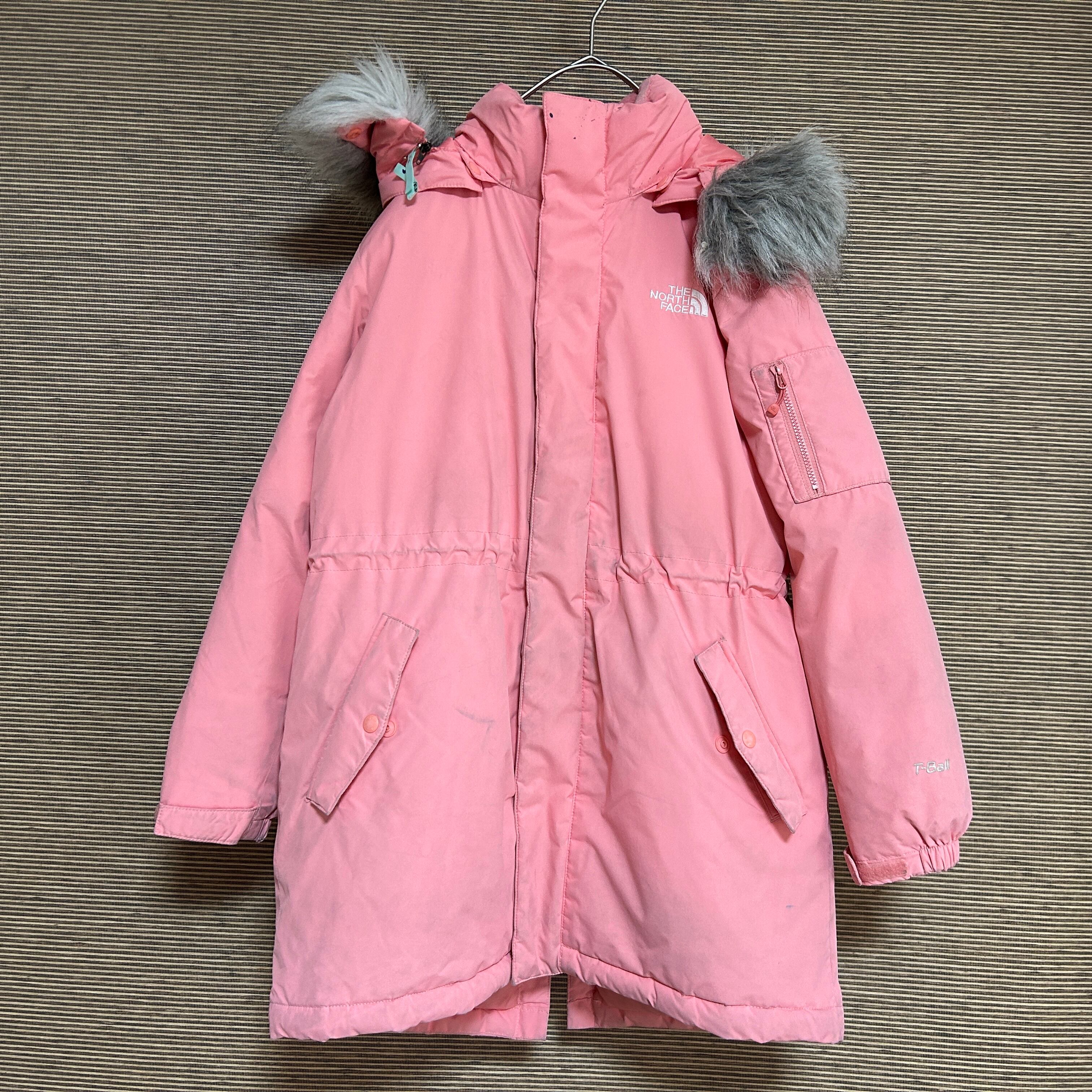ノースフェイス ロングダウンコートベンチコート子供140 ピンクフェイクファーH2 古着 キッズ TBALL 袖ロゴ 刺繍
