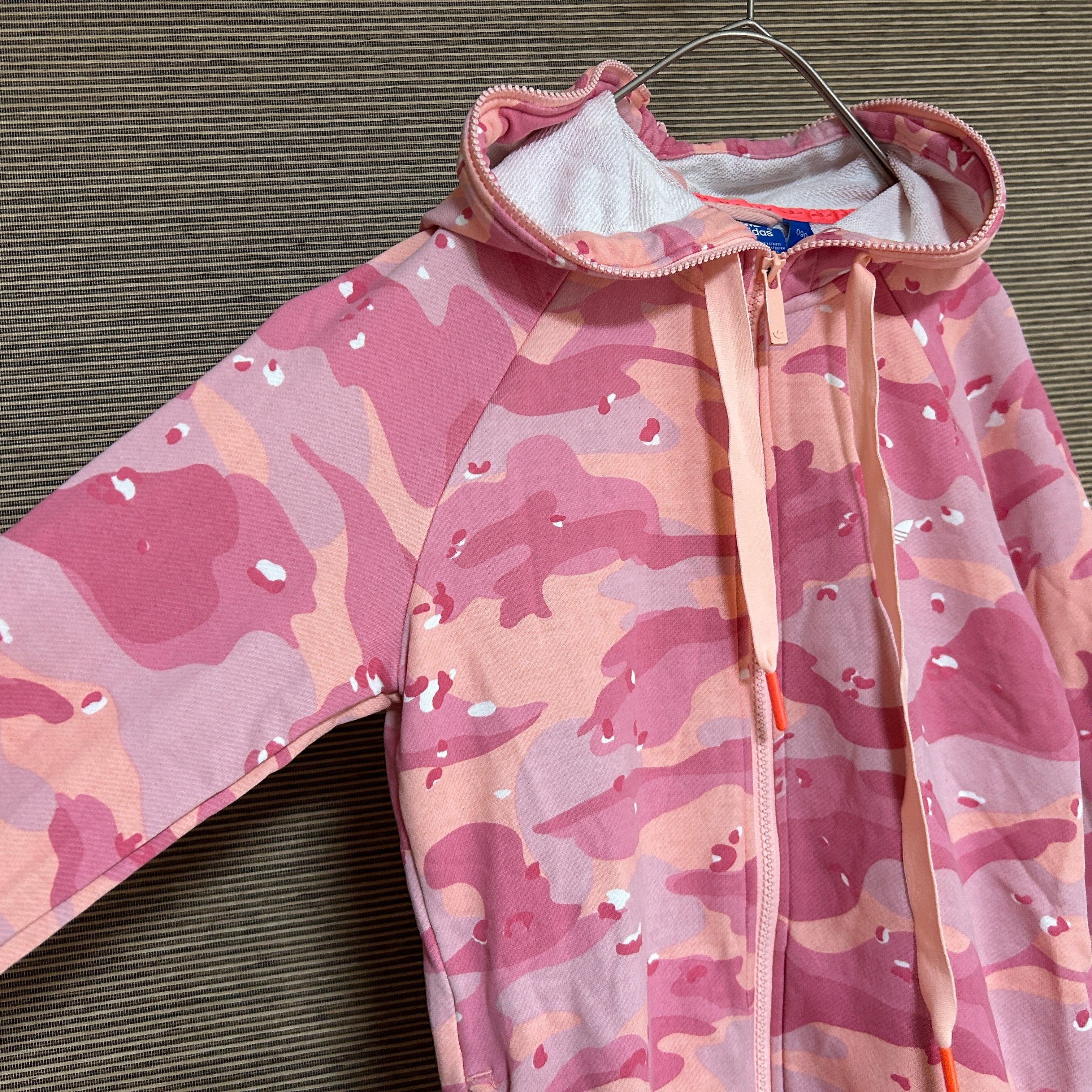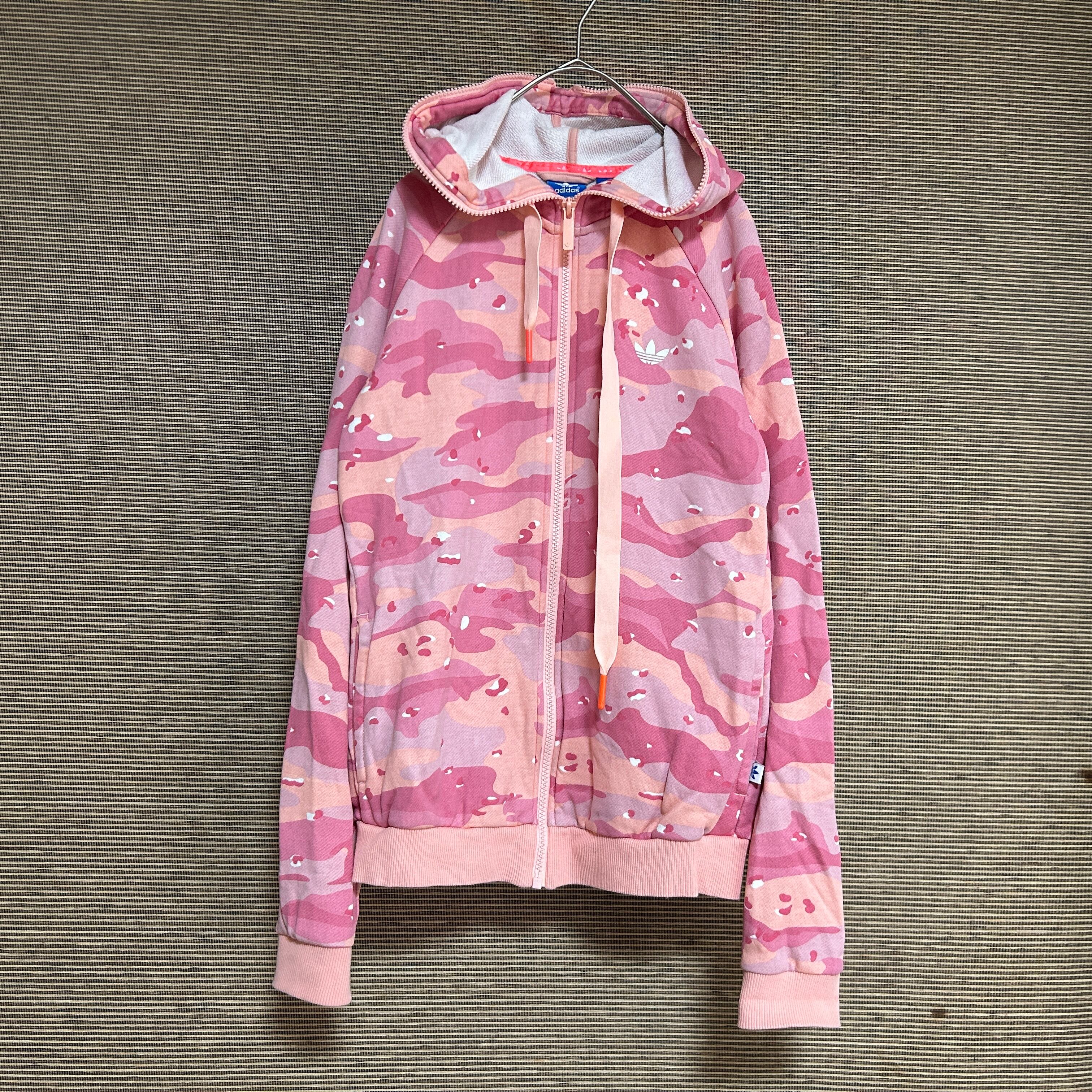 アディダス パーカー カモフラ迷彩 ピンク 裏毛 トレフォイルロゴE1 古着 ワンポイントロゴ プリントロゴ レディース