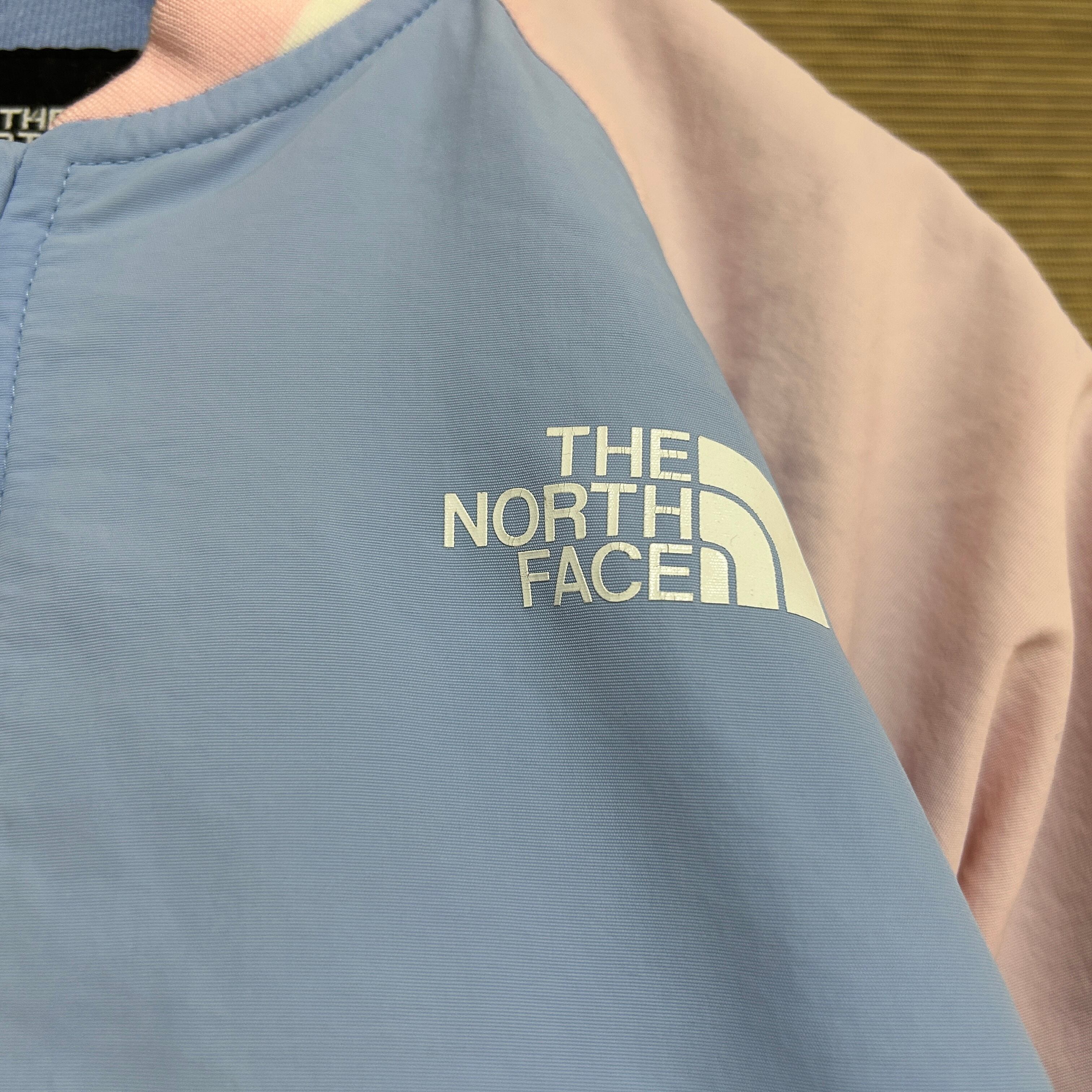 ノースフェイス ナイロンジャケット 子供130キッズ ピンク水色 スタジャンH1 古着 プリントロゴ ワンポイントロゴ