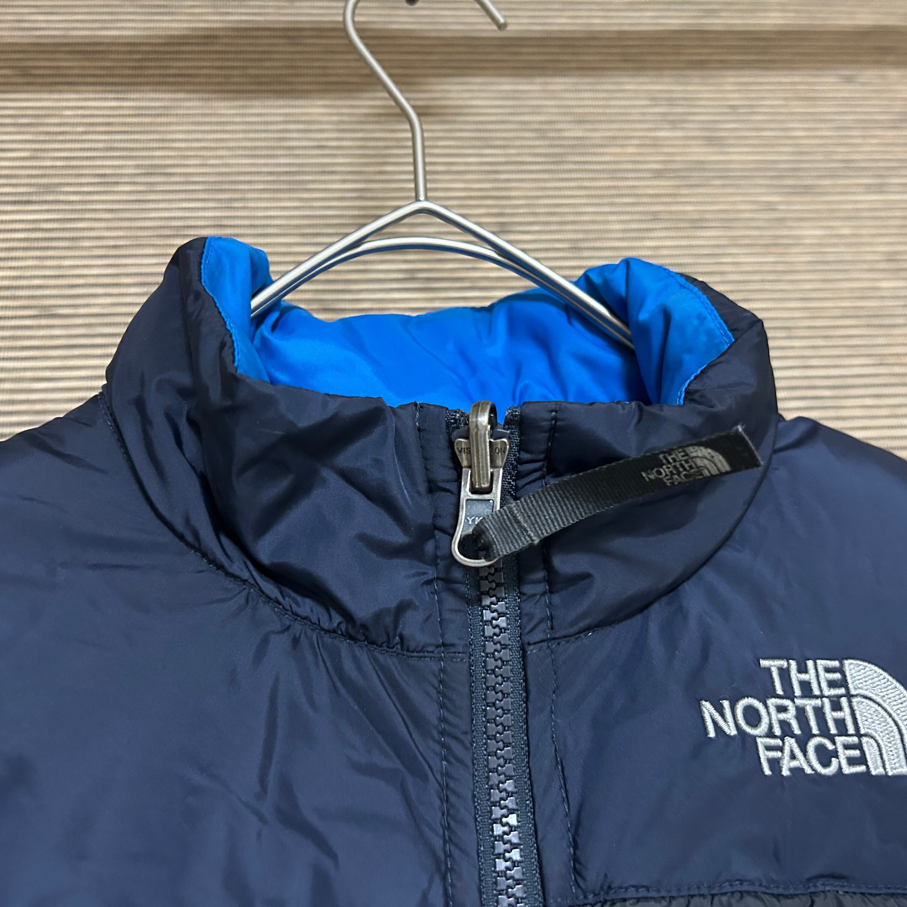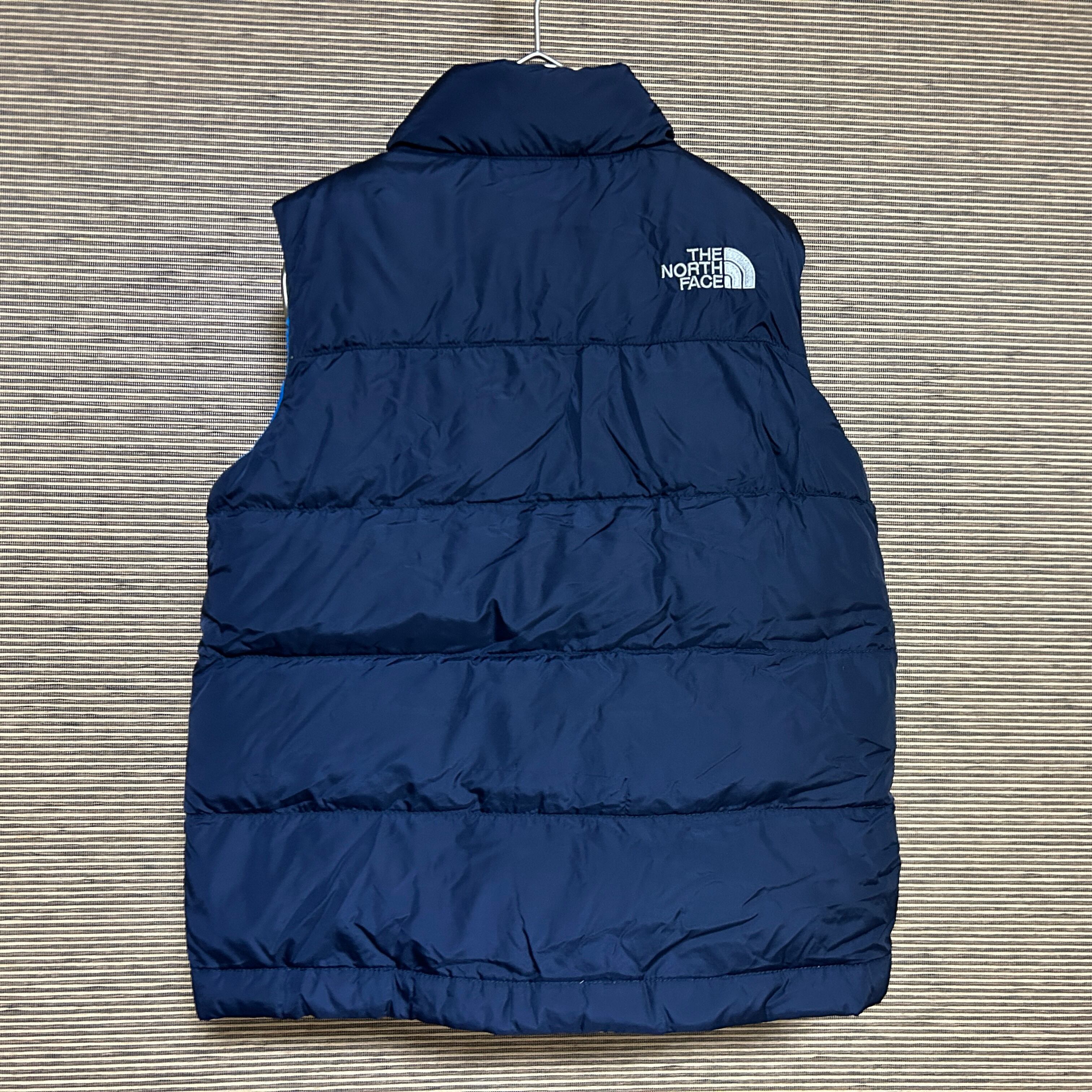 ノースフェイス ダウンベスト 子供110キッズ US規格 ネイビー 刺繍F1 古着 ワンポイントロゴ