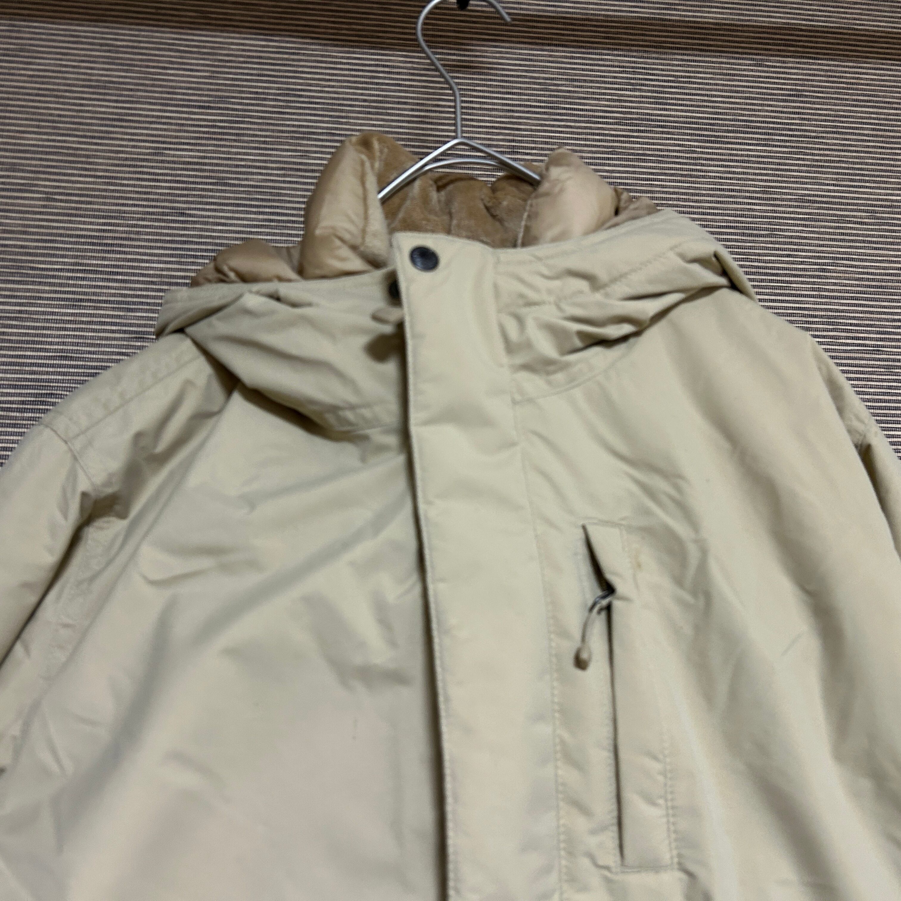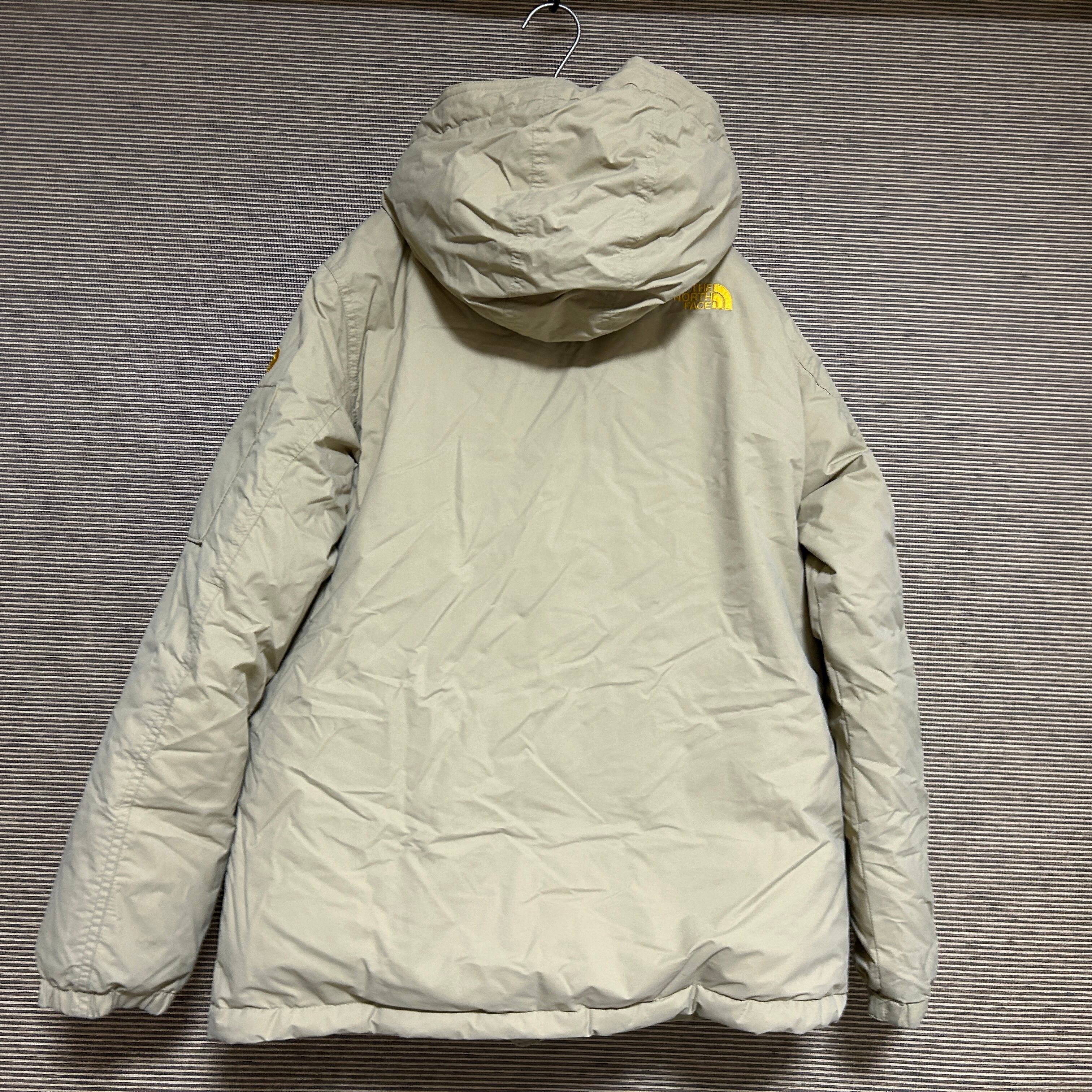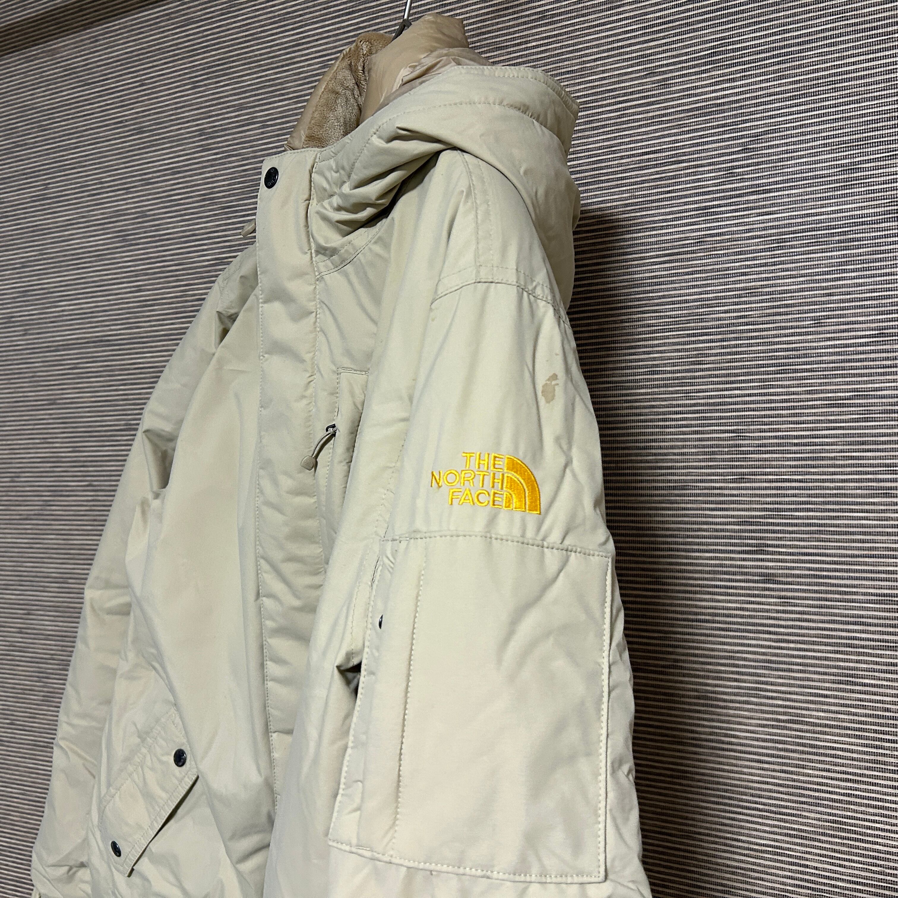 ノースフェイス ダウンジャケット ベージュ 肩ロゴ子供160 キッズ刺繍F1 古着 ワンポイントロゴ