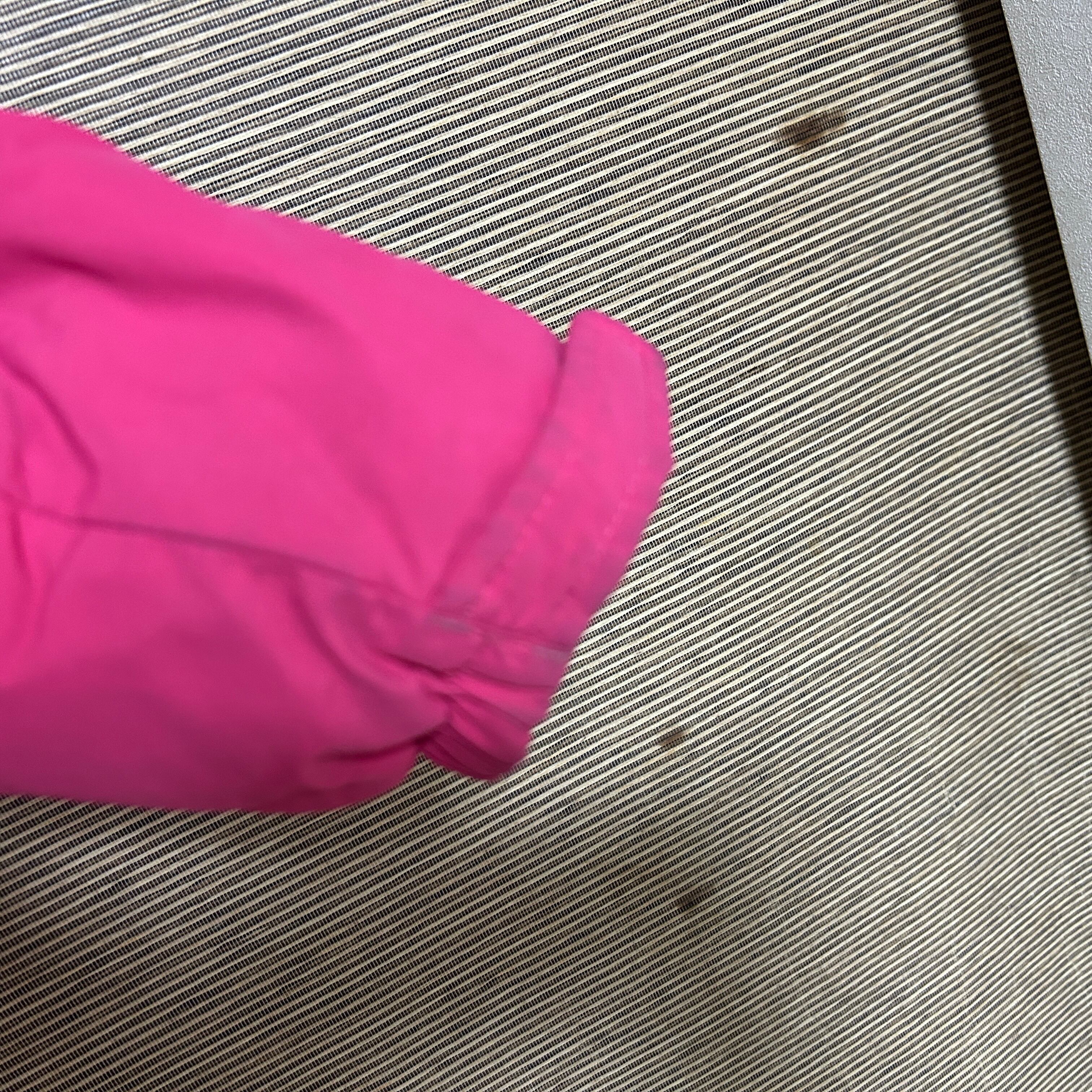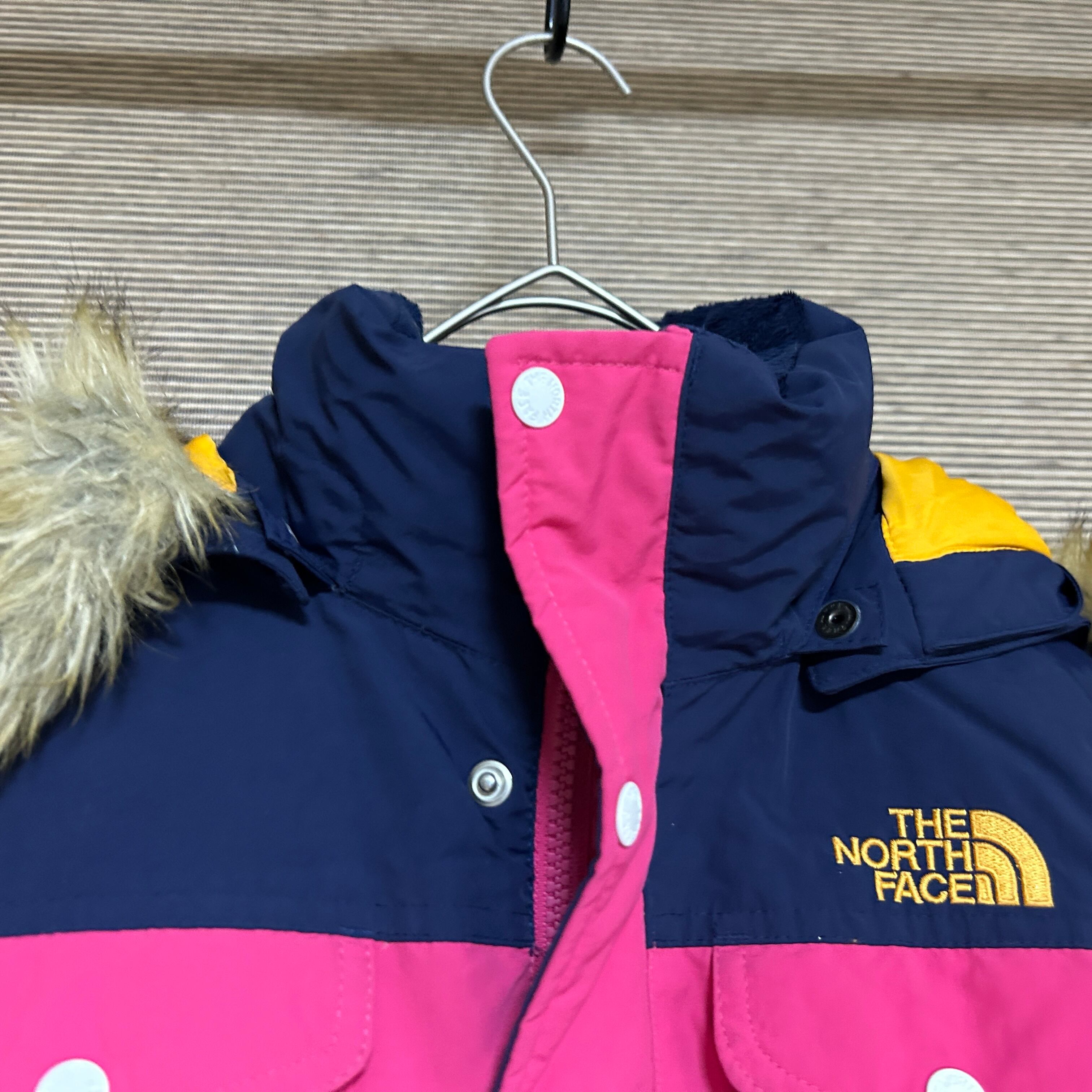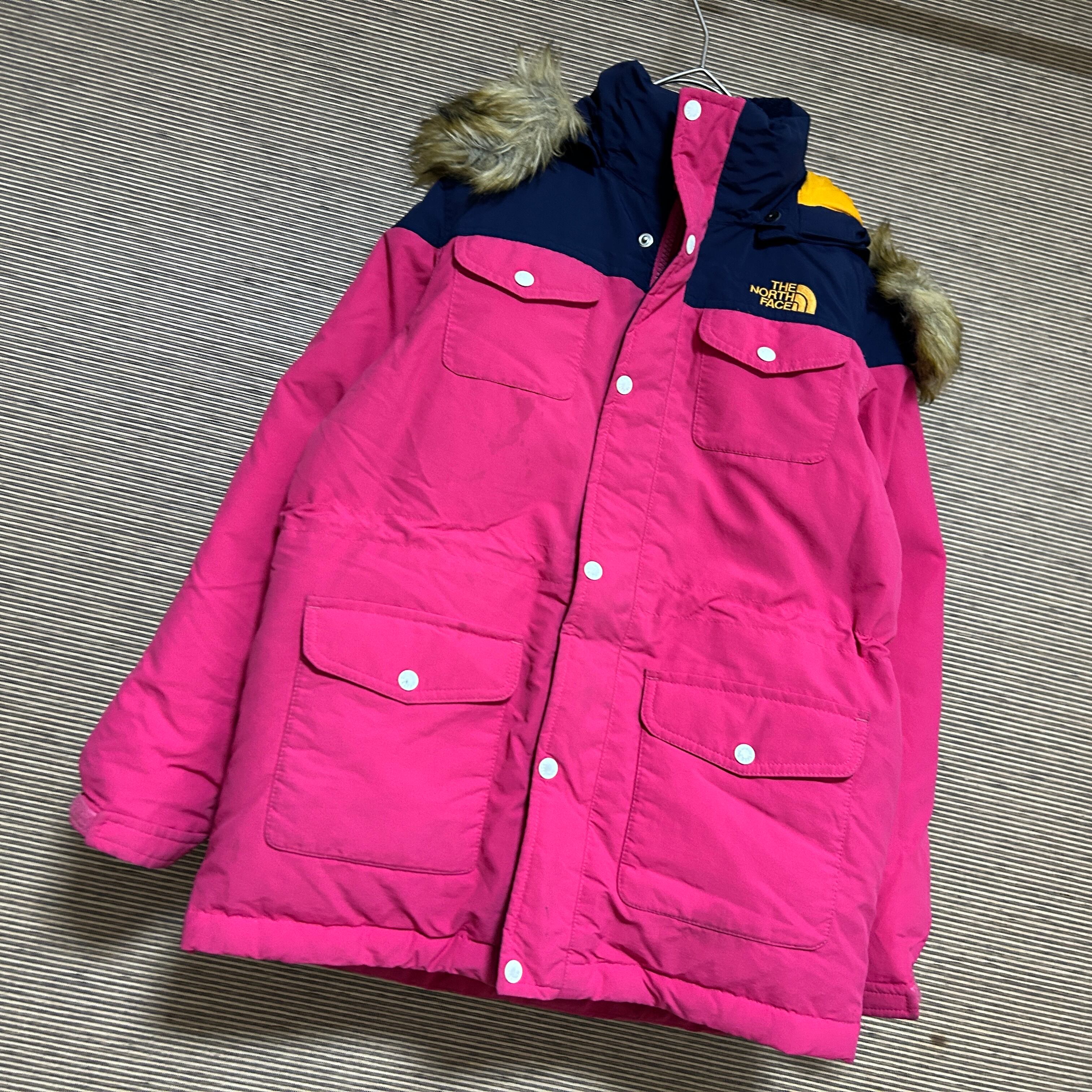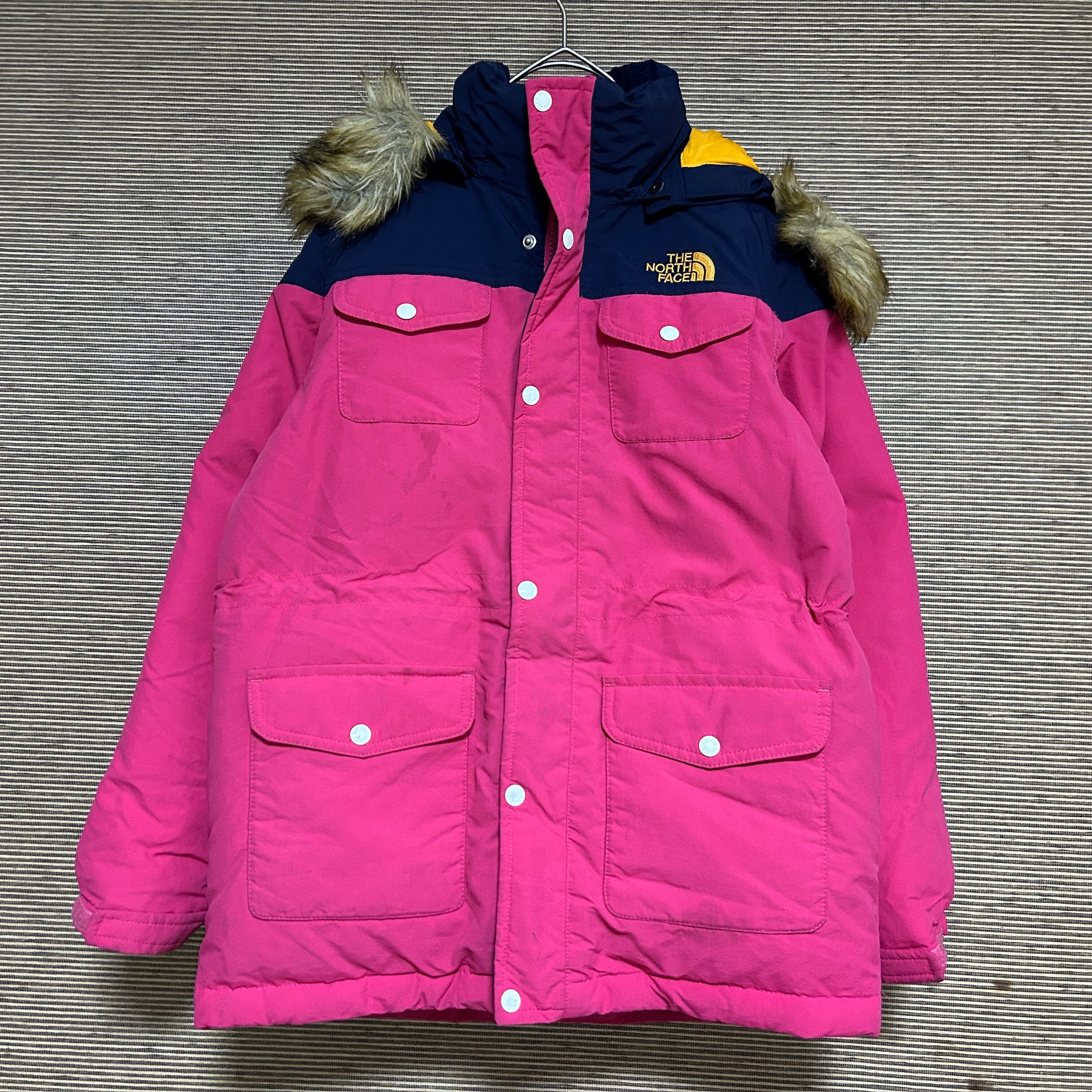 ノースフェイス ダウンジャケット 子供140キッズ モッズ刺繍 ピンクネイビーG 古着 ワンポイントロゴ 訳あり激安 フェイクファー