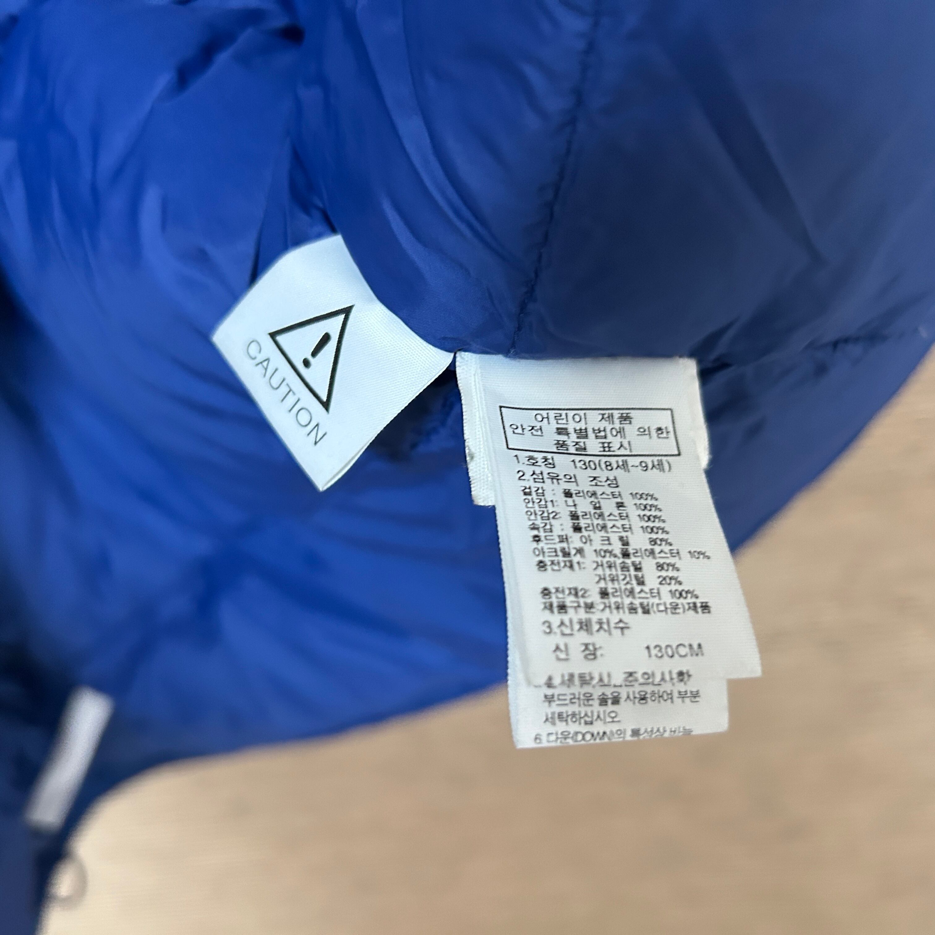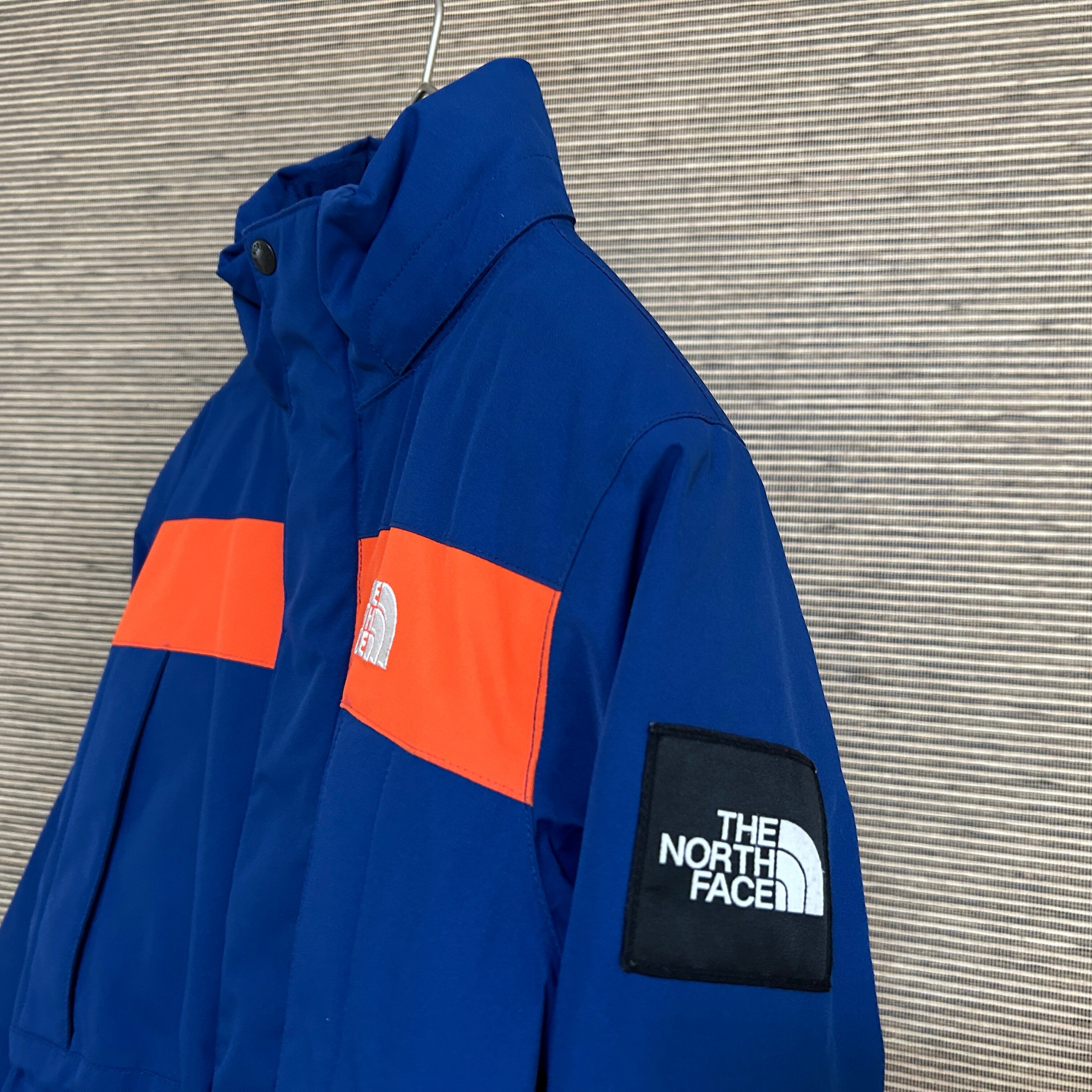ノースフェイス ダウンジャケット 子供130 刺繍 ブルーオレンジキッズG1 古着 ワンポイントロゴ