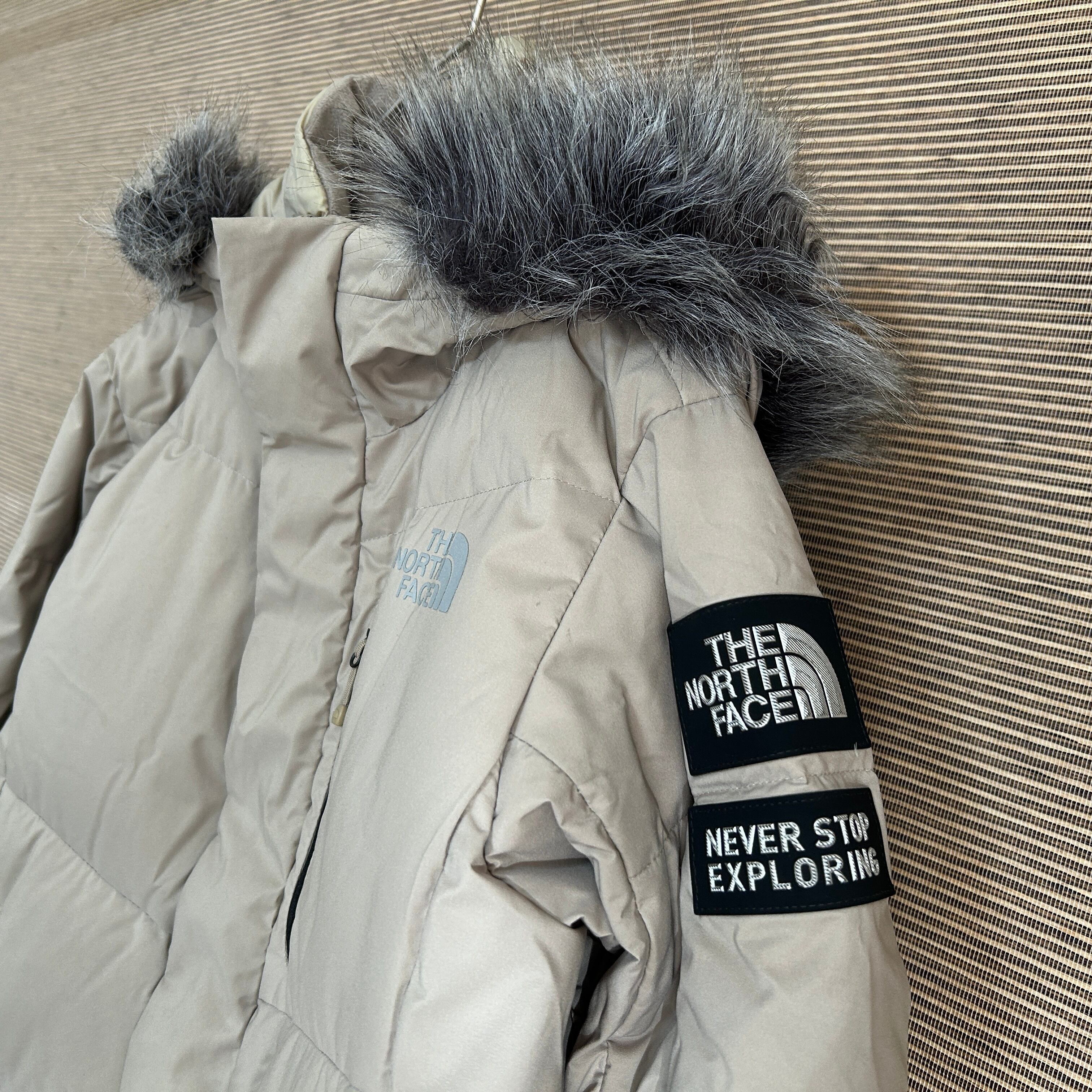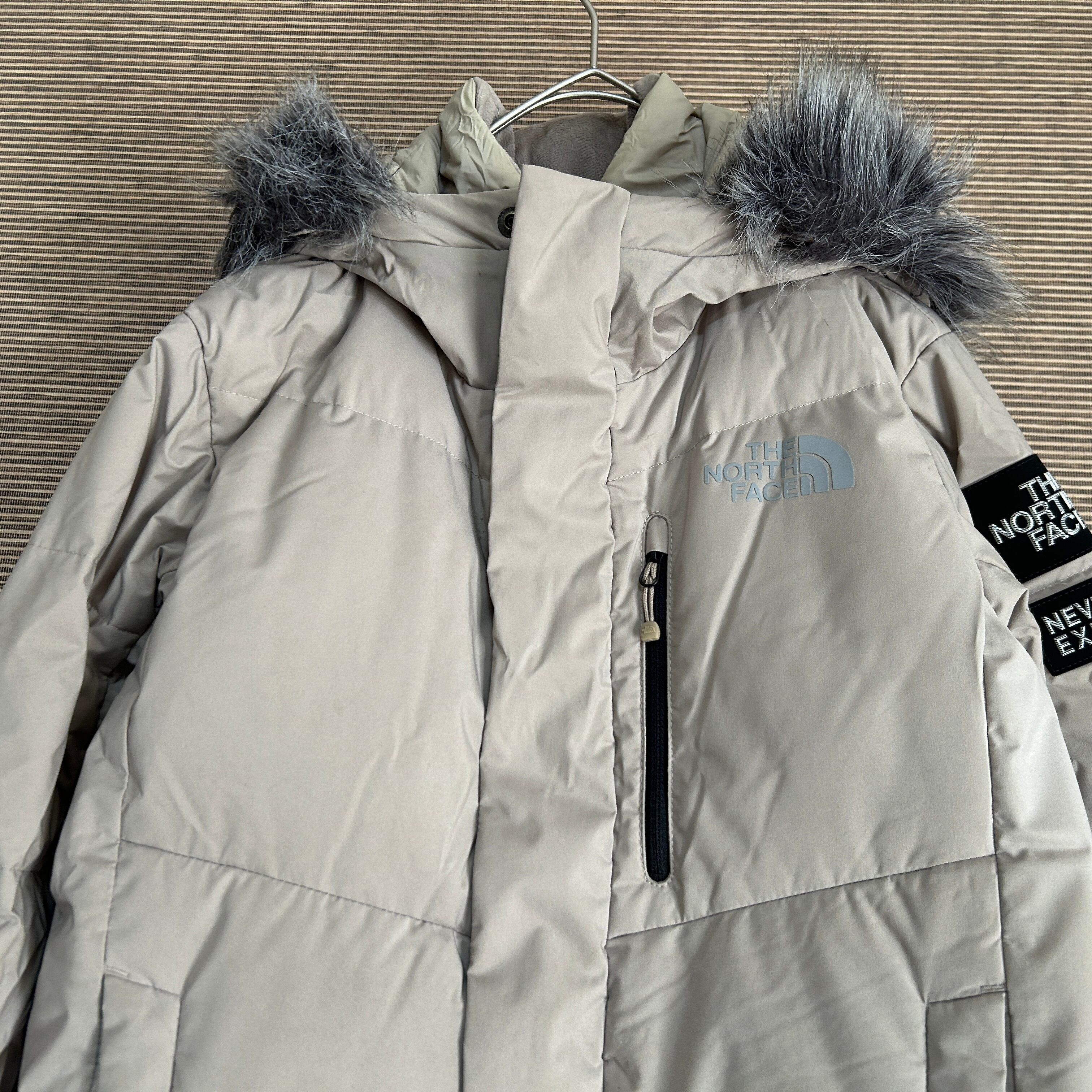 ノースフェイス ダウンジャケット ベージュ 子供130 フェイクファー肩ロゴF2 古着 キッズ ドライベント 袖ロゴ