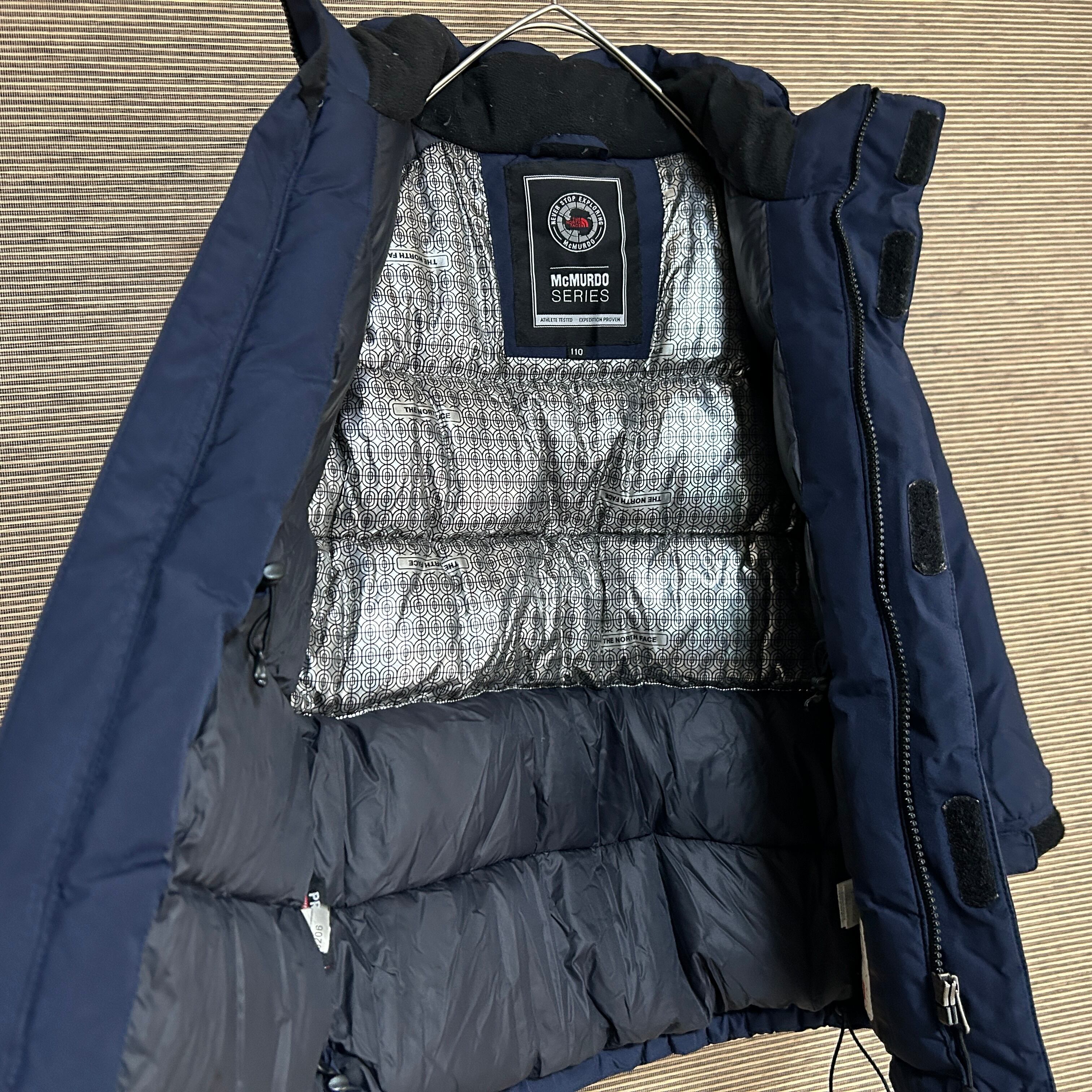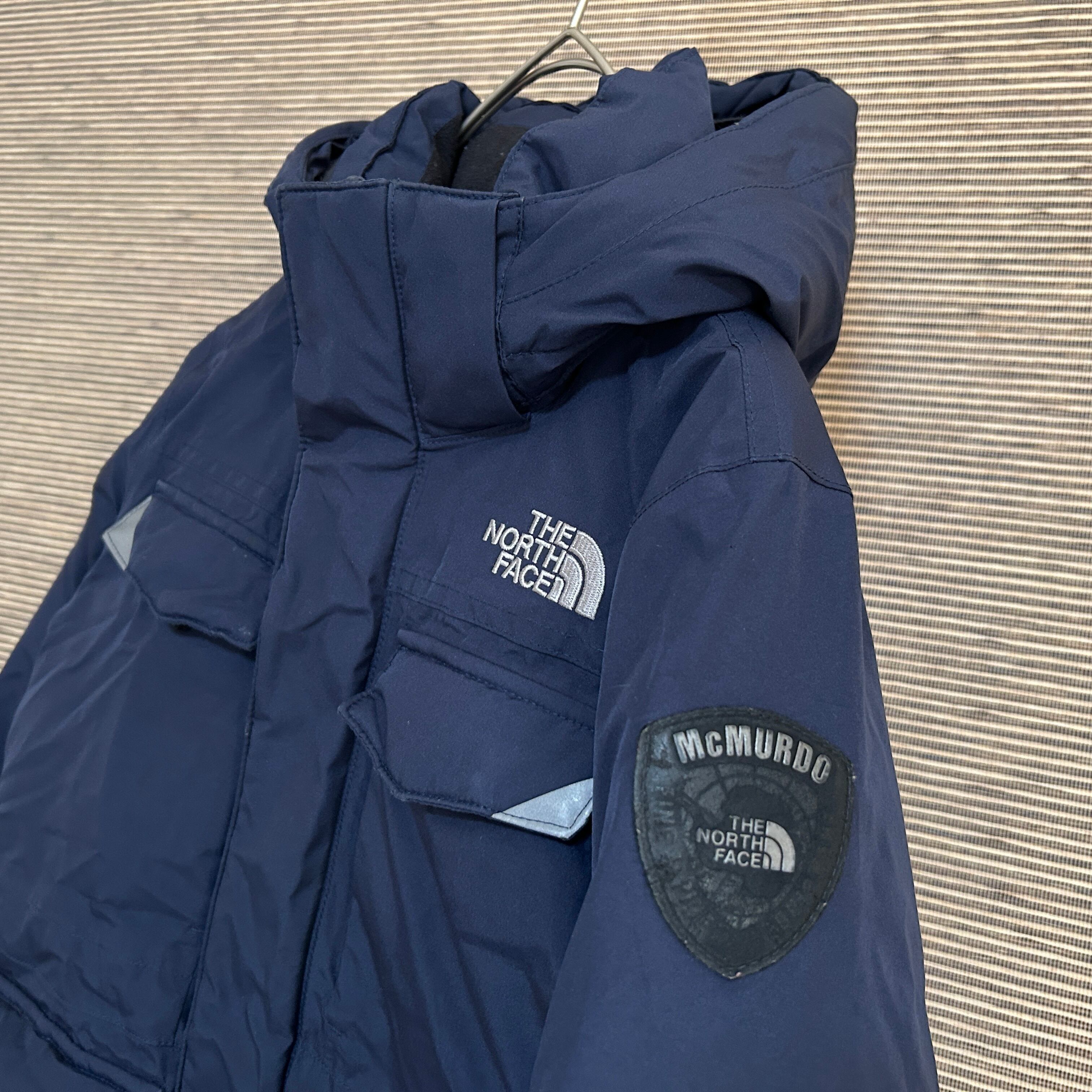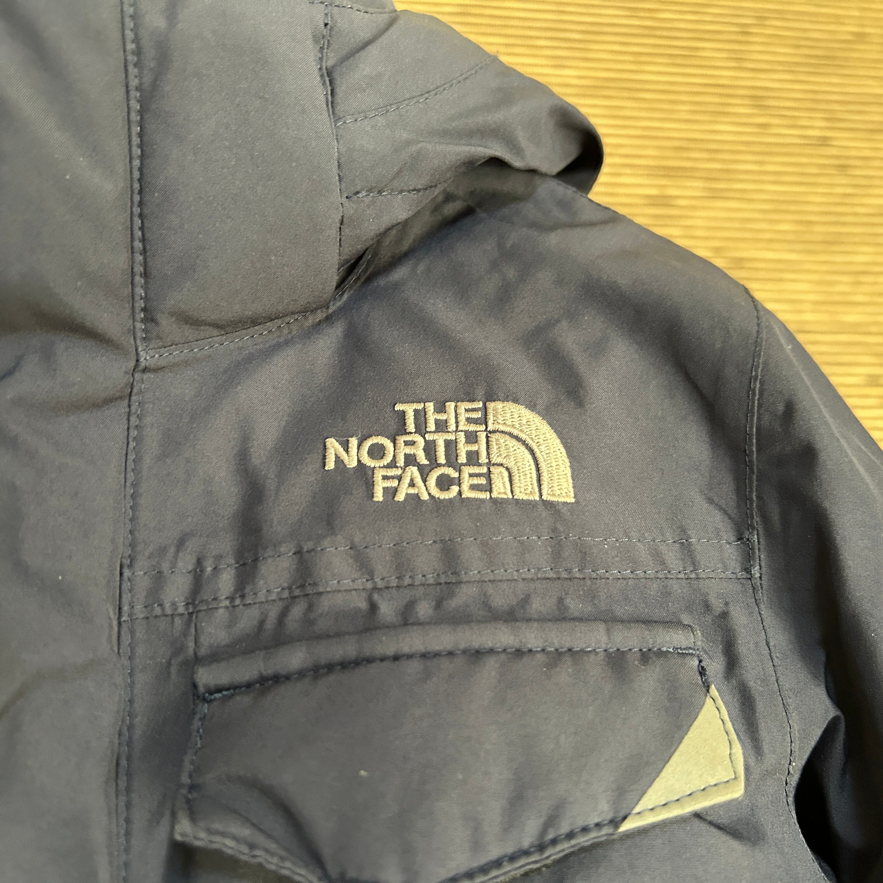ノースフェイス ダウンジャケット マクマード ネイビー子供110刺繍ゴアF2 古着 ワンポイントロゴ キッズ 肩ロゴ