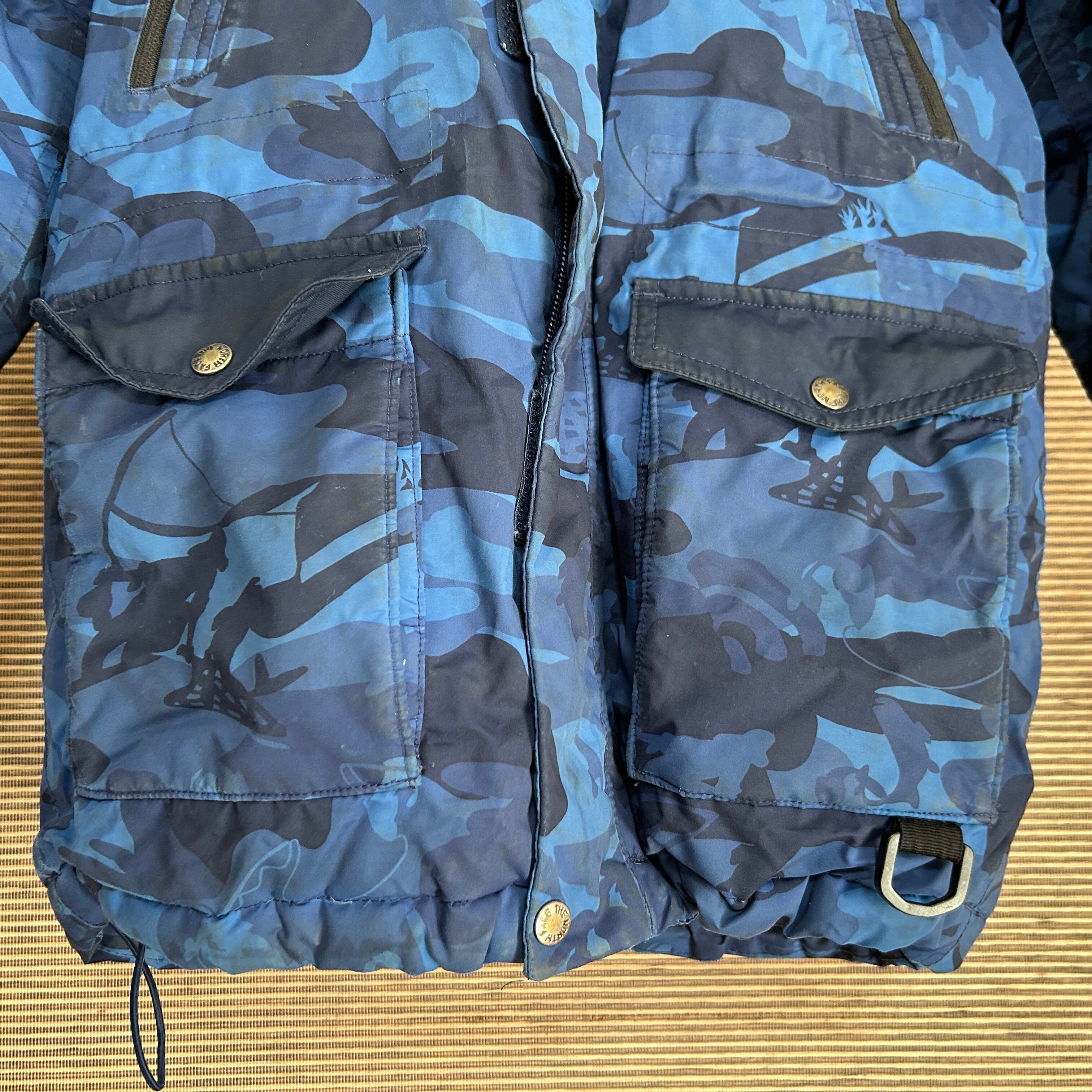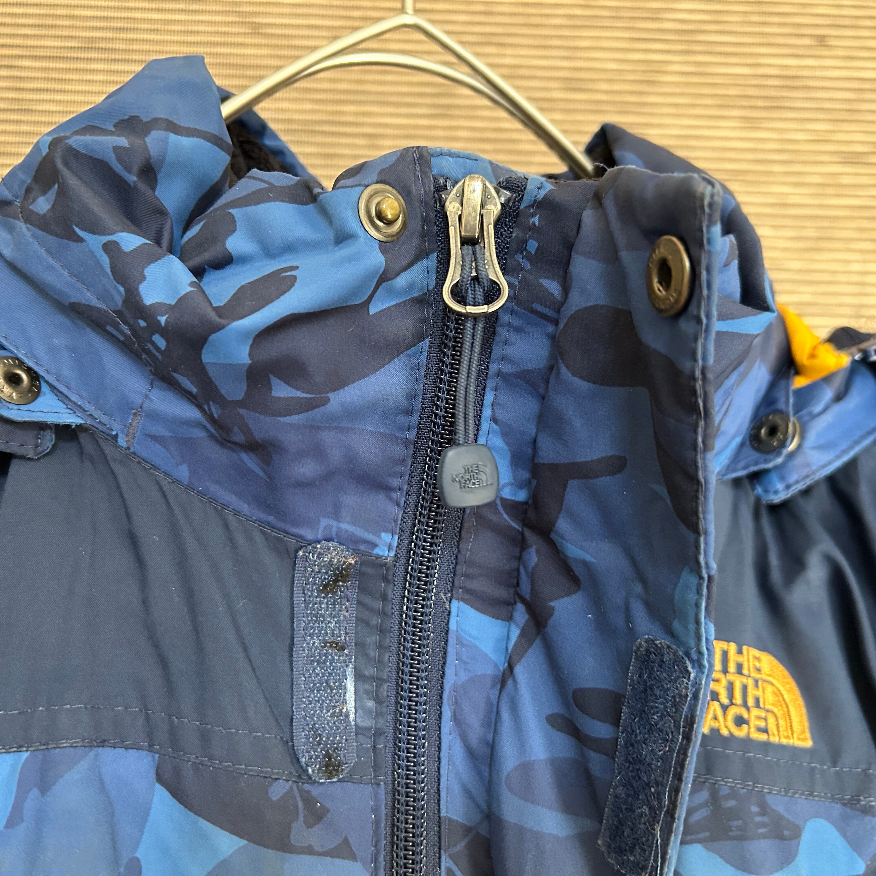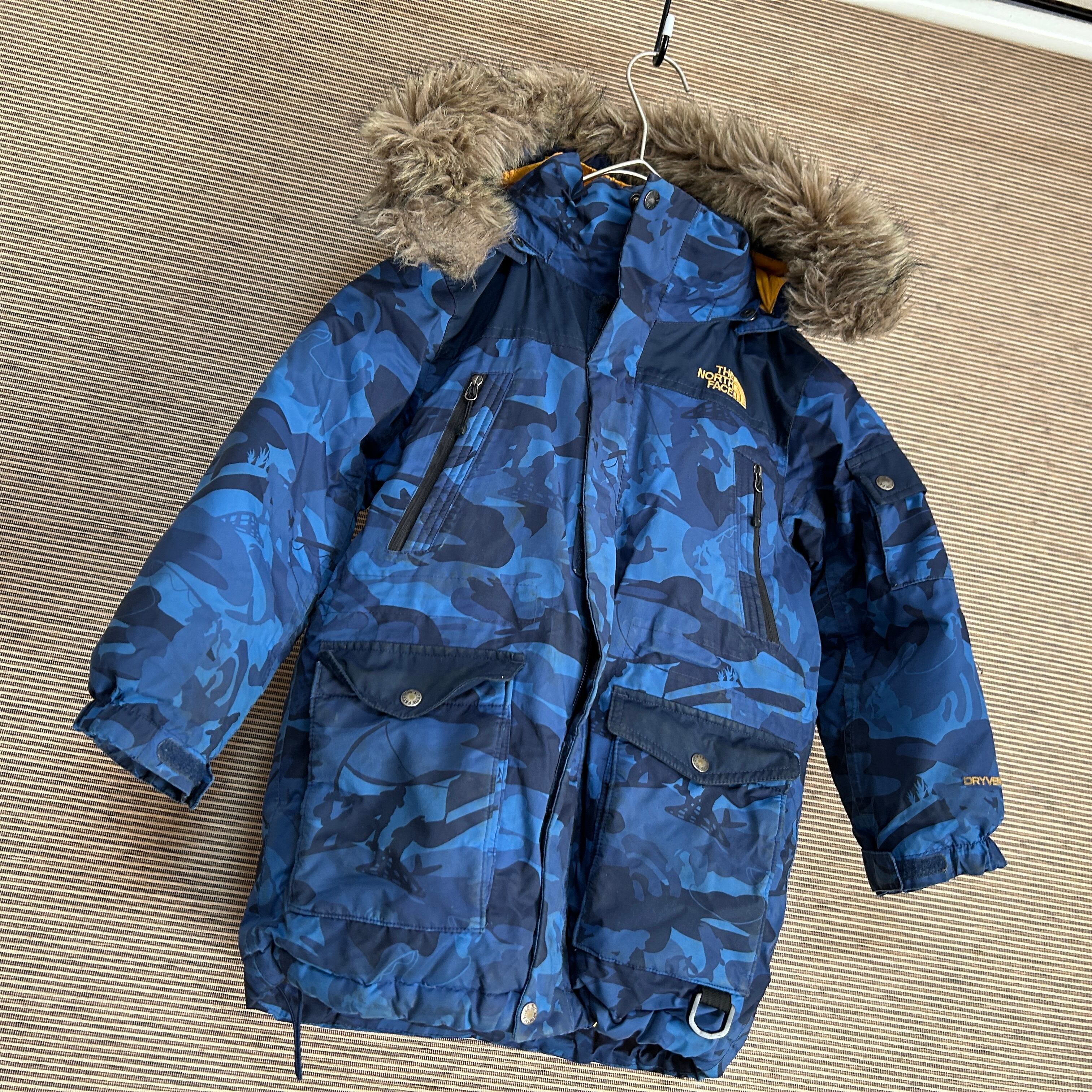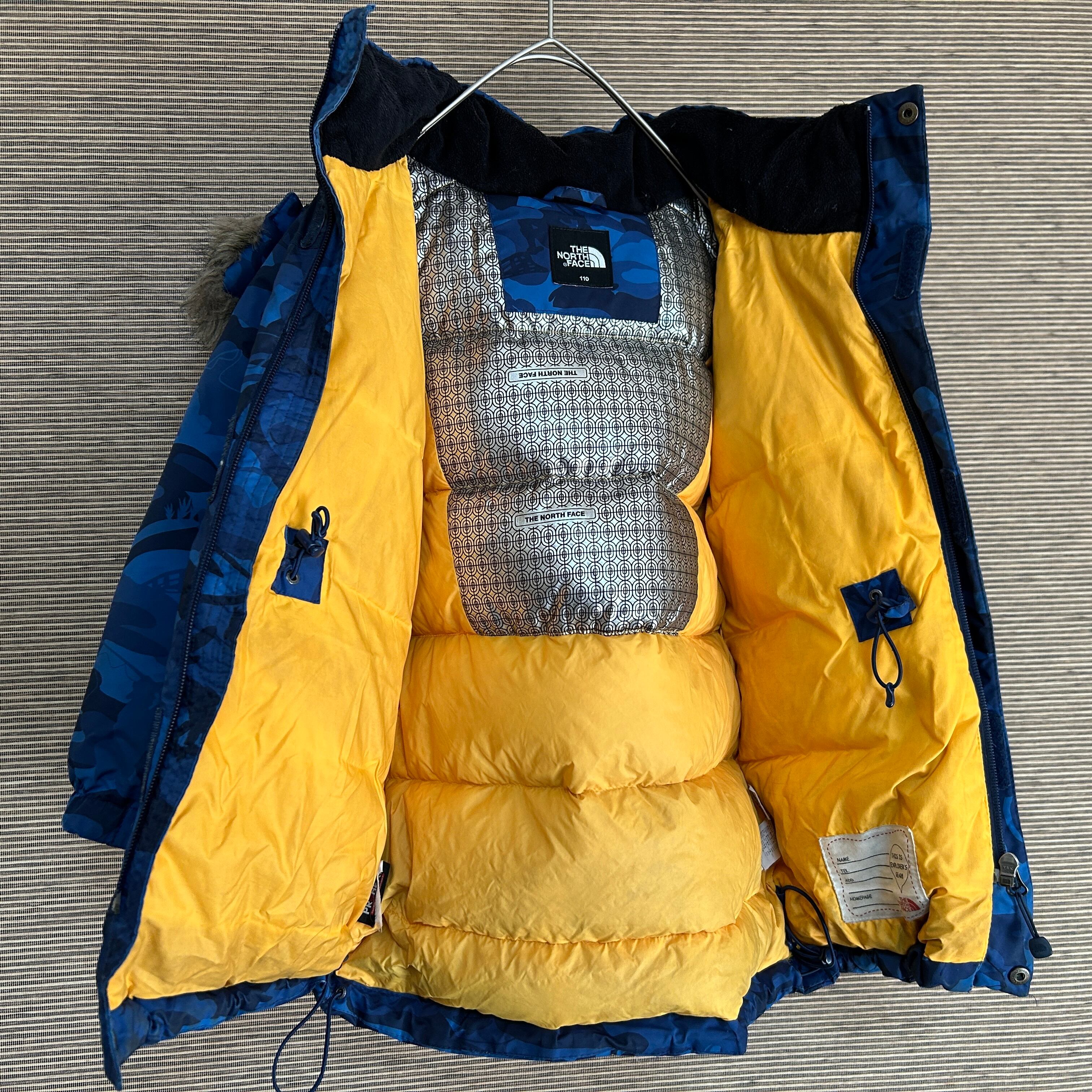 ノースフェイス ダウンジャケット 総柄 子供110 ネイビー 迷彩カモフラF2 古着 キッズ フィッシング フェイクファー