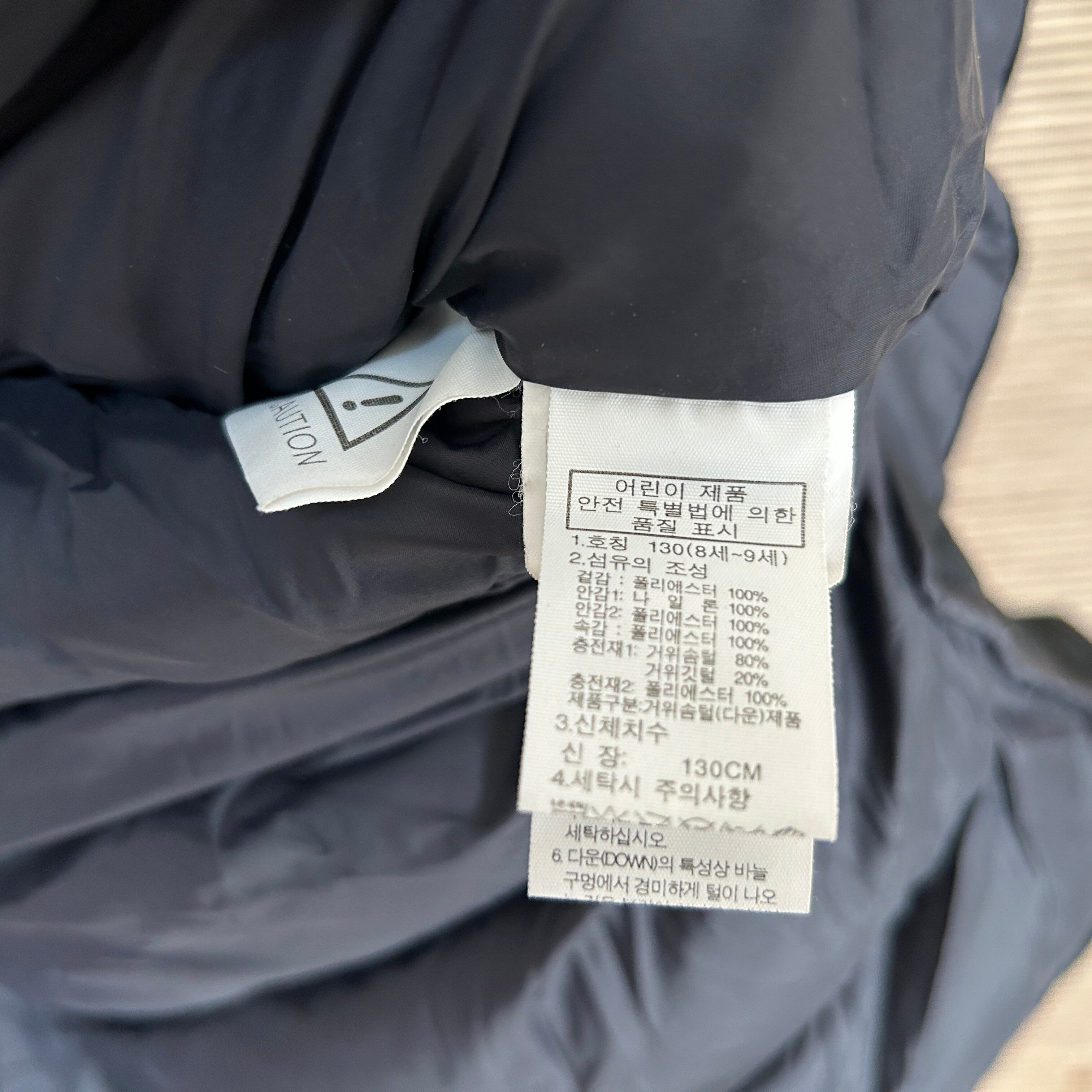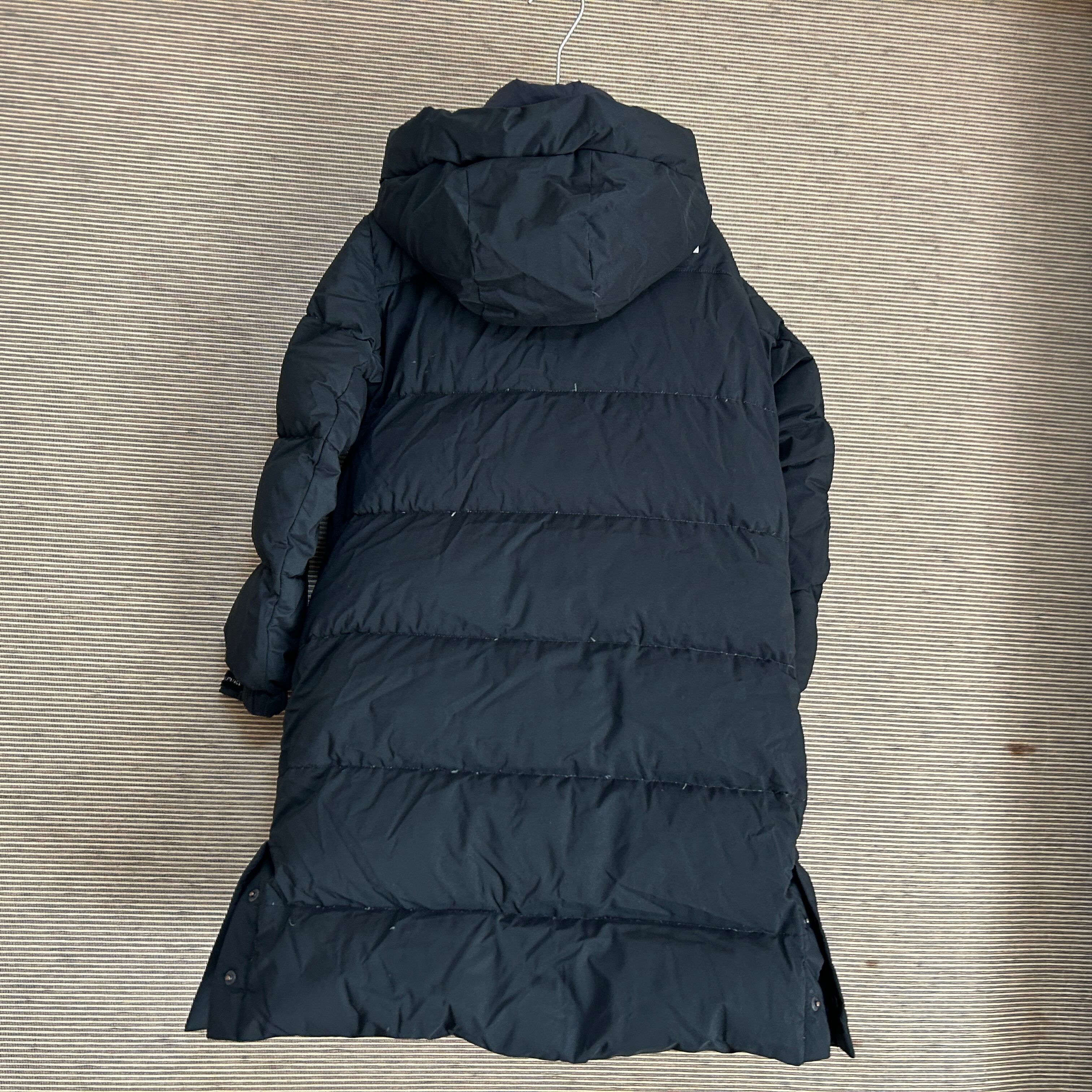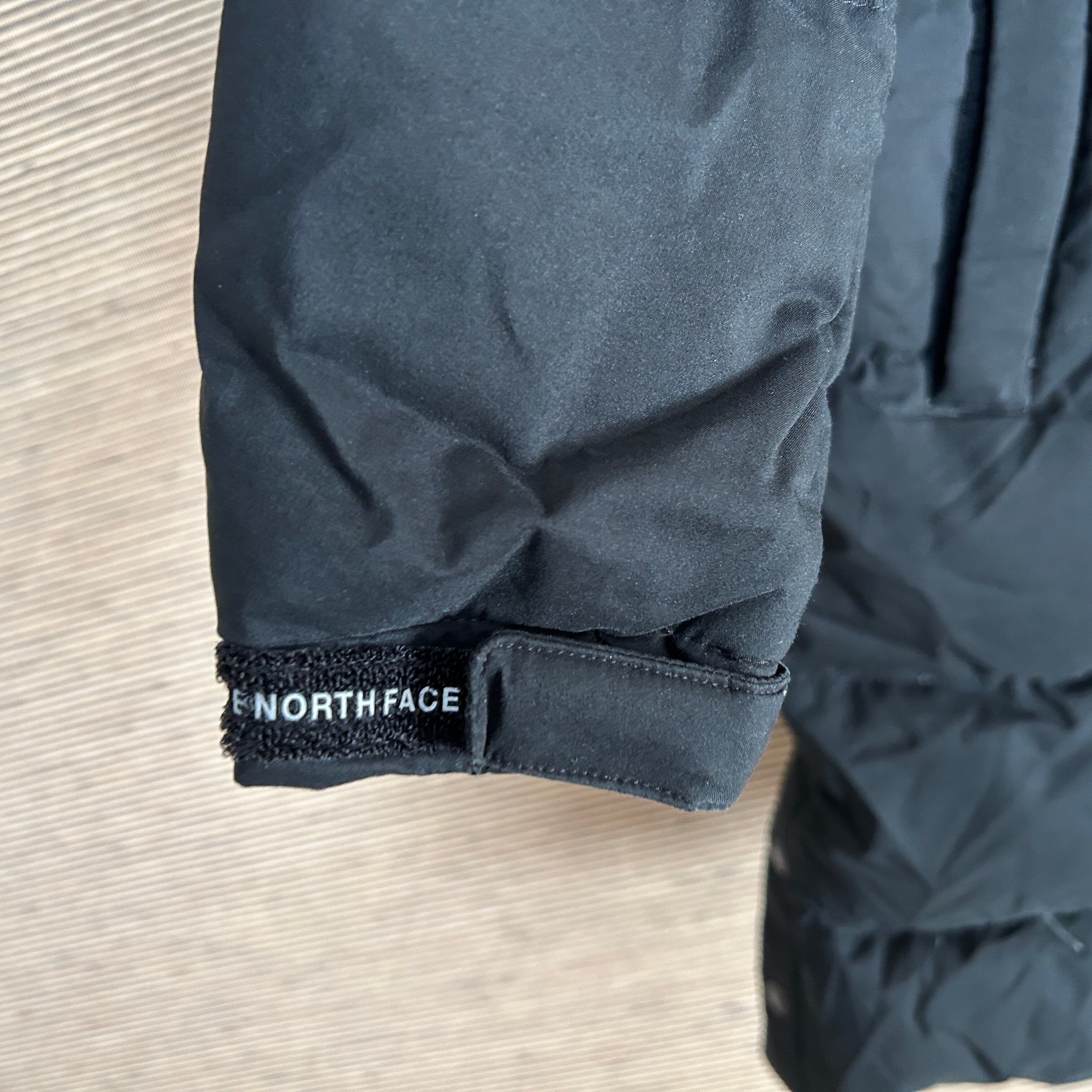 ノースフェイス ロングダウンコート ベンチコート ブラック子供130キッズF3 古着 ワンポイントロゴ 人気