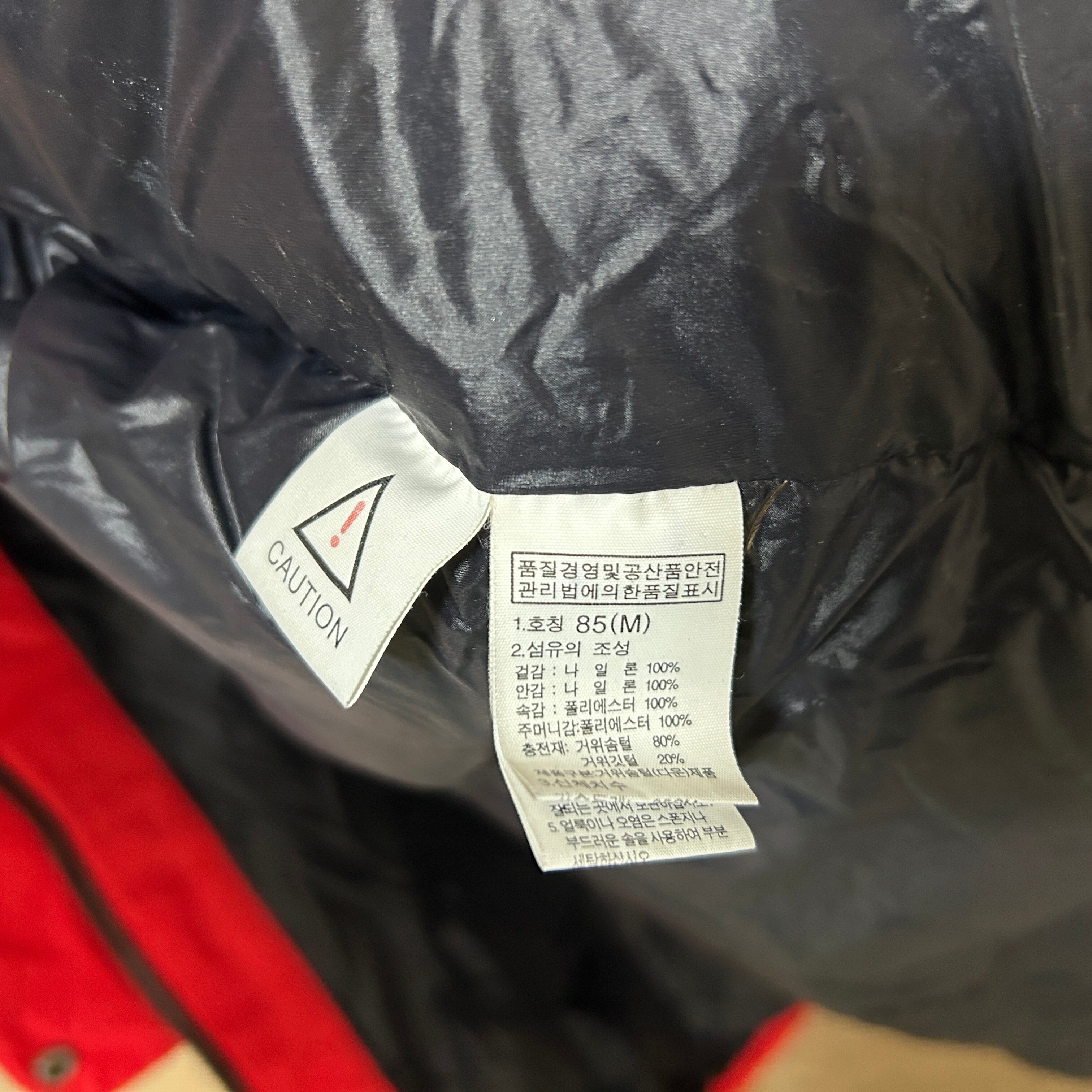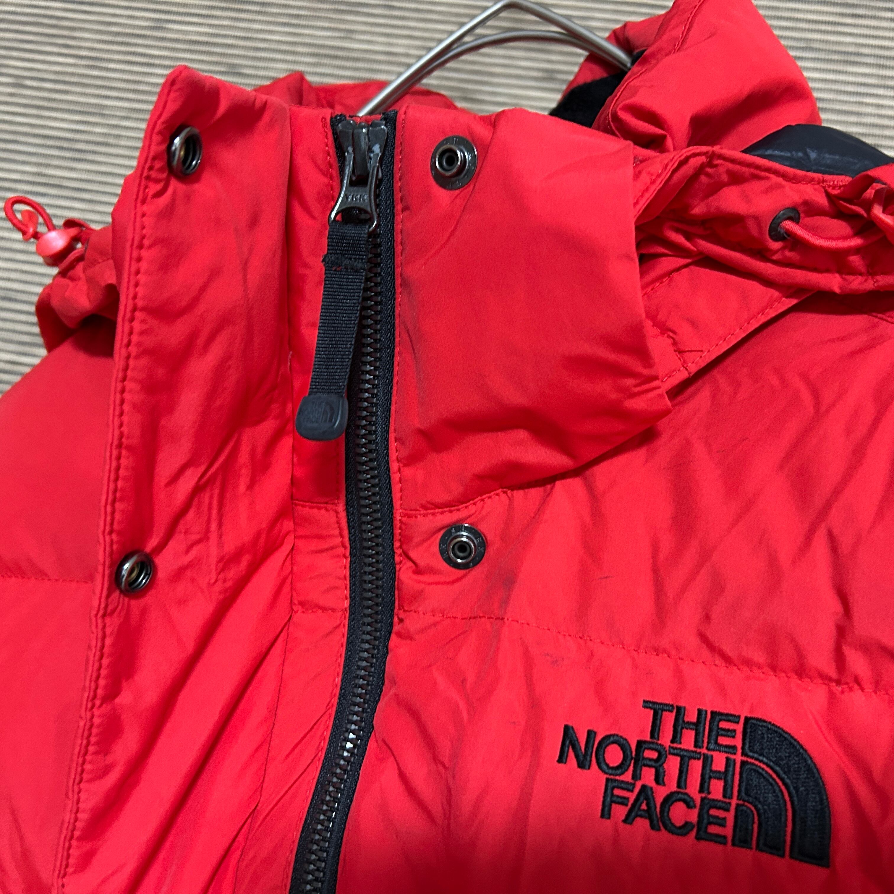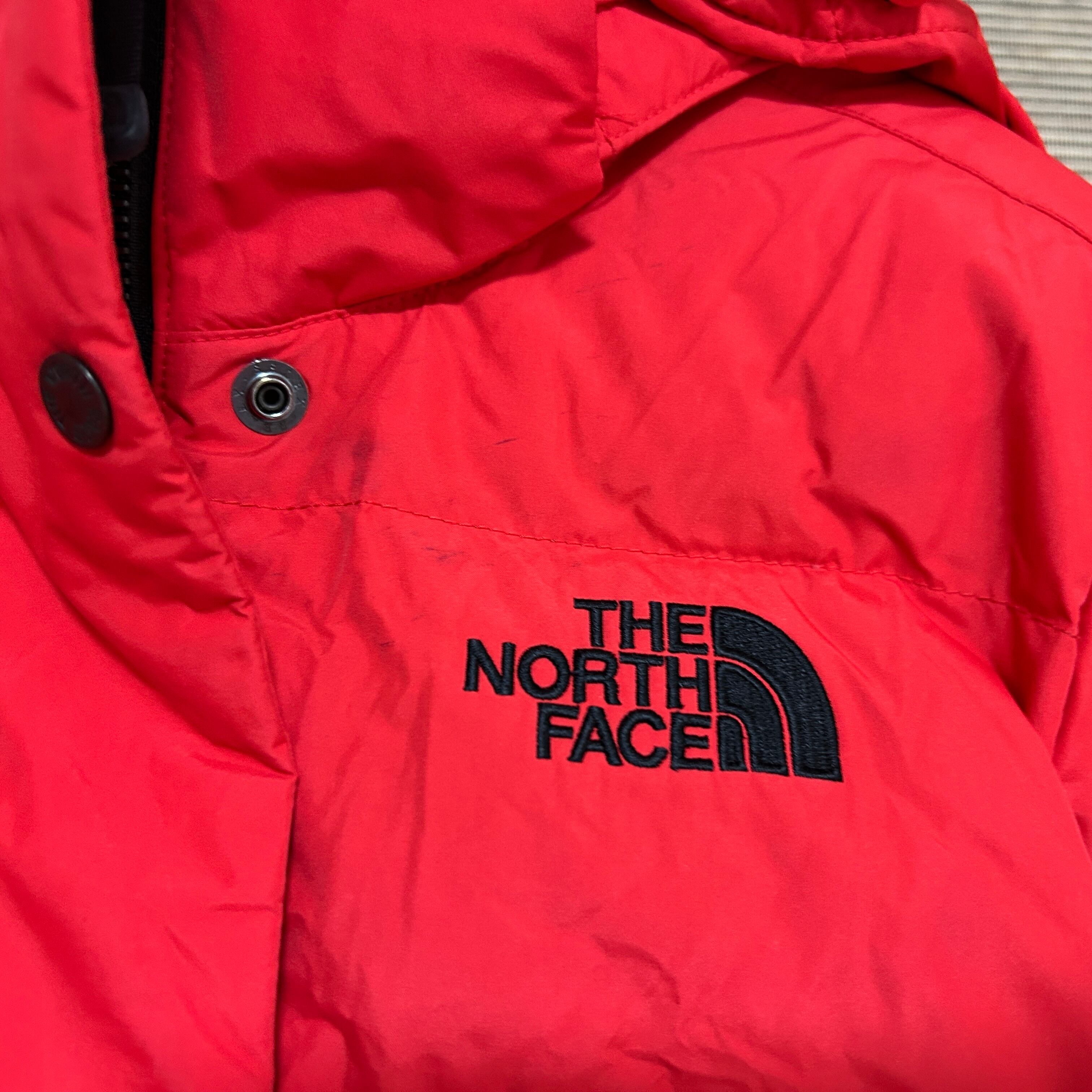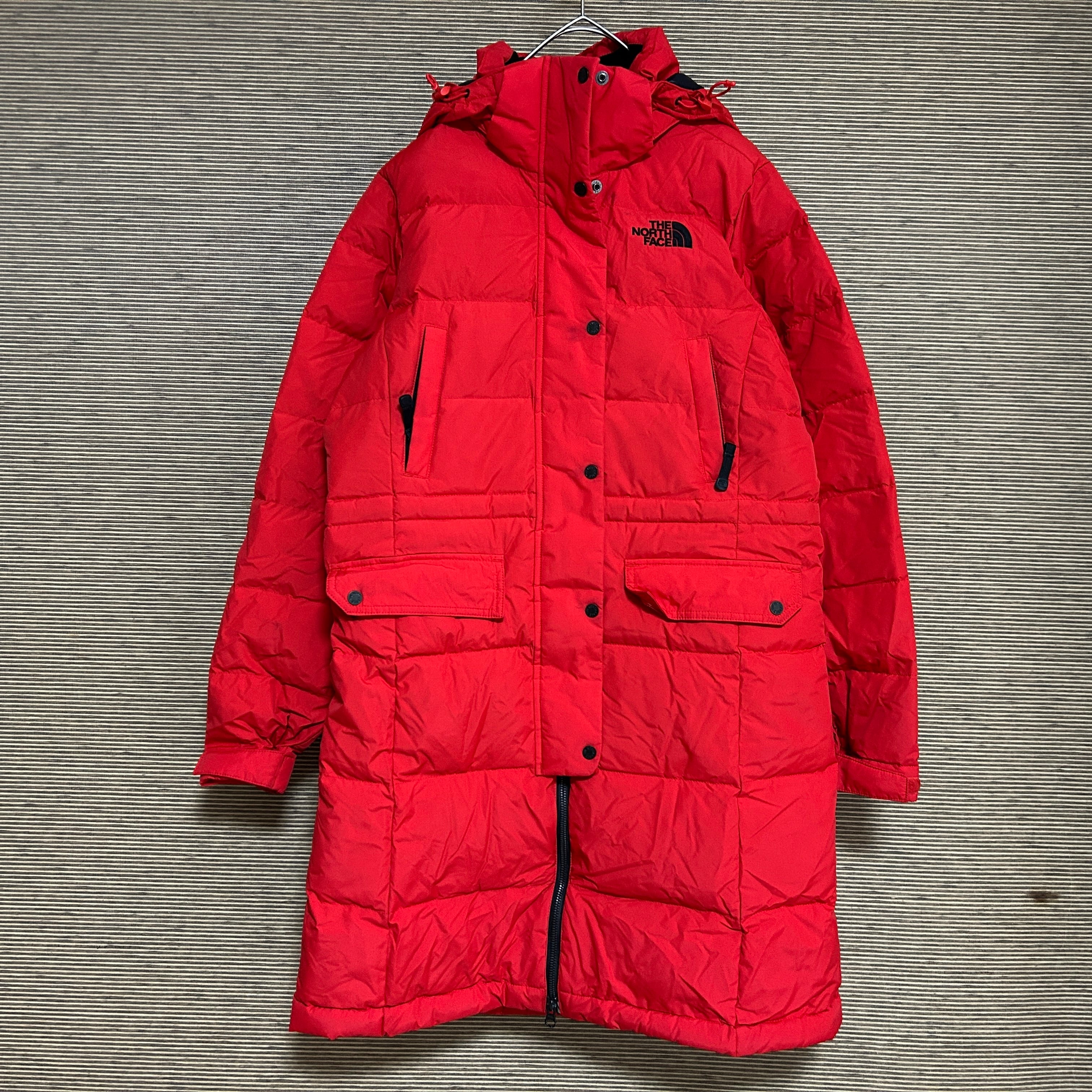 ノースフェイス ロングダウンコート 赤 刺繍 レッド ワンポイントロゴE4 古着 レディース