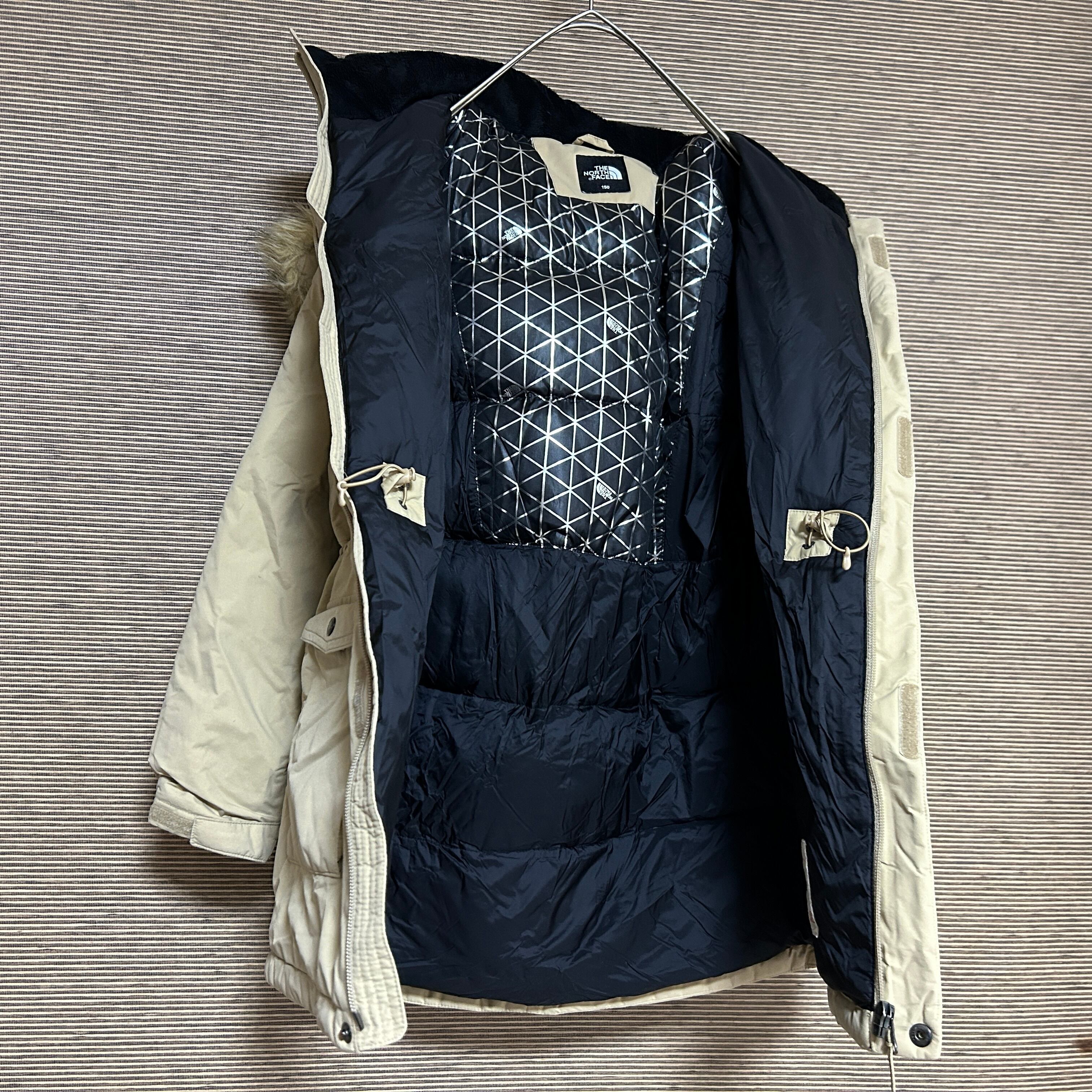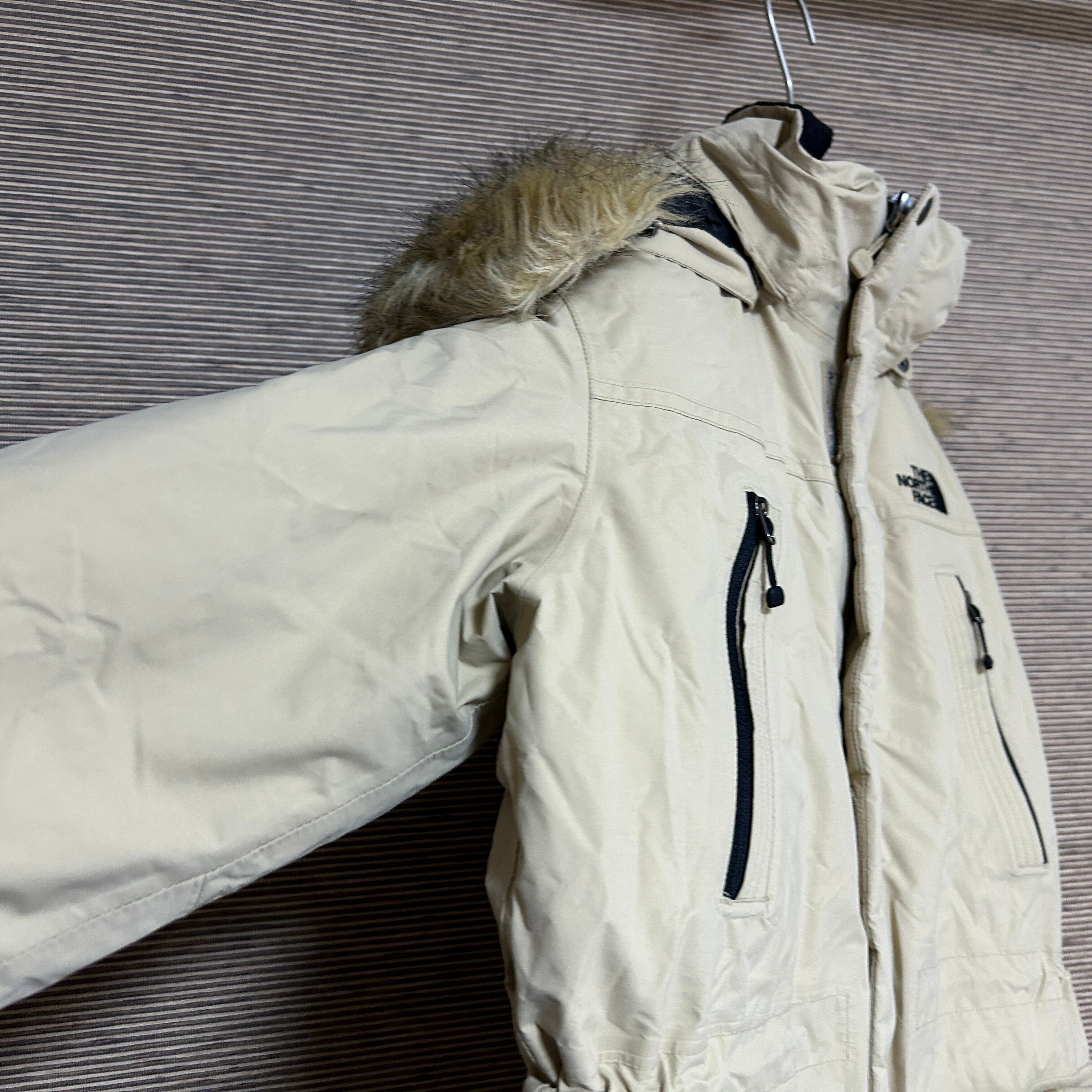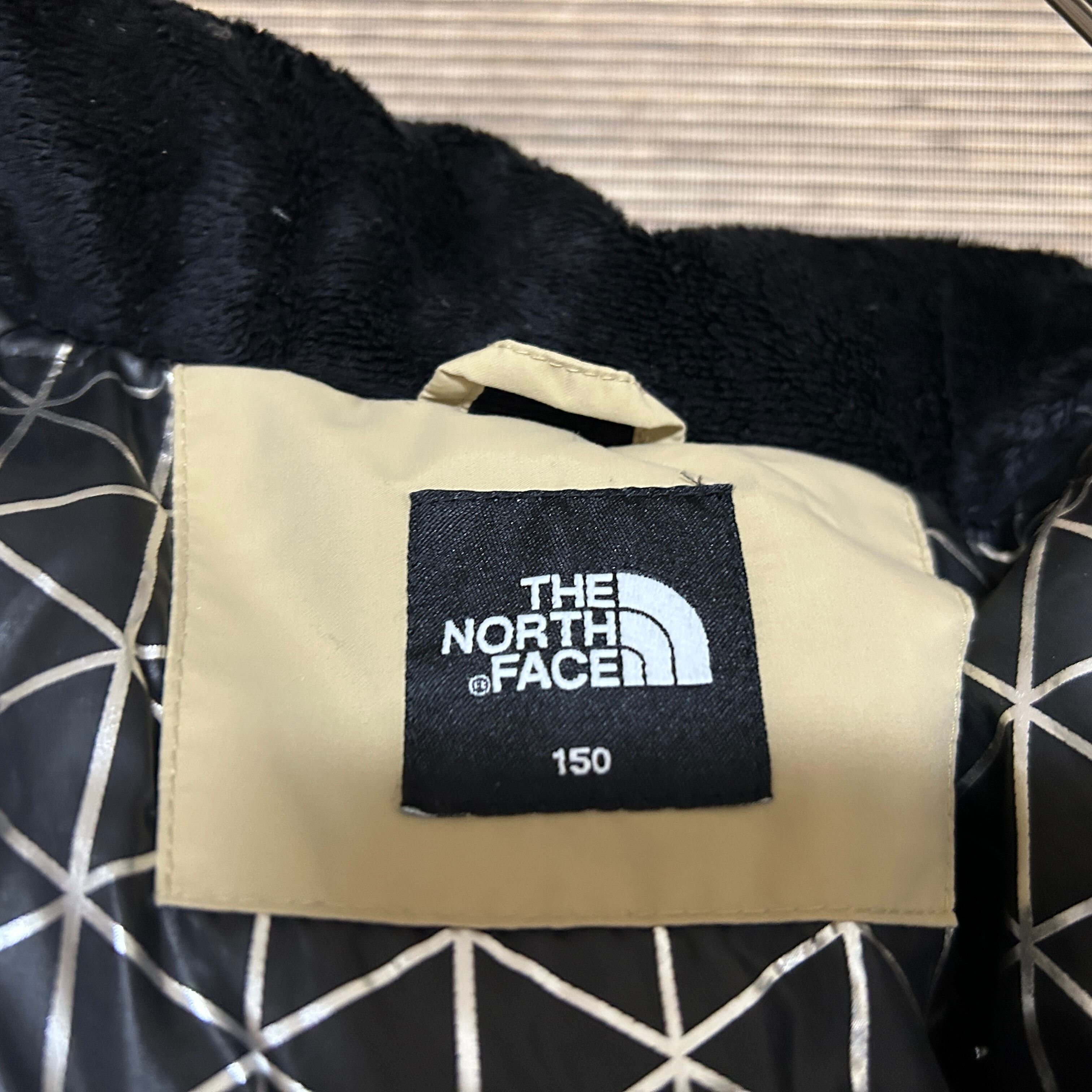 ノースフェイス ダウンジャケット モッズコート ベージュ子供150フェイクファーE4 古着 キッズ ワンポイントロゴ ドライベント