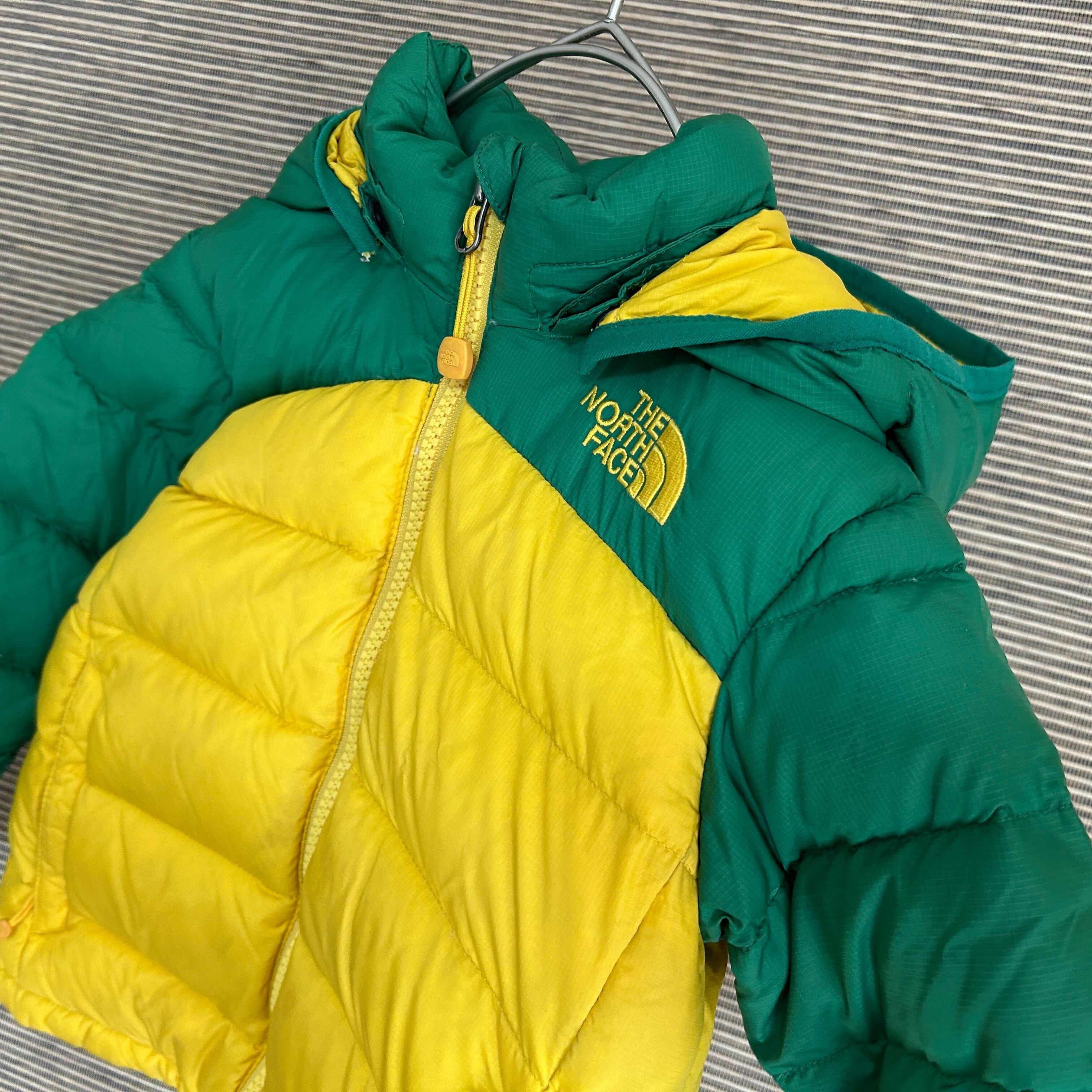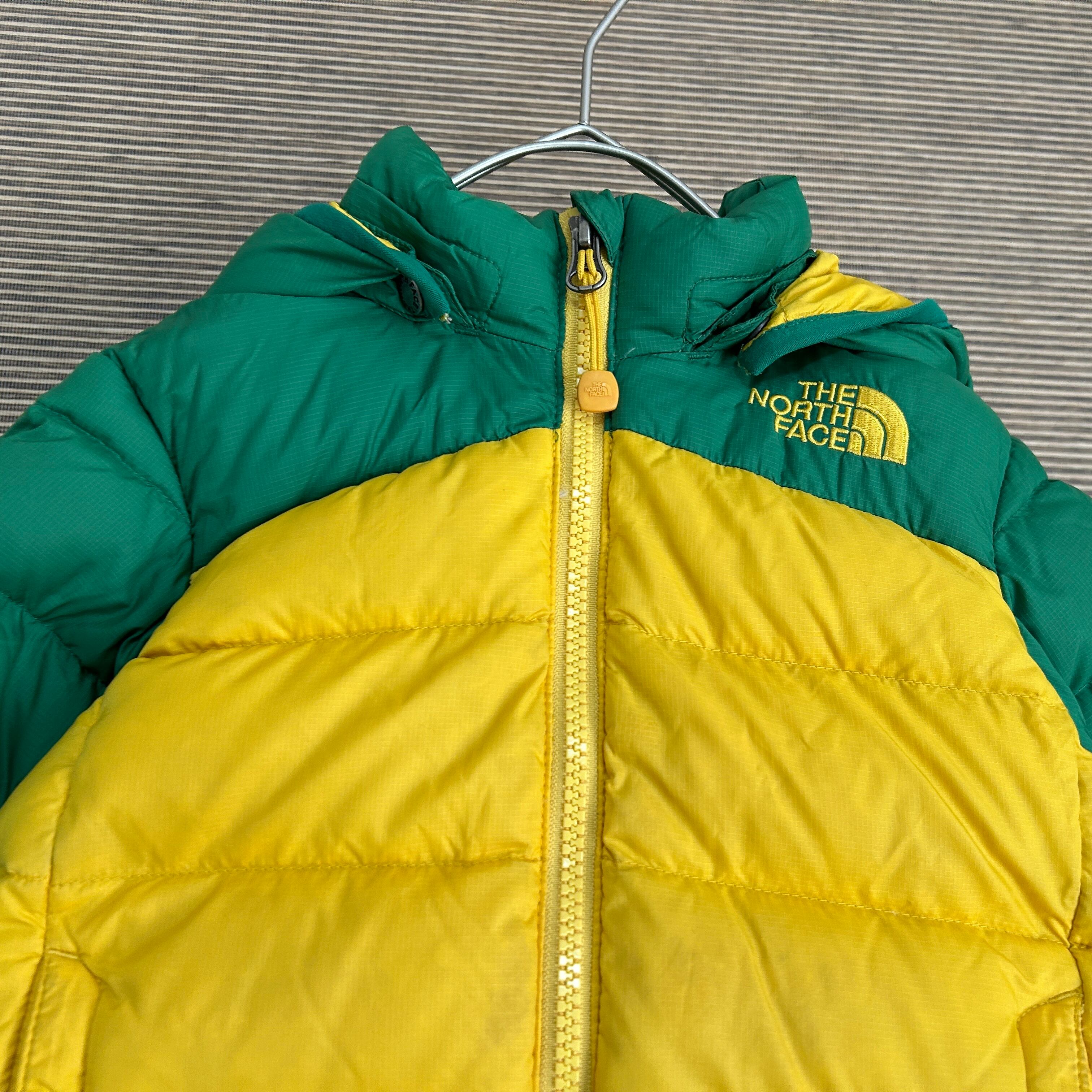 ノースフェイス ダウンジャケット 子供100キッズ グリーン黄色 刺繍 E2 古着 ワンポイントロゴ 600fil