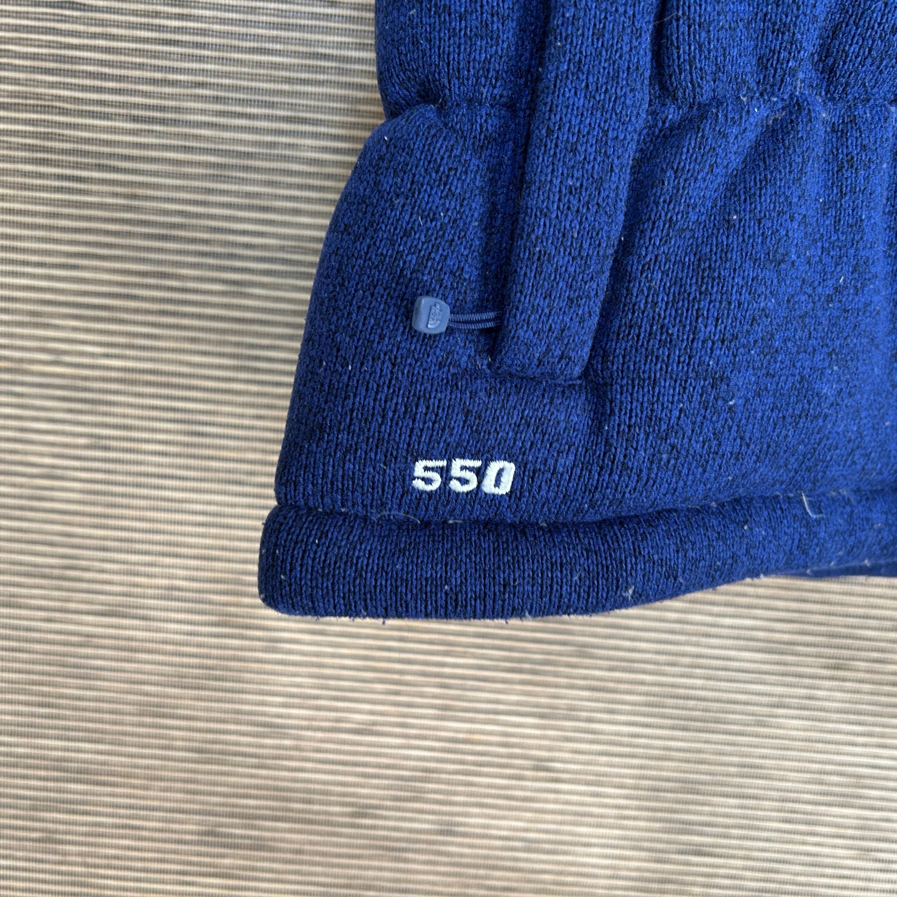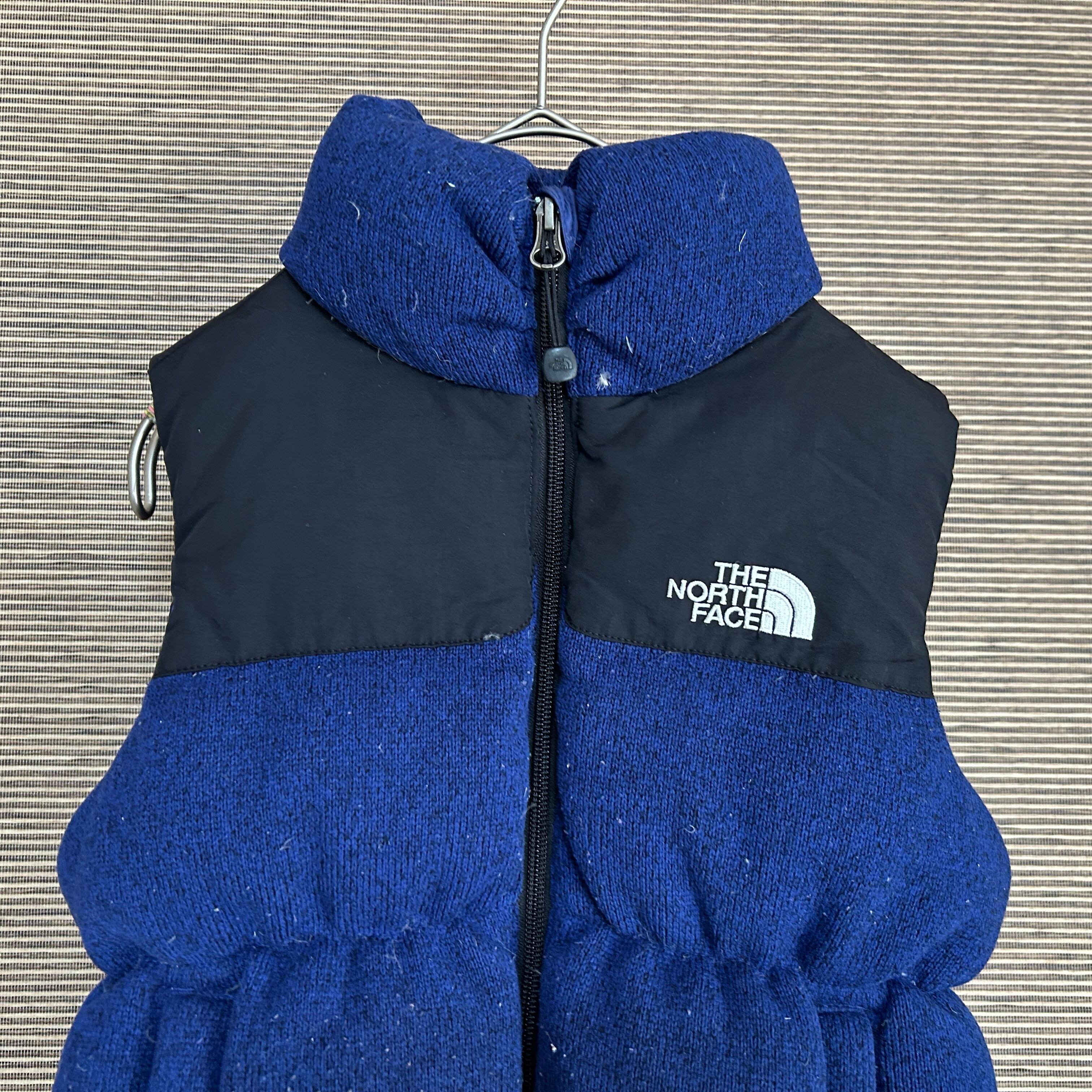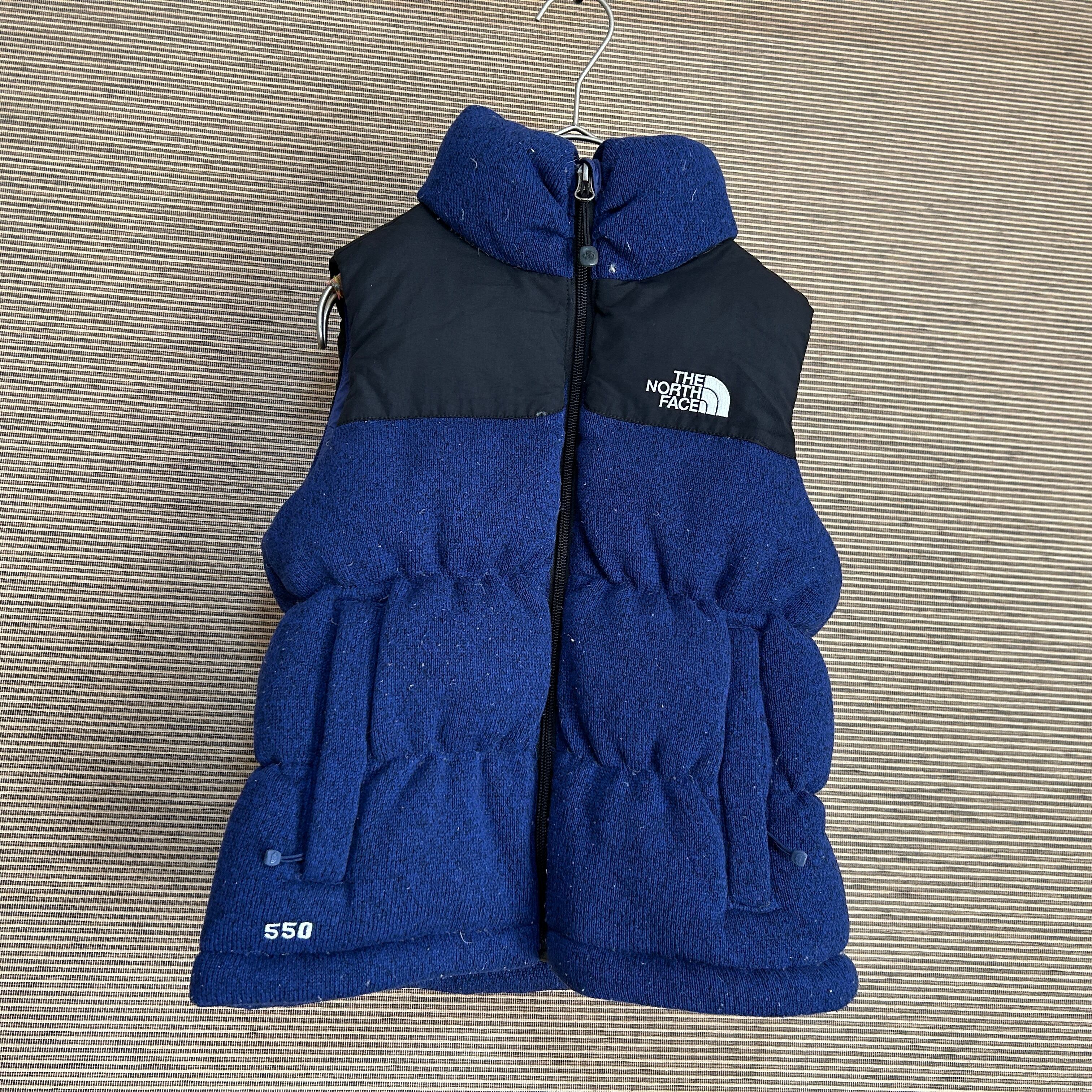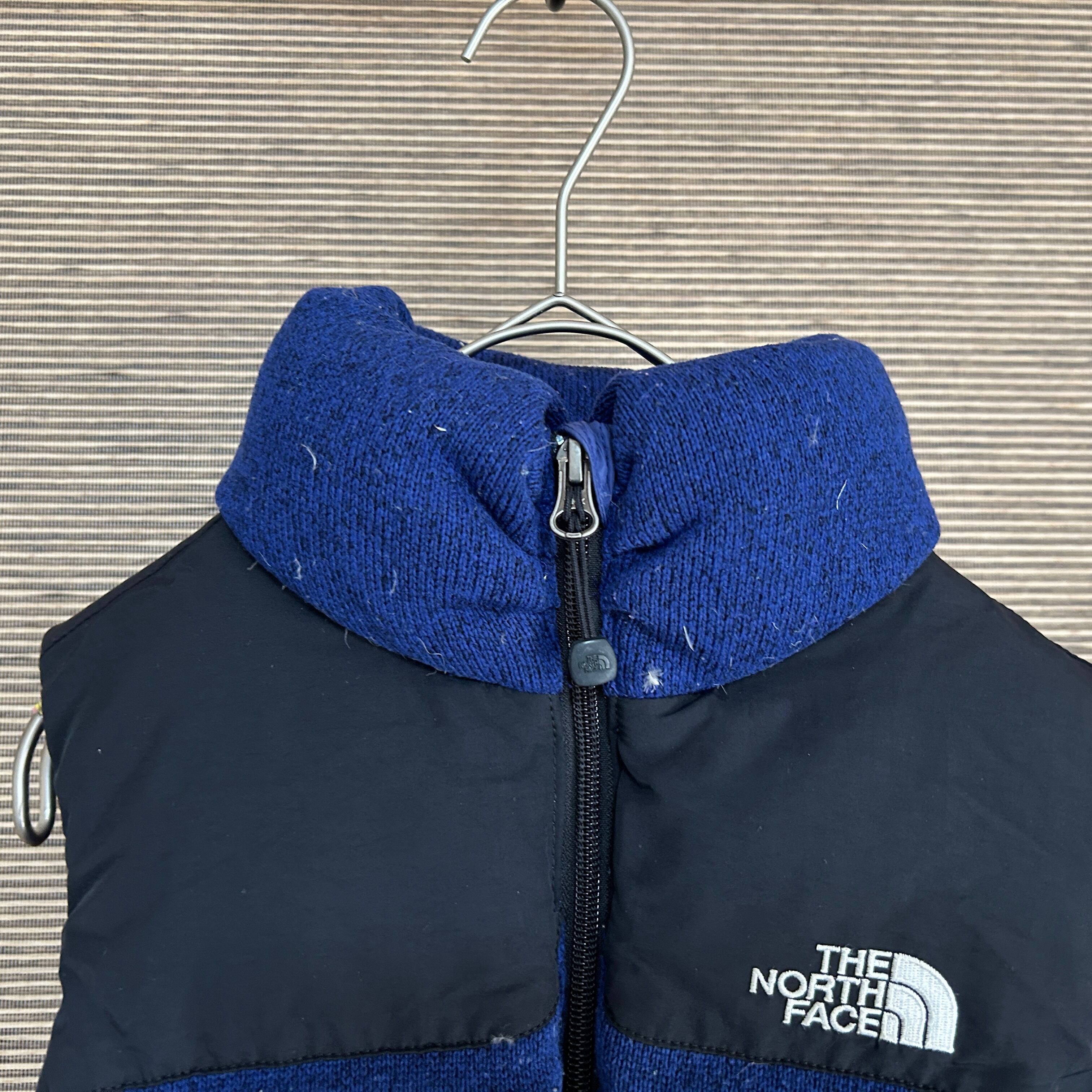 ノースフェイス ブルームニットダウンベスト ネイビー黒 子供120キッズE1 古着 ワンポイントロゴ 刺繍