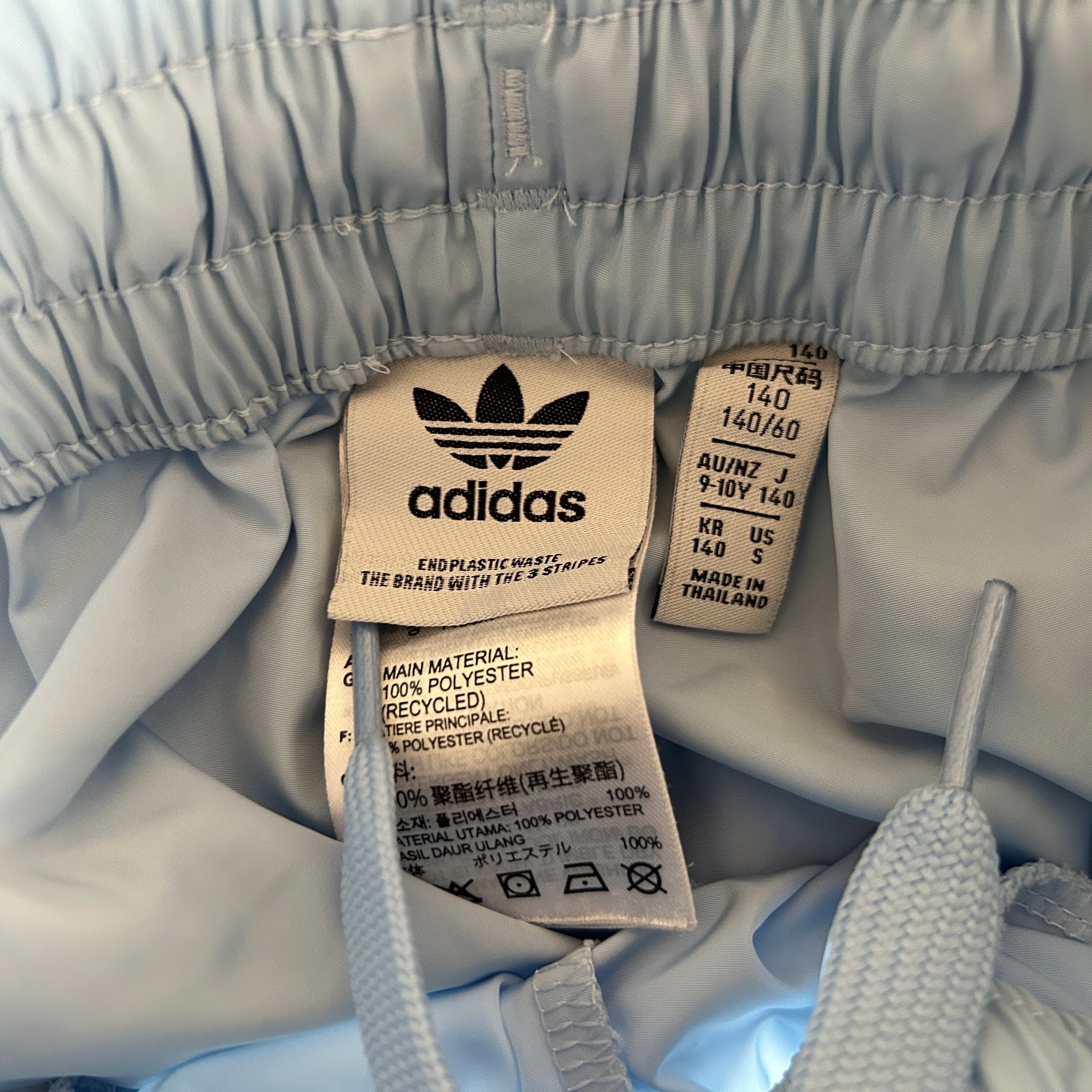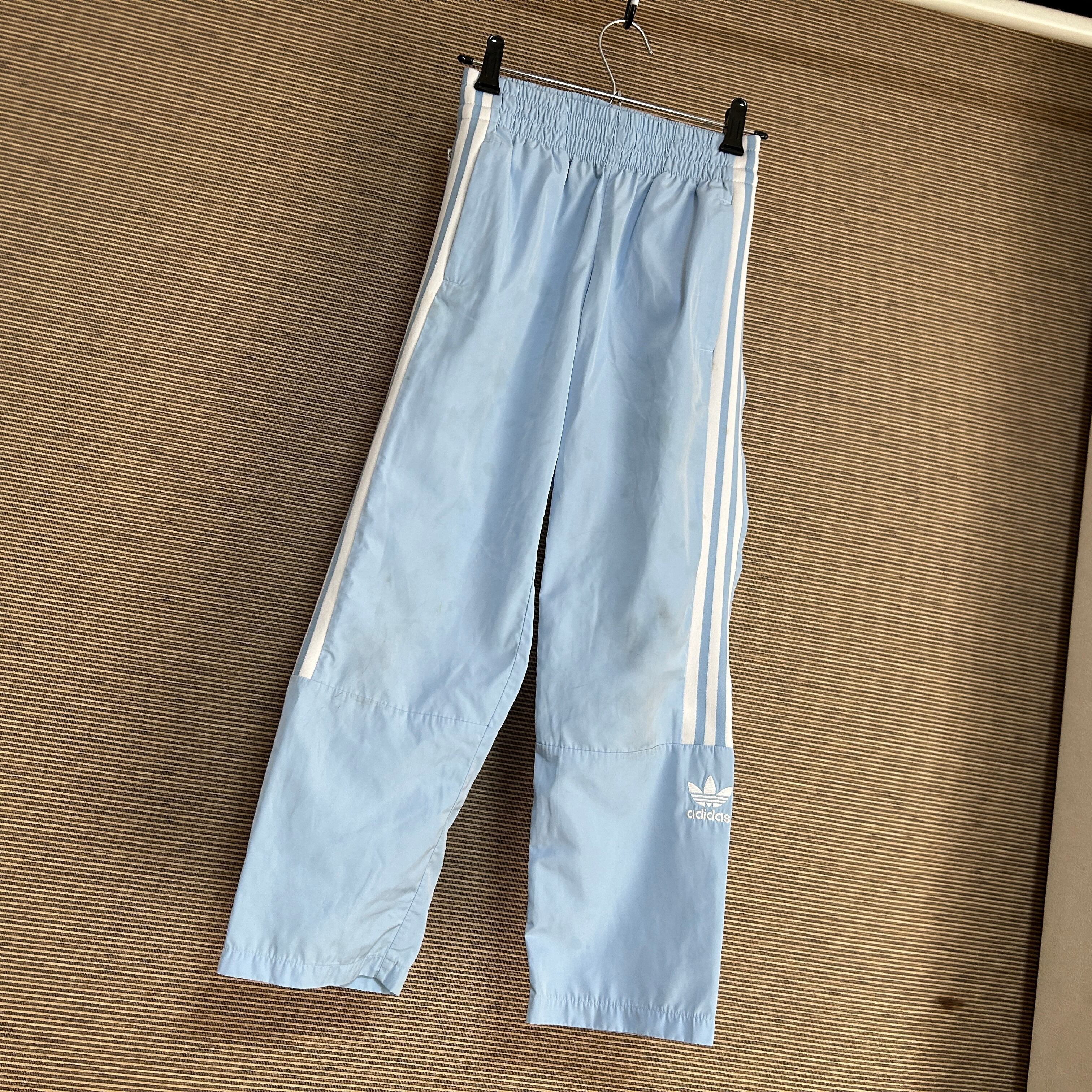 アディダス ナイロンパンツ ピステ 刺繍 子供140トレフォイル 水色J1 古着 キッズ スカイブルー ワンポイントロゴ