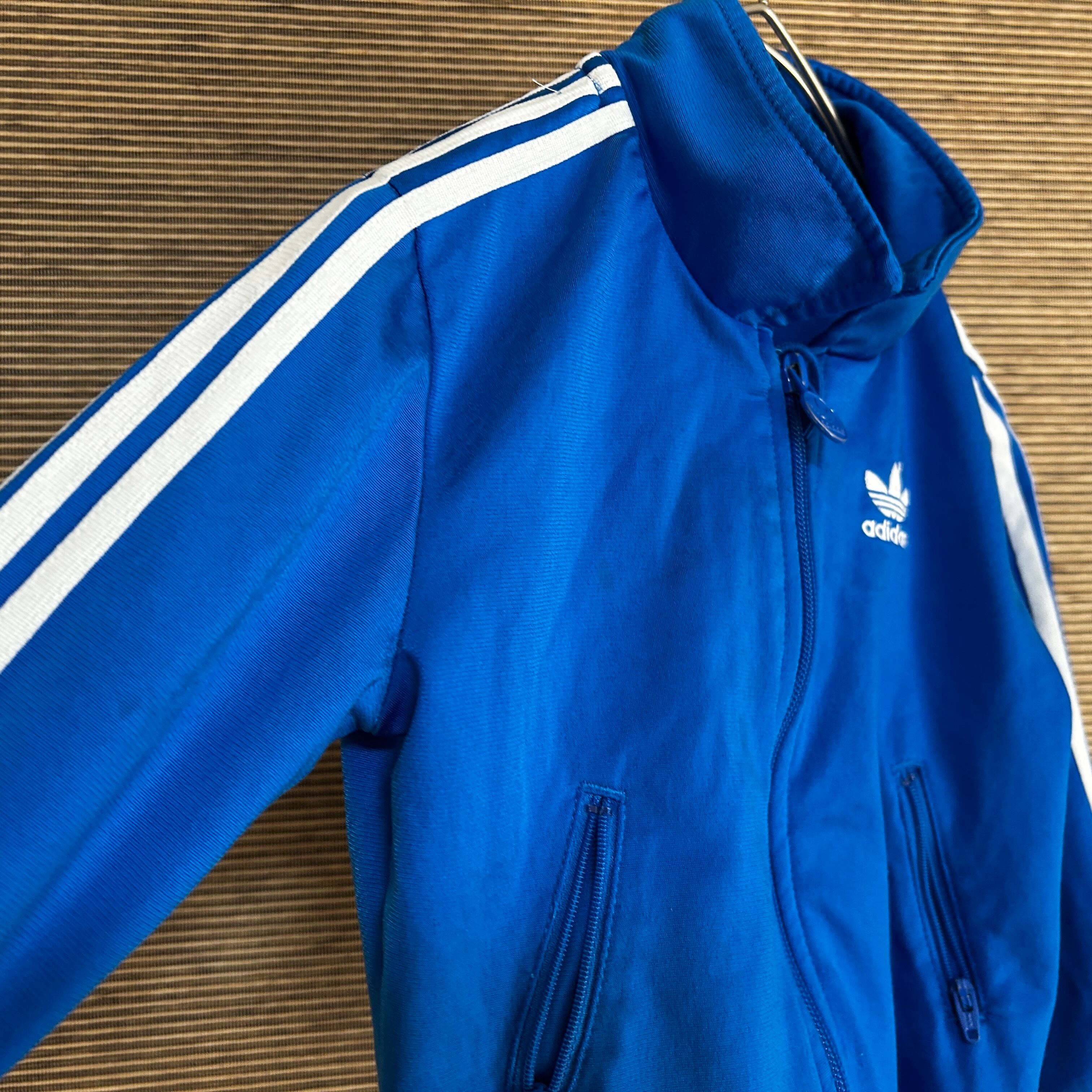 アディダス ジャージトラックジャケット青キッズ85刺繍 ファイヤーバードN 古着 子供 デカロゴ トレフォイル