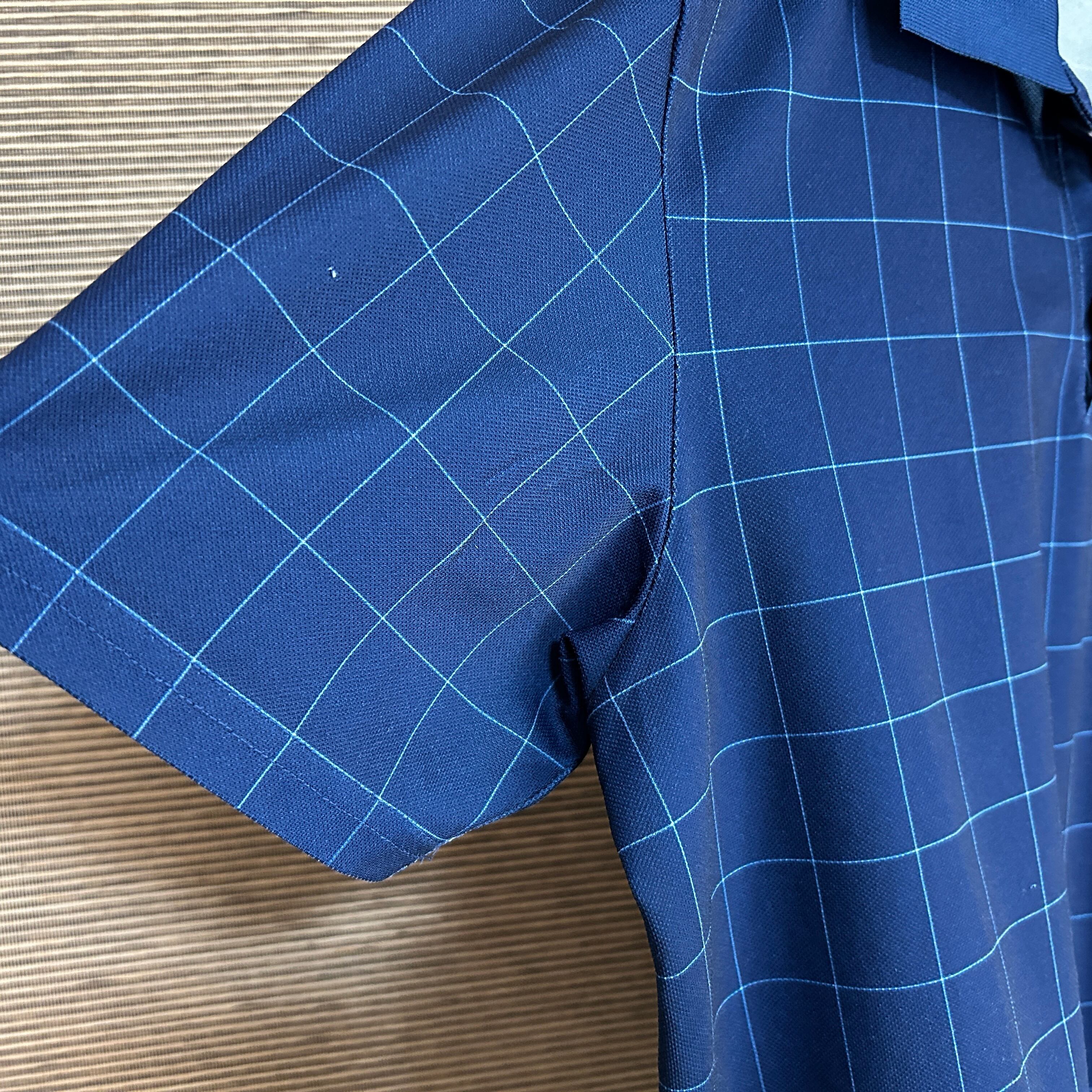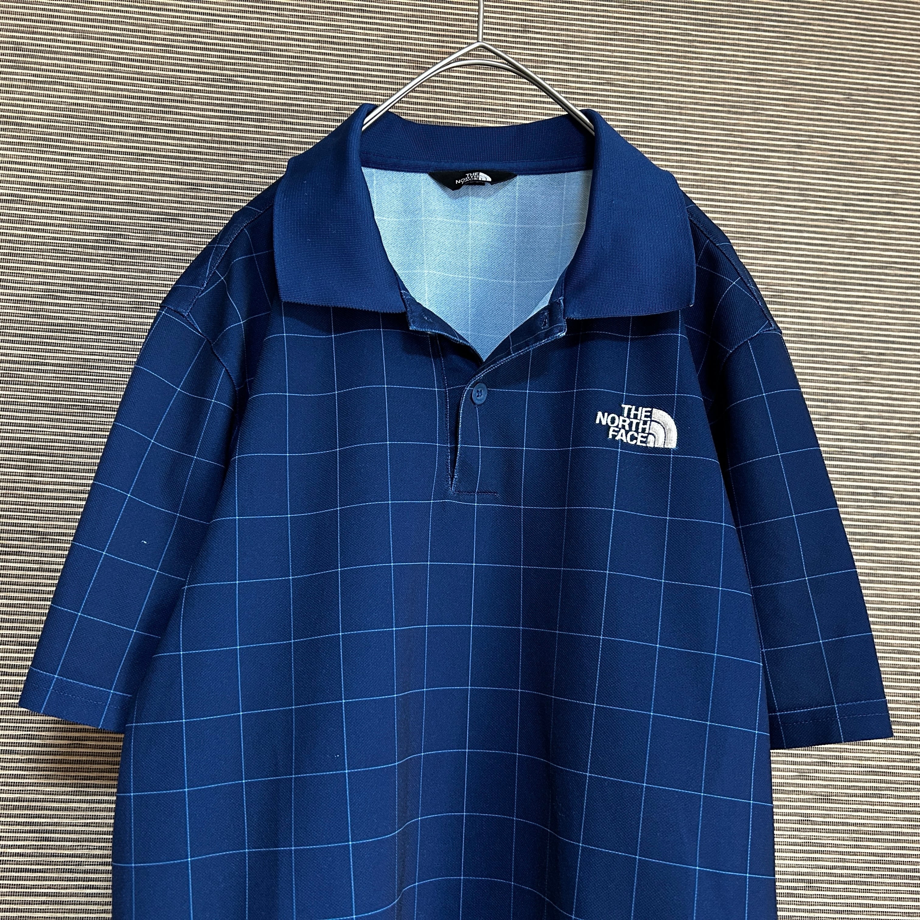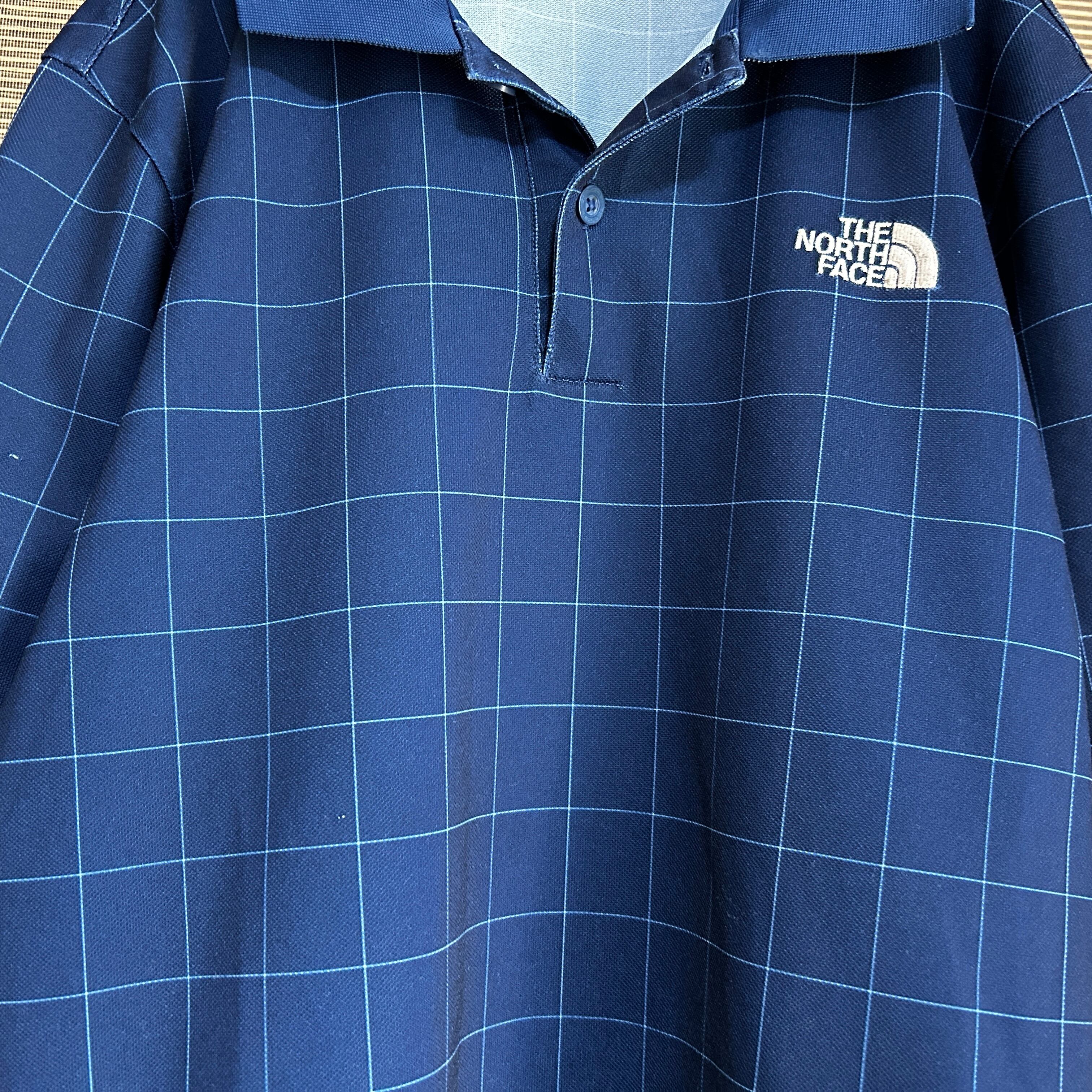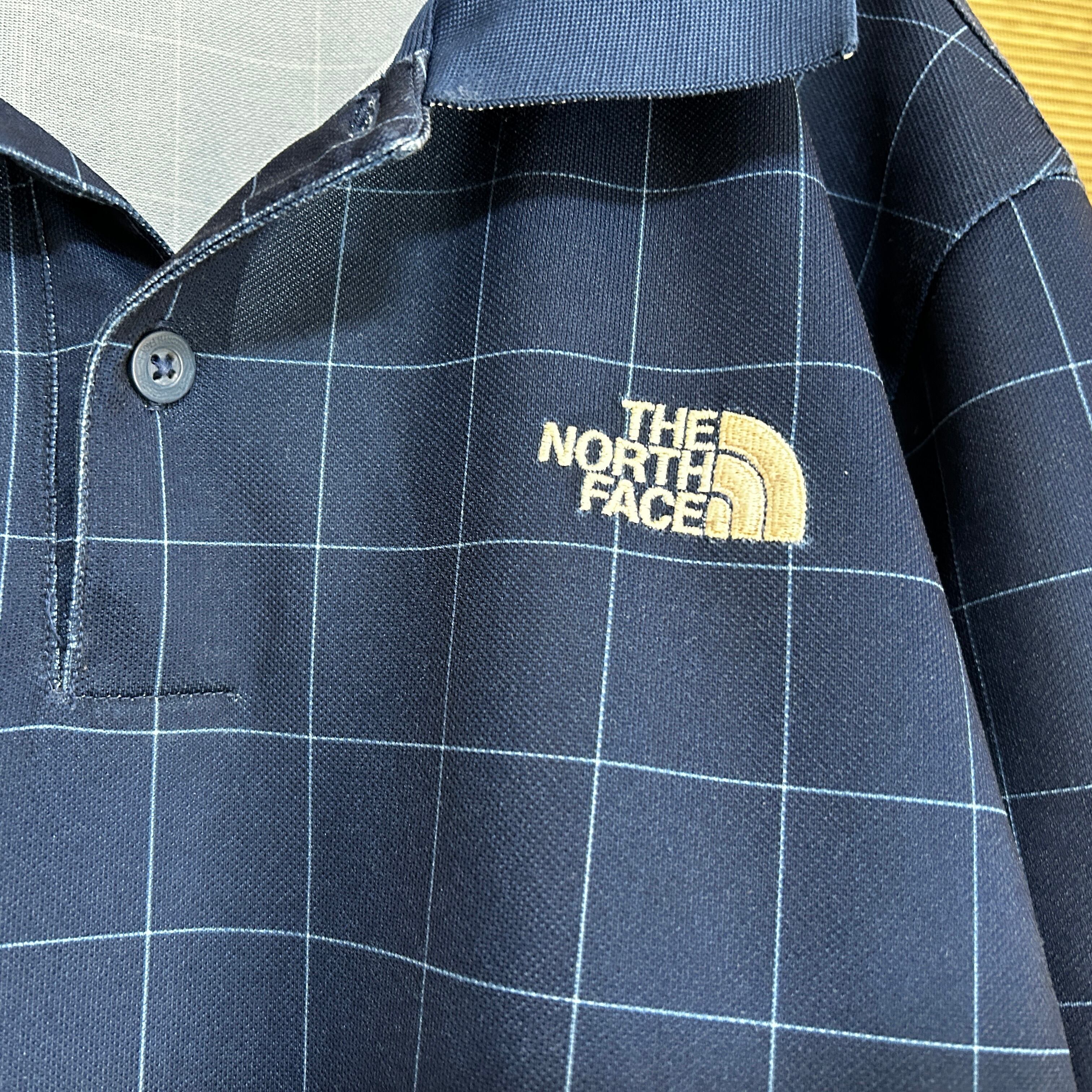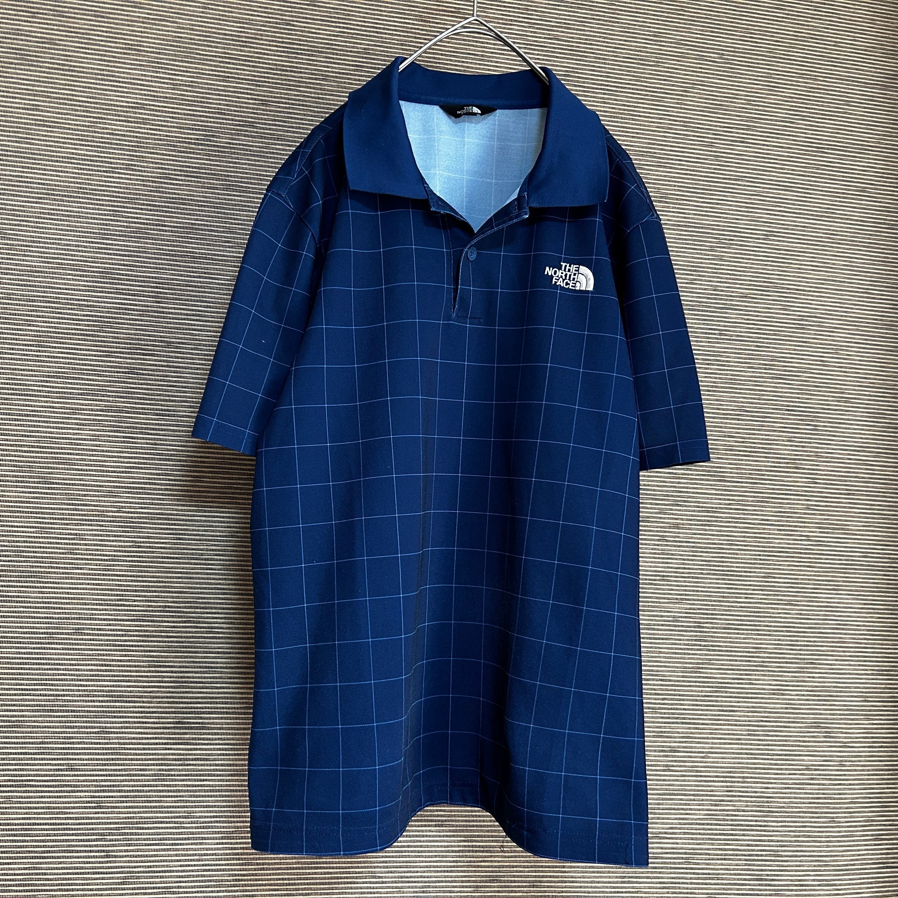 ノースフェイス 半袖ポロシャツ ネイビー 刺繍 速乾ボーダーチェックJ1 古着 ワンポイントロゴ 人気