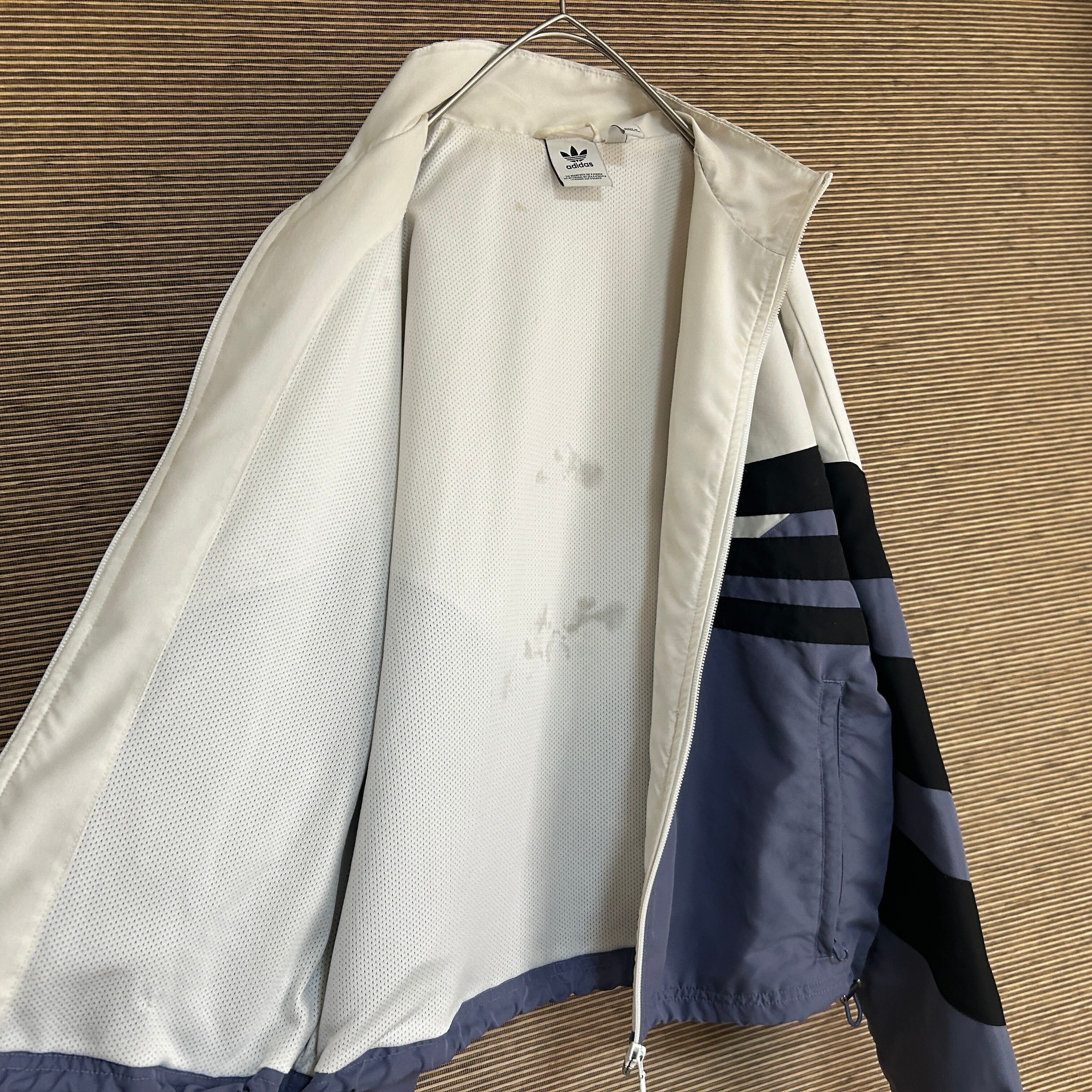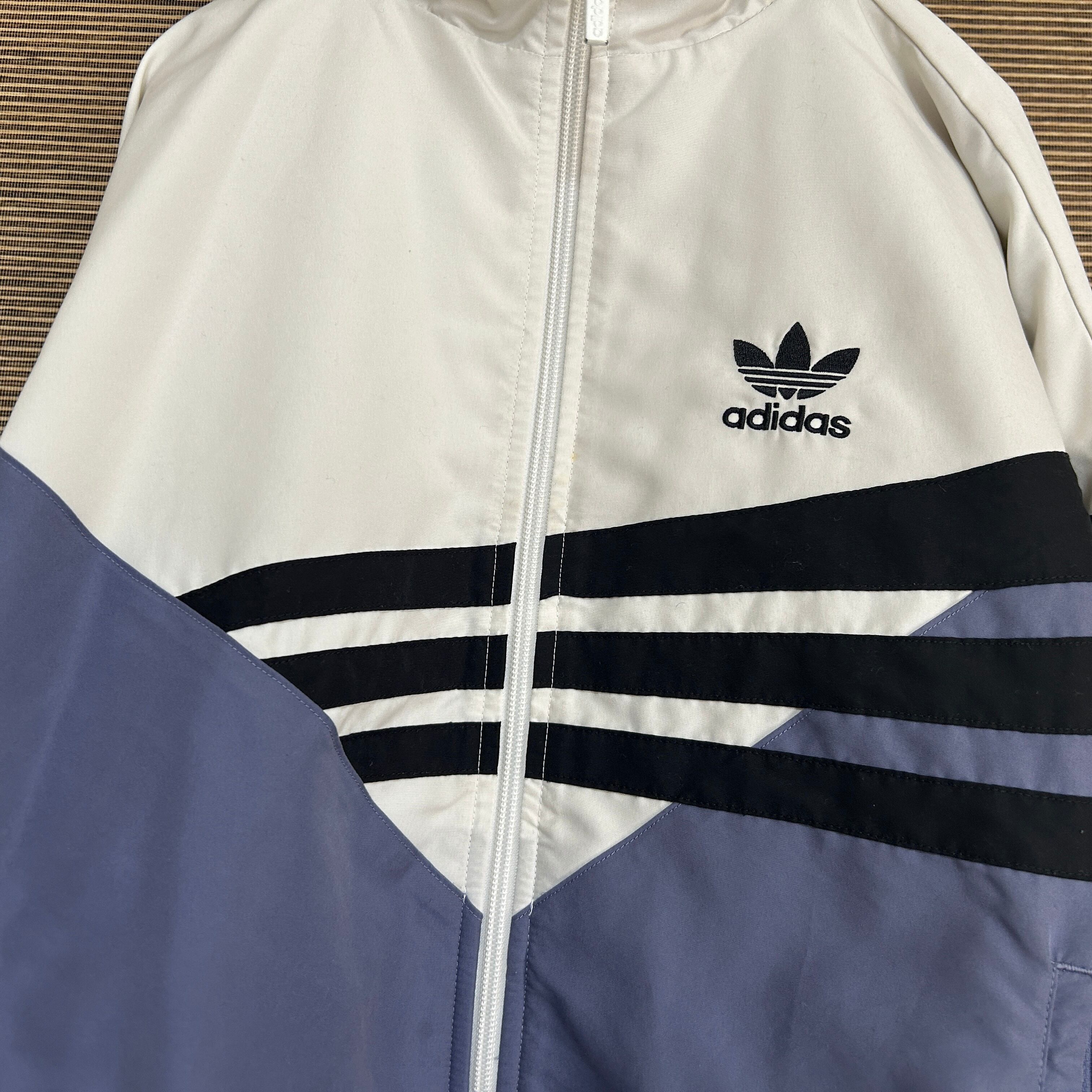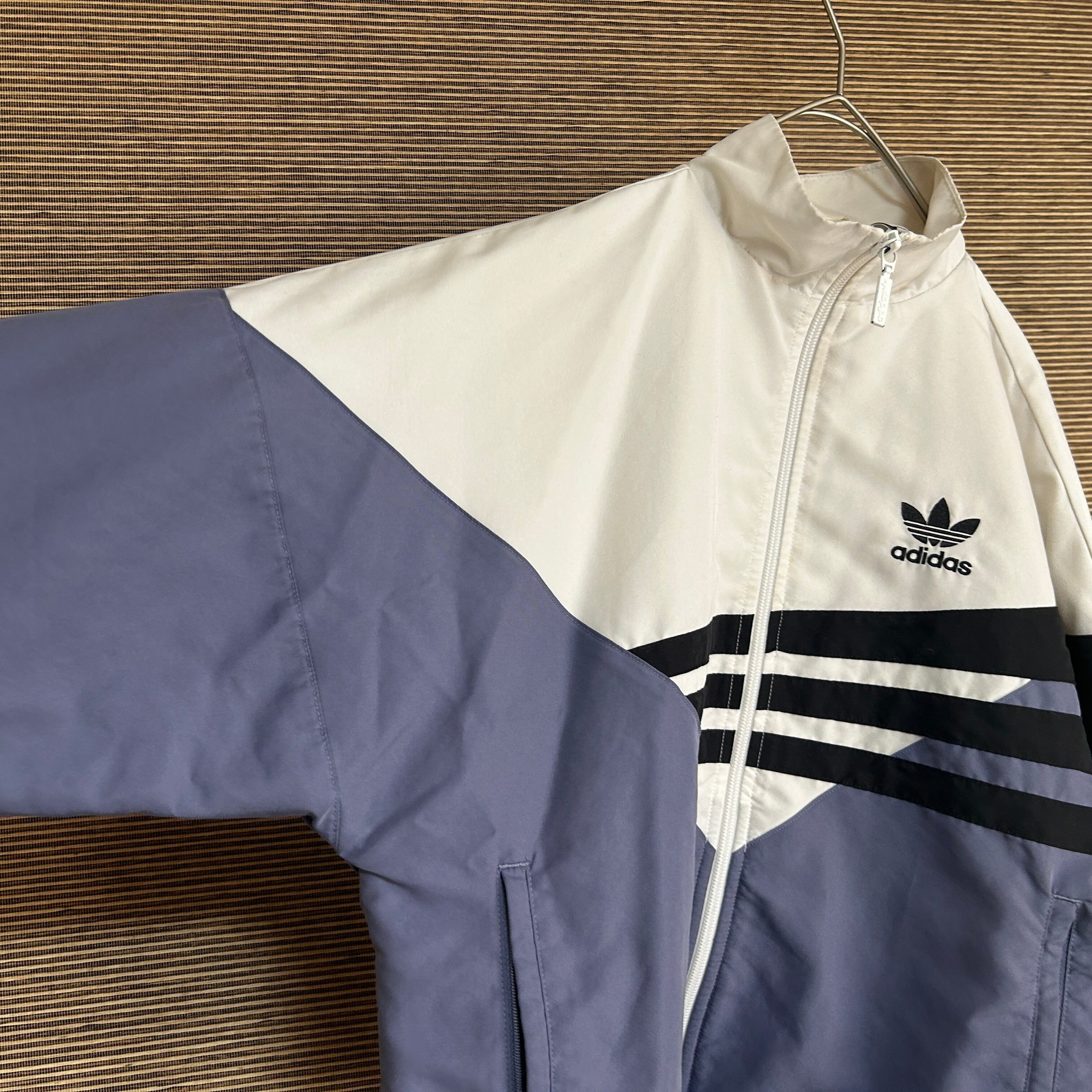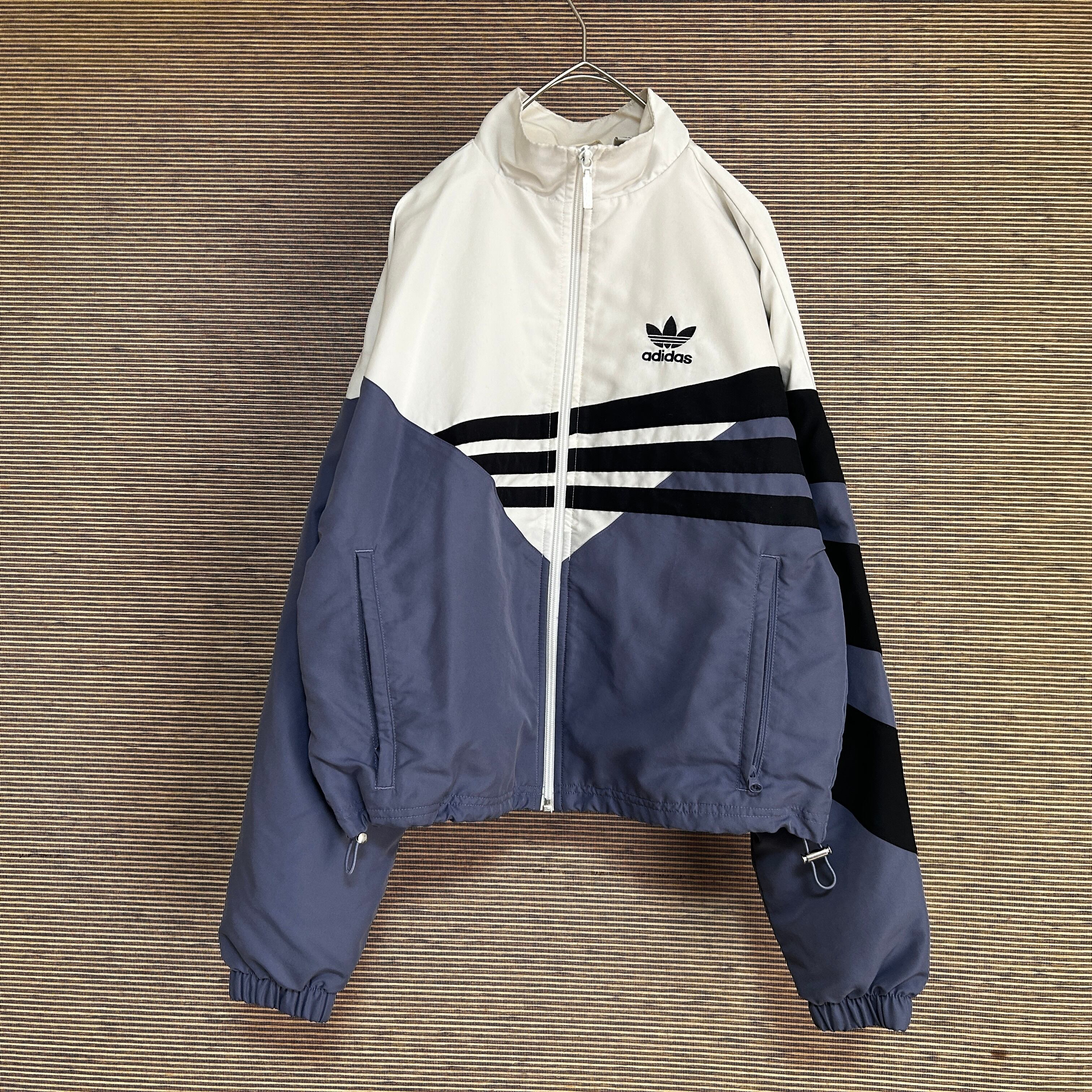 アディダス ショート丈ナイロンジャケット トレフォイルロゴ 刺繍白紫 J2 古着 ワンポイントロゴ レディース ホワイト パープル 短丈