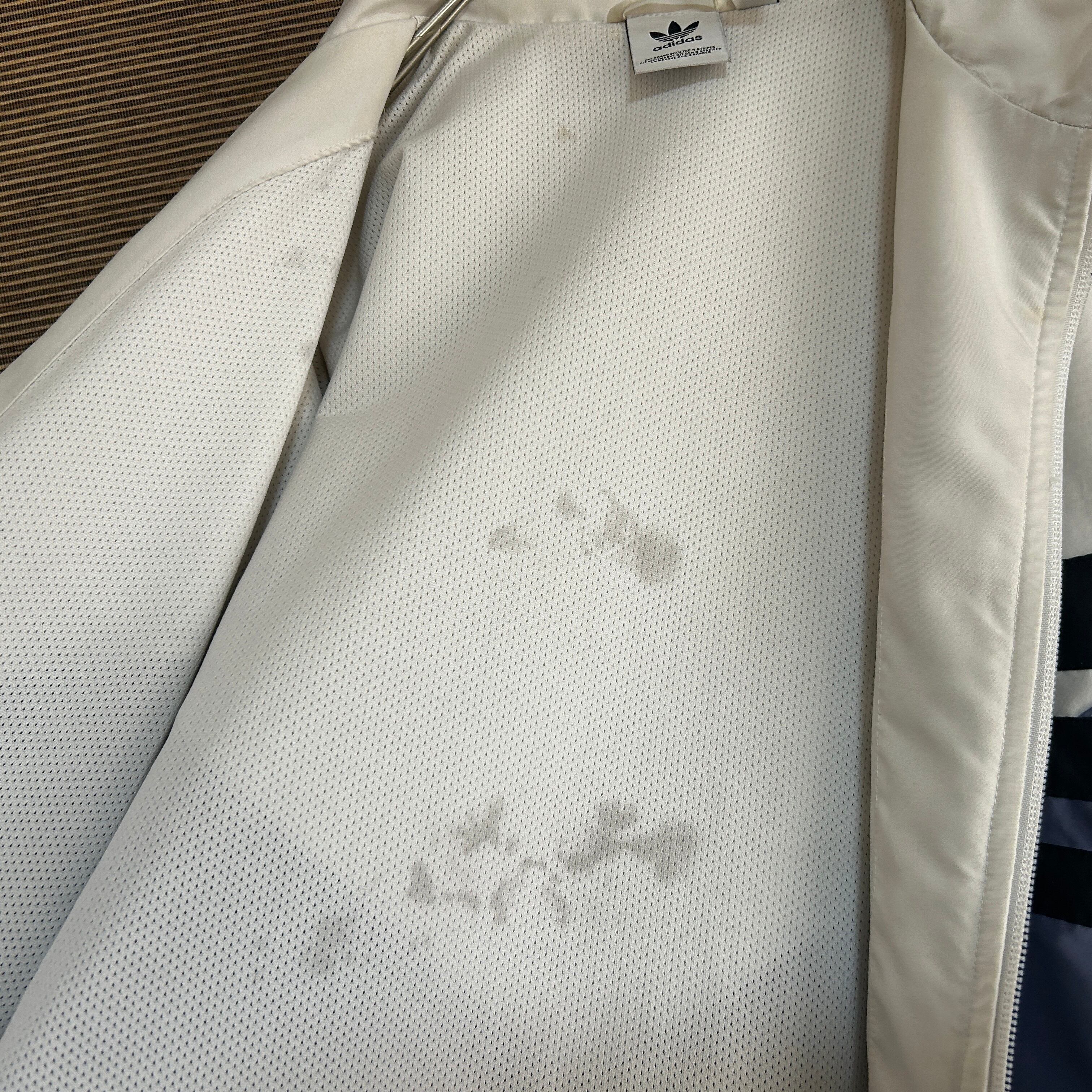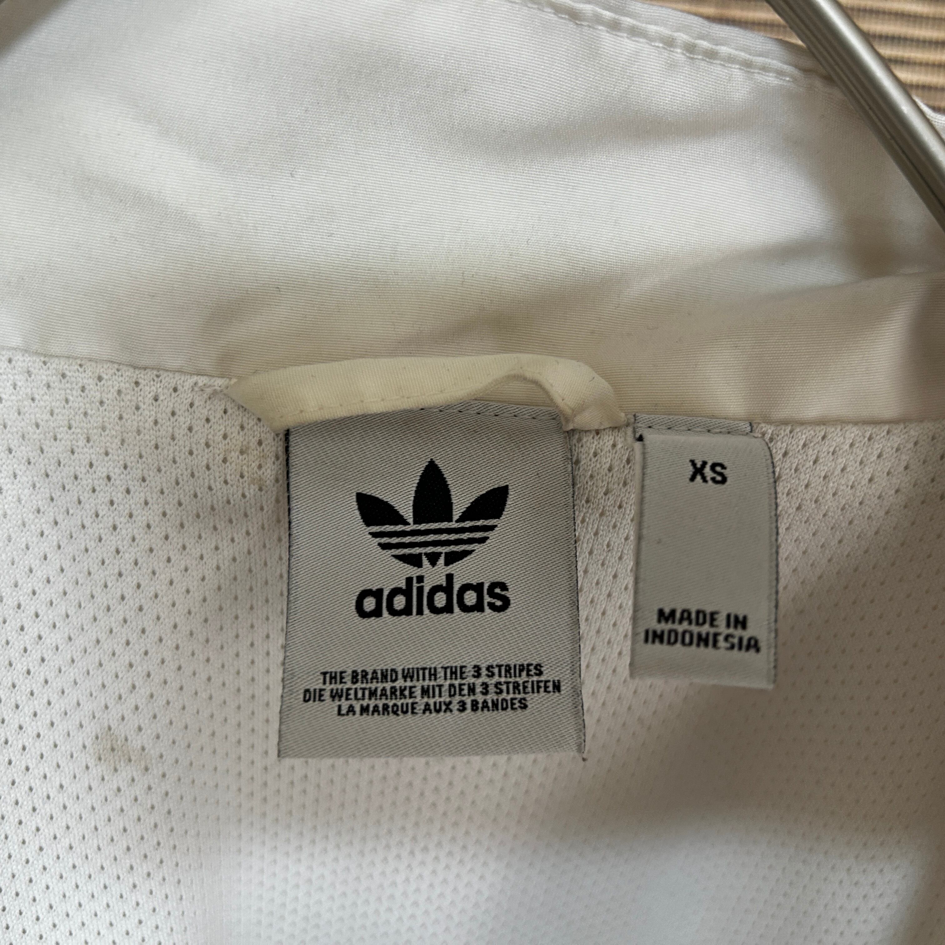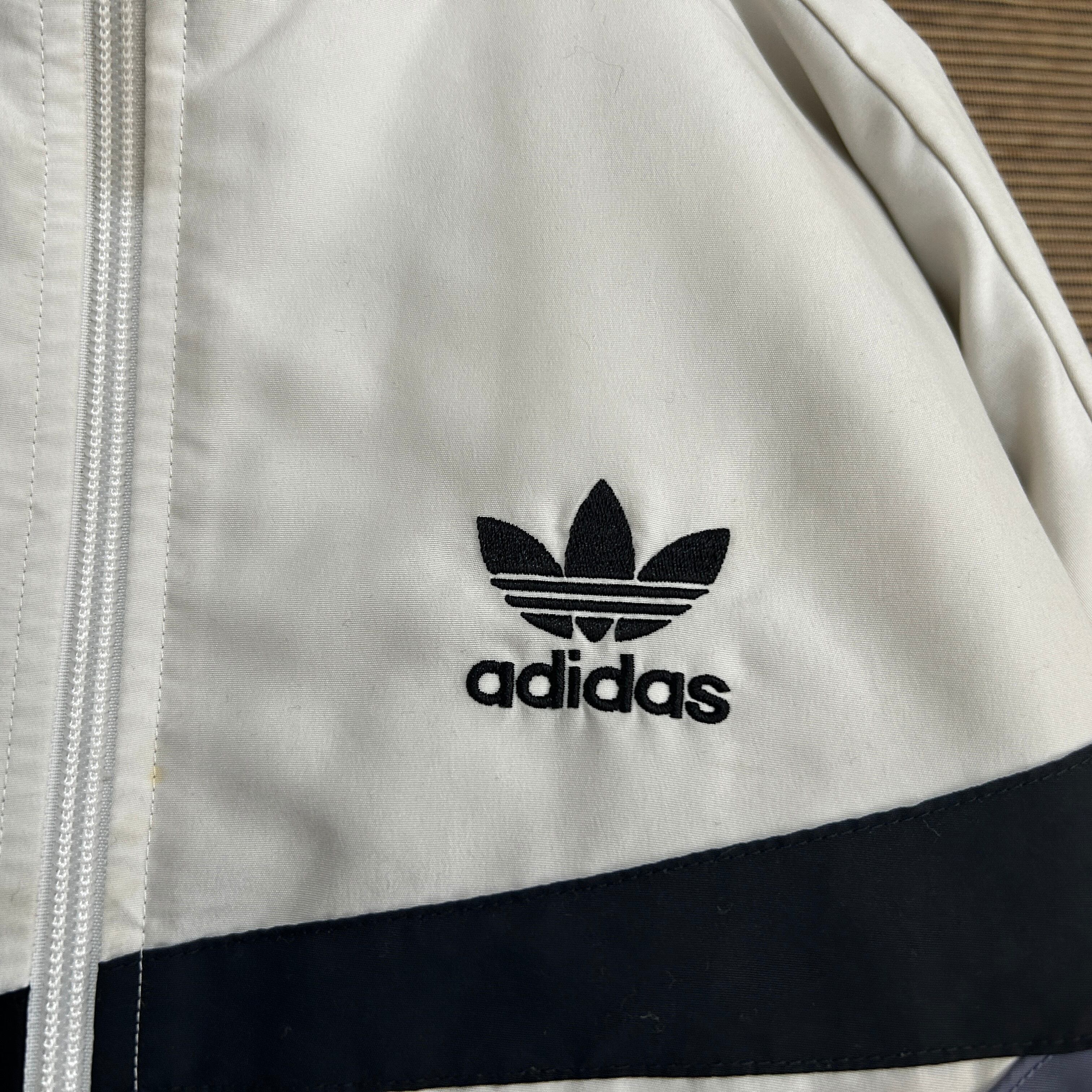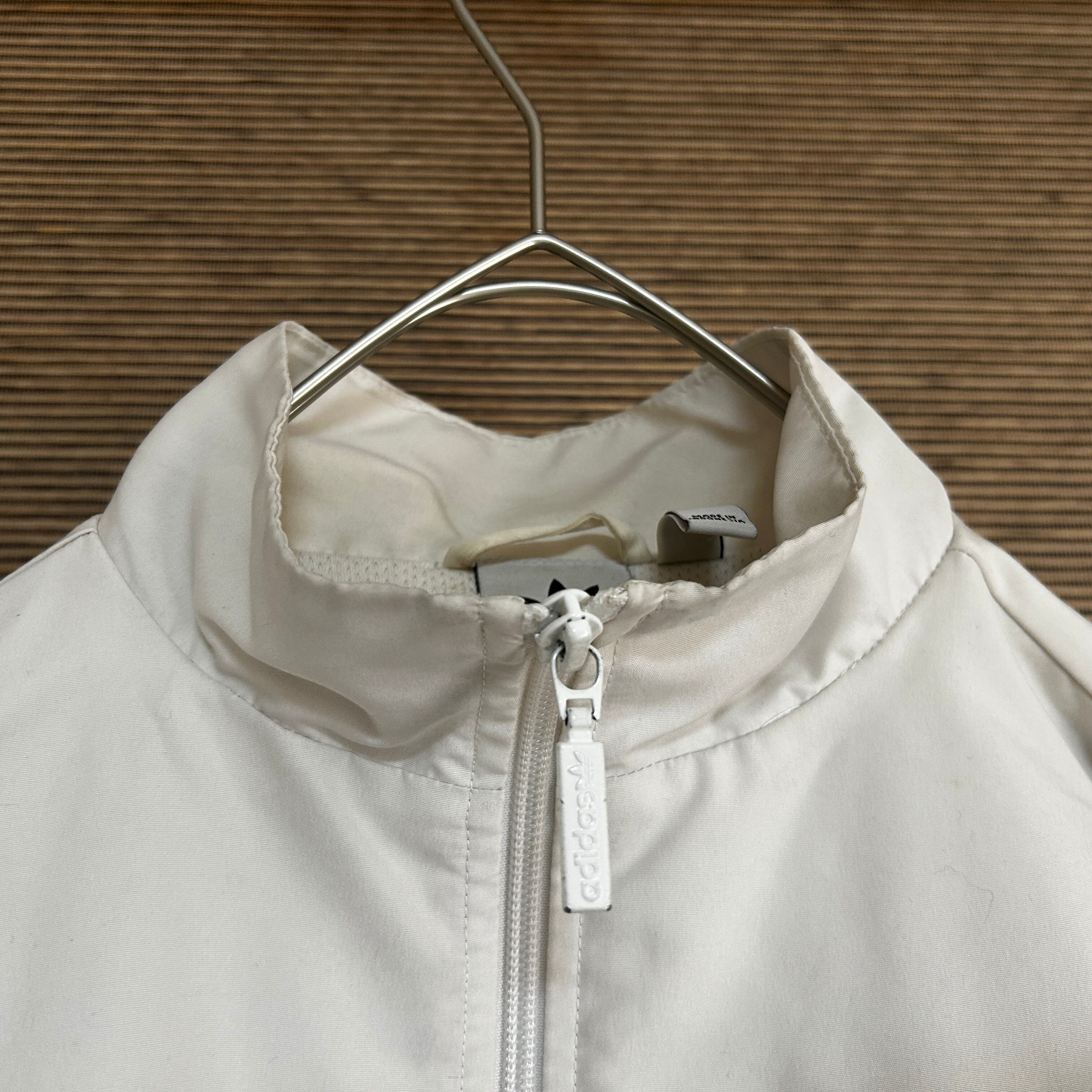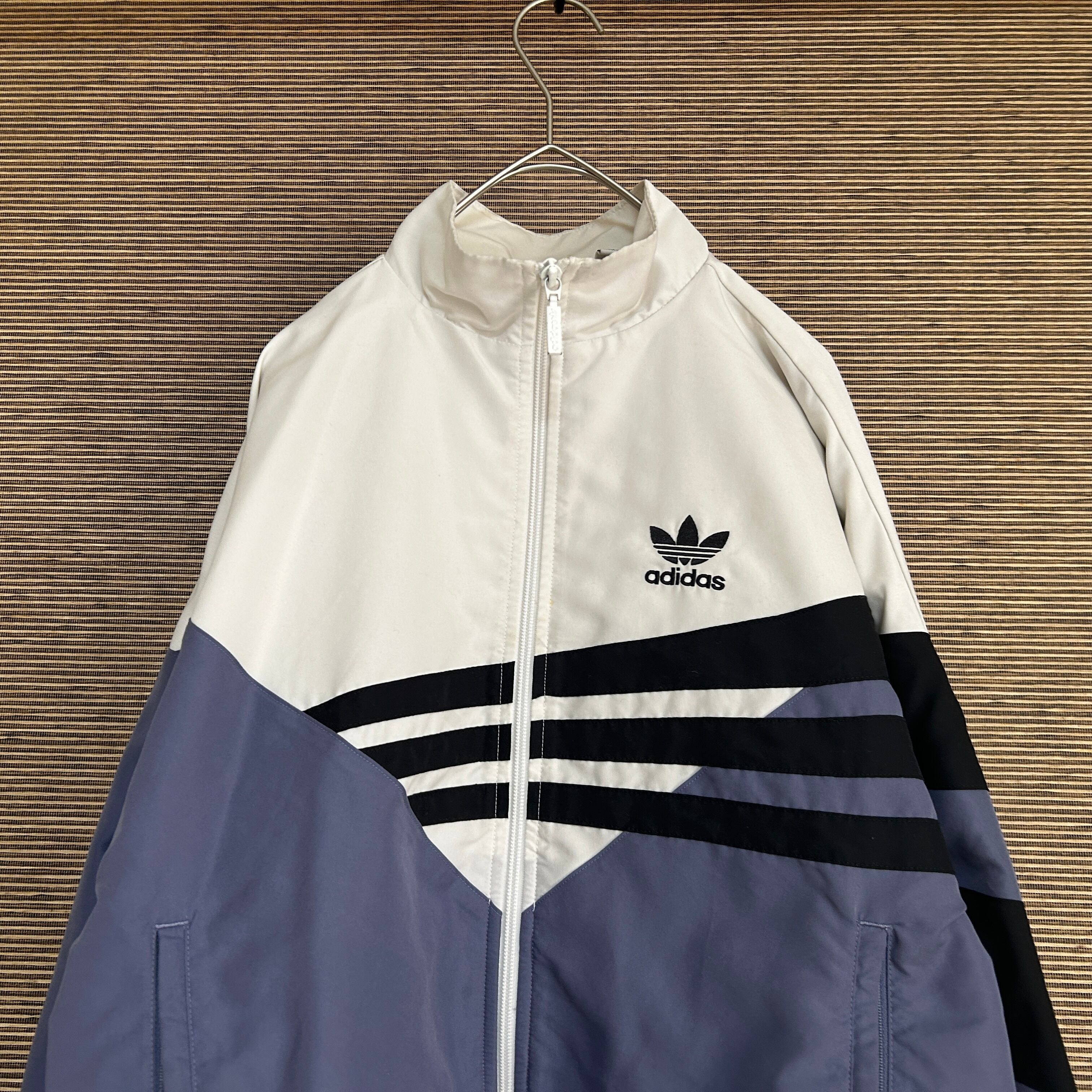 アディダス ショート丈ナイロンジャケット トレフォイルロゴ 刺繍白紫 J2 古着 ワンポイントロゴ レディース ホワイト パープル 短丈