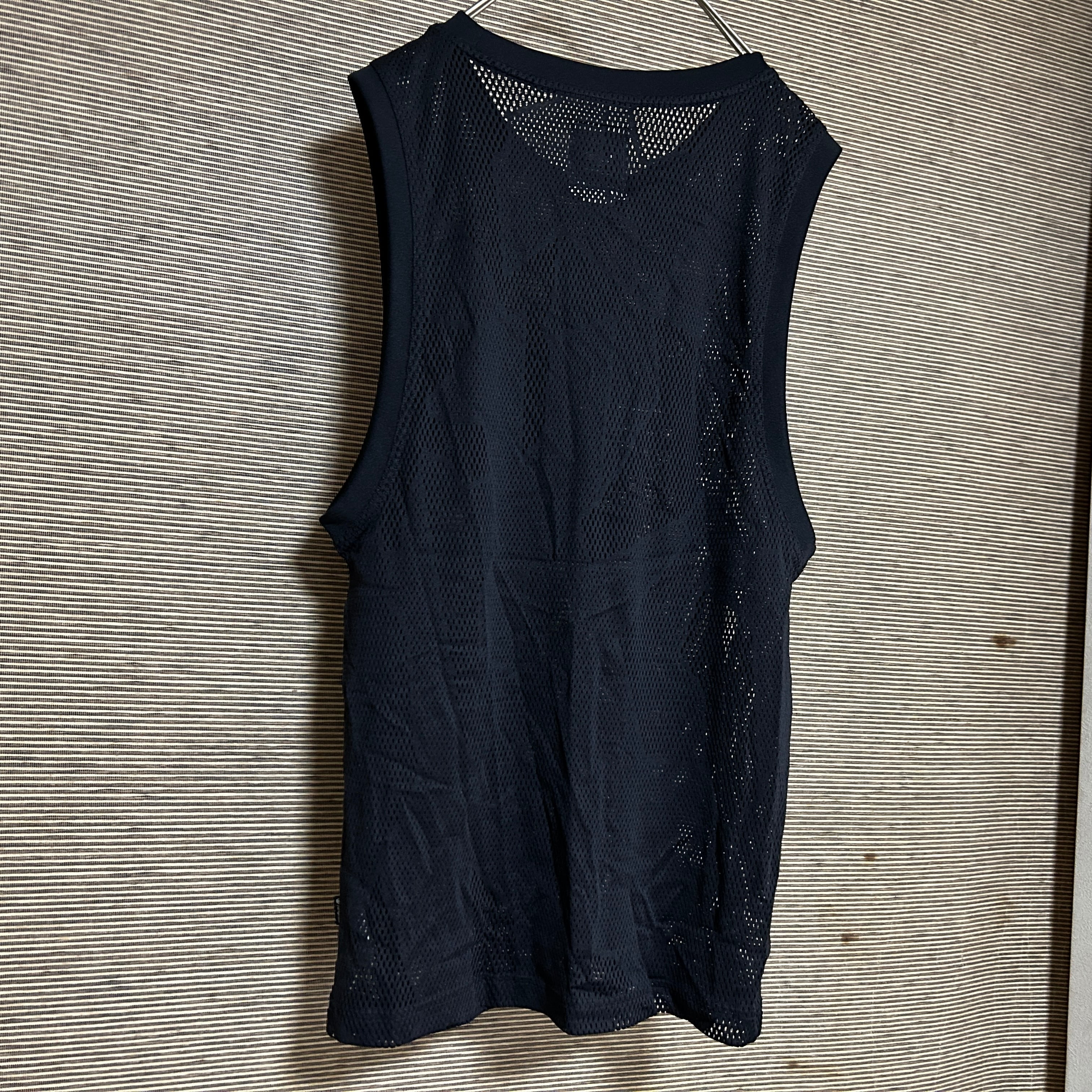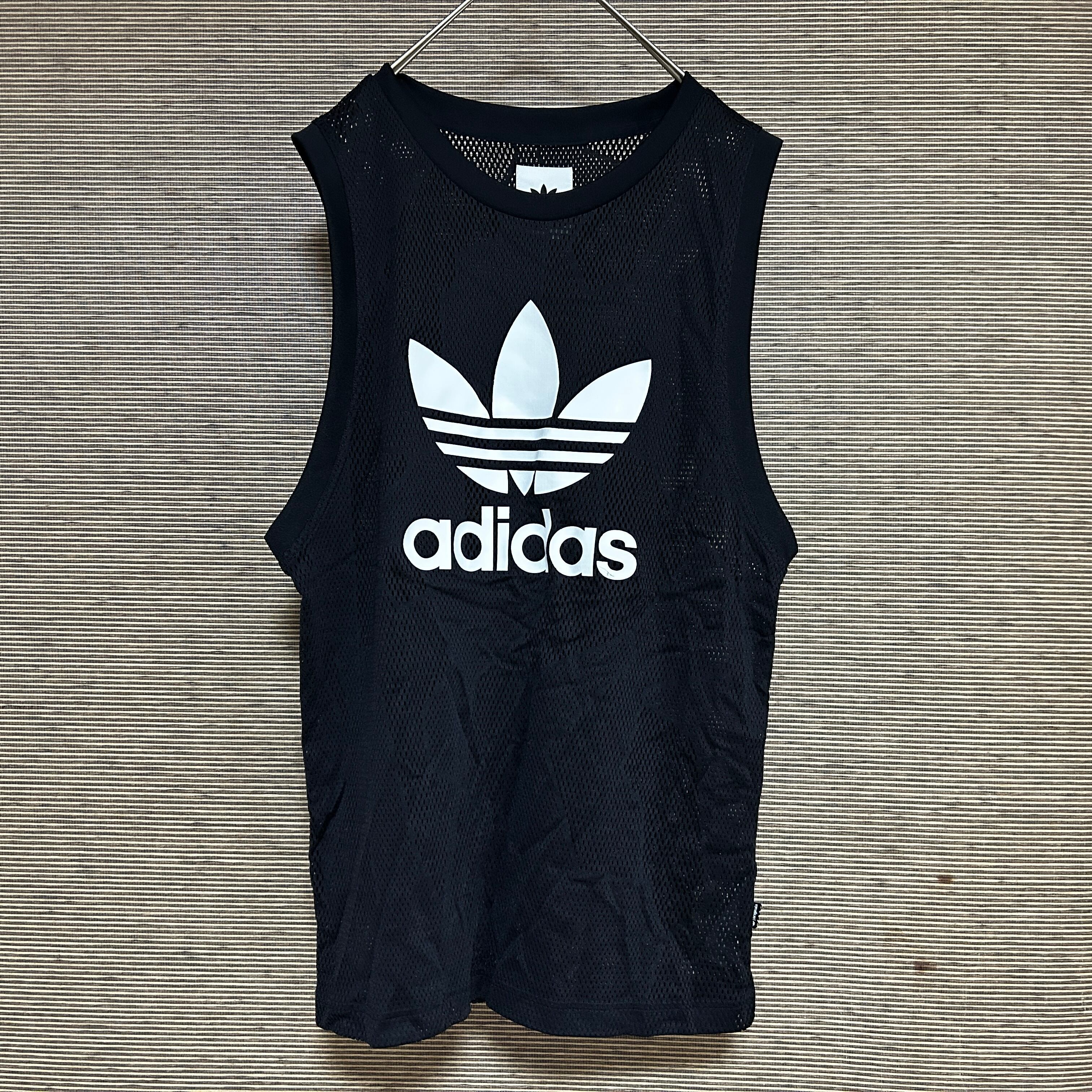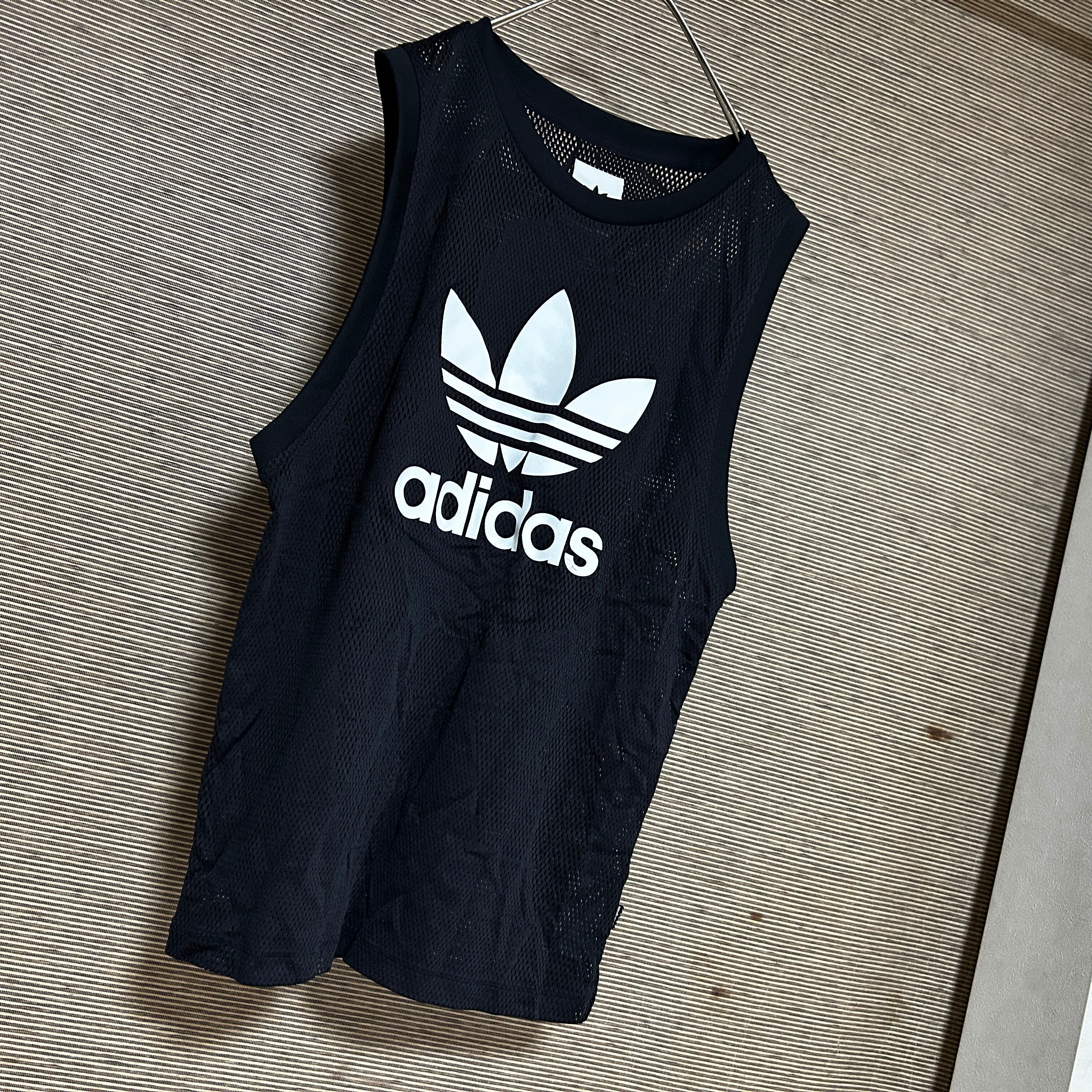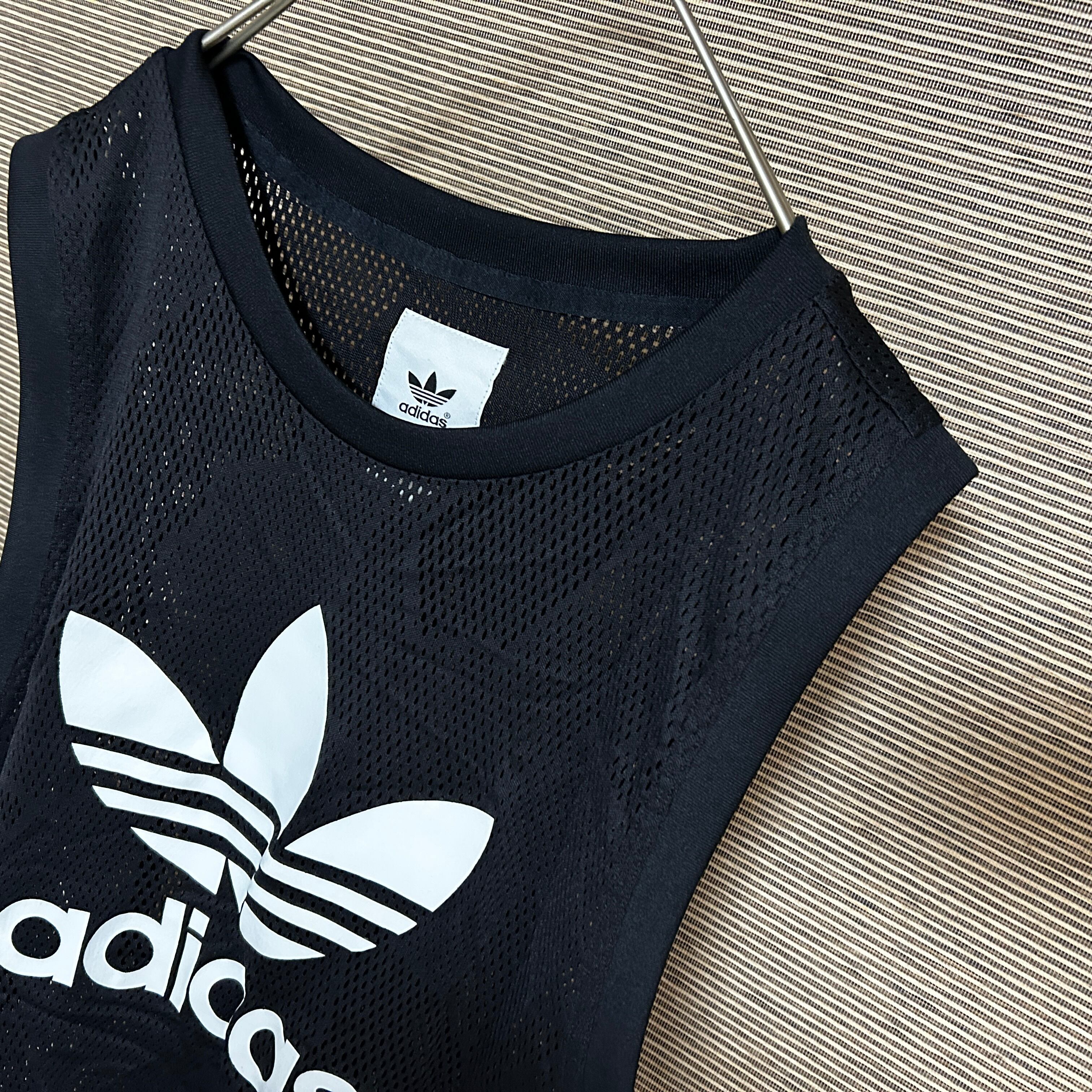 アディダス ノースリーブスタンクトップ 黒 メッシュデカロゴ トレフォイルN1 古着 レディース ビッグロゴ ブラック