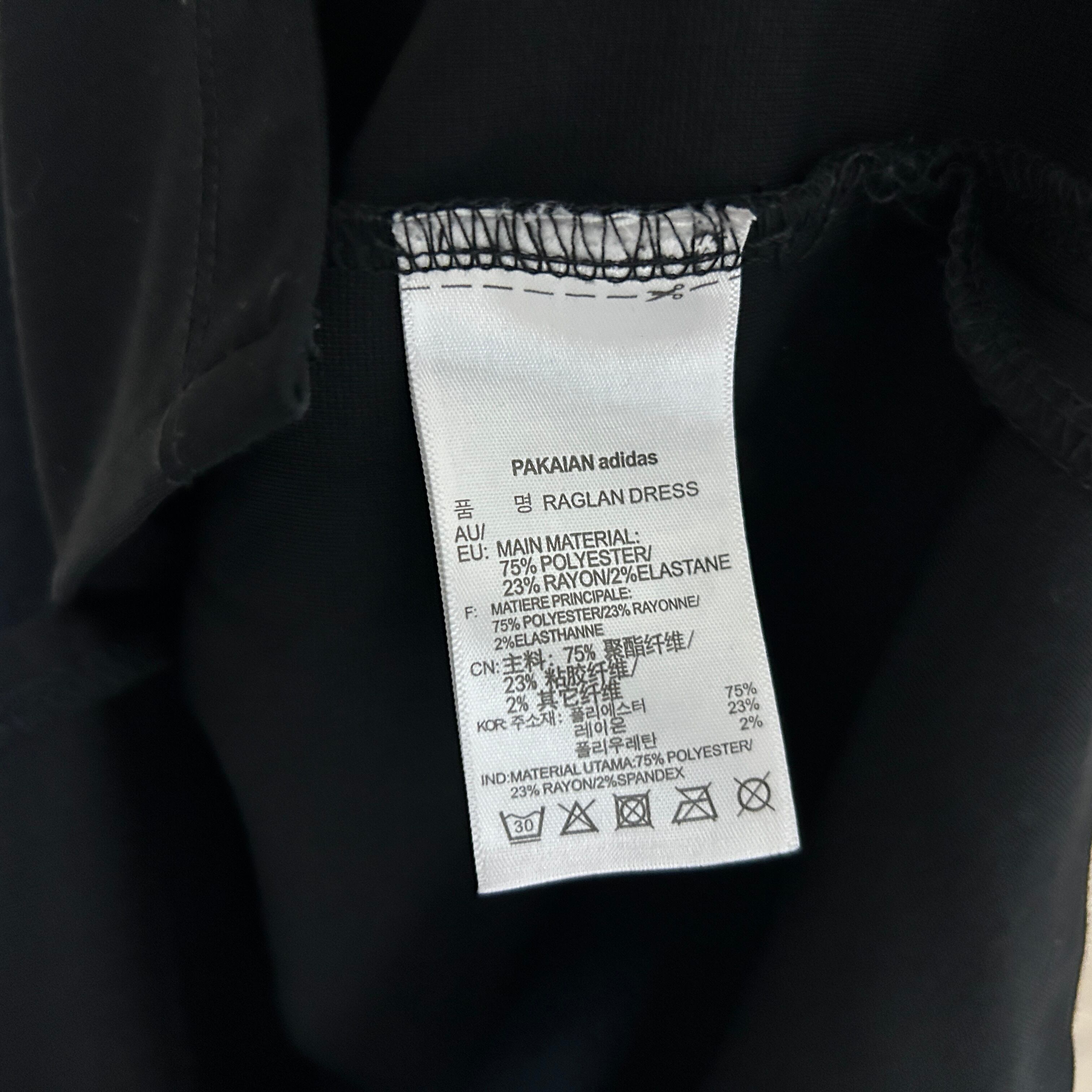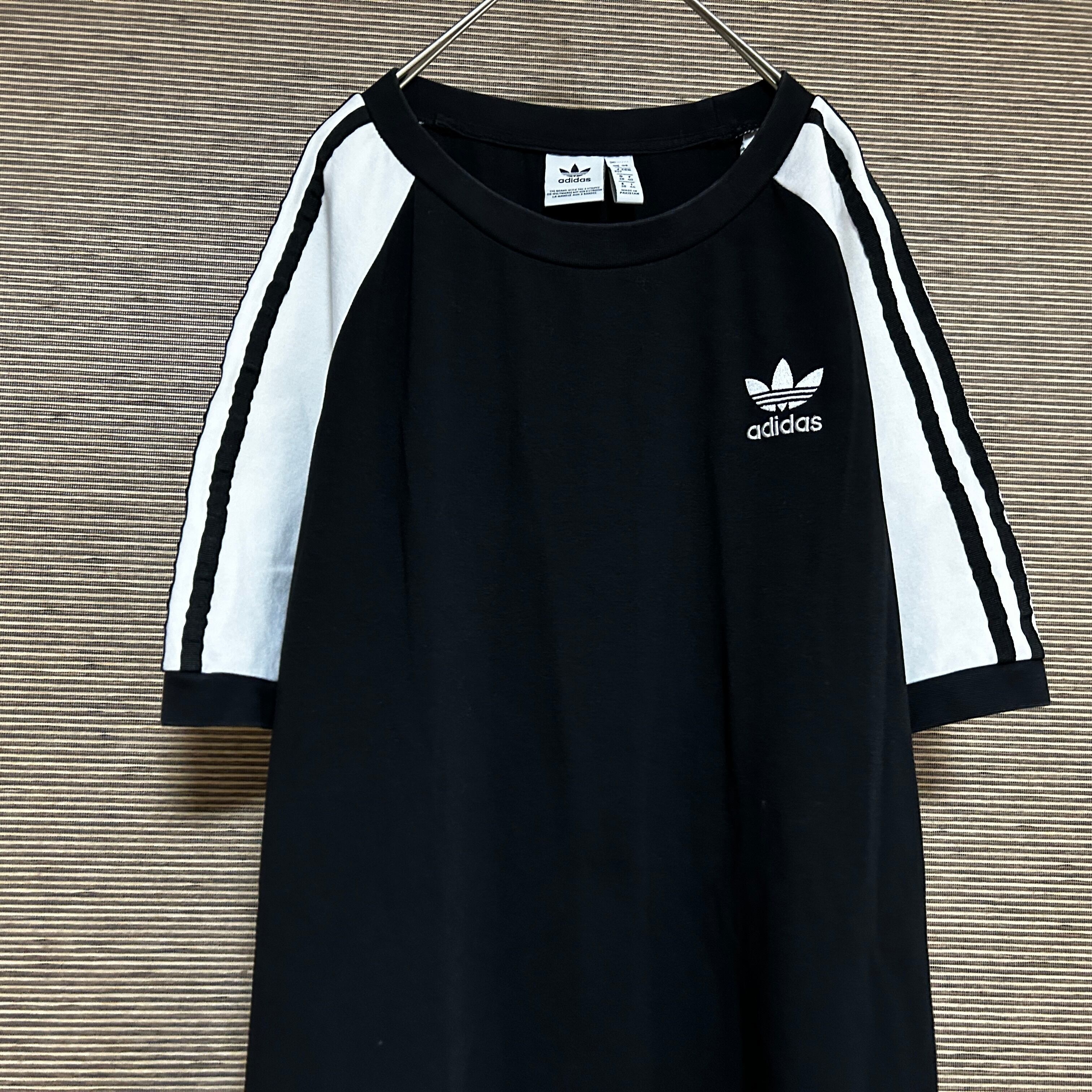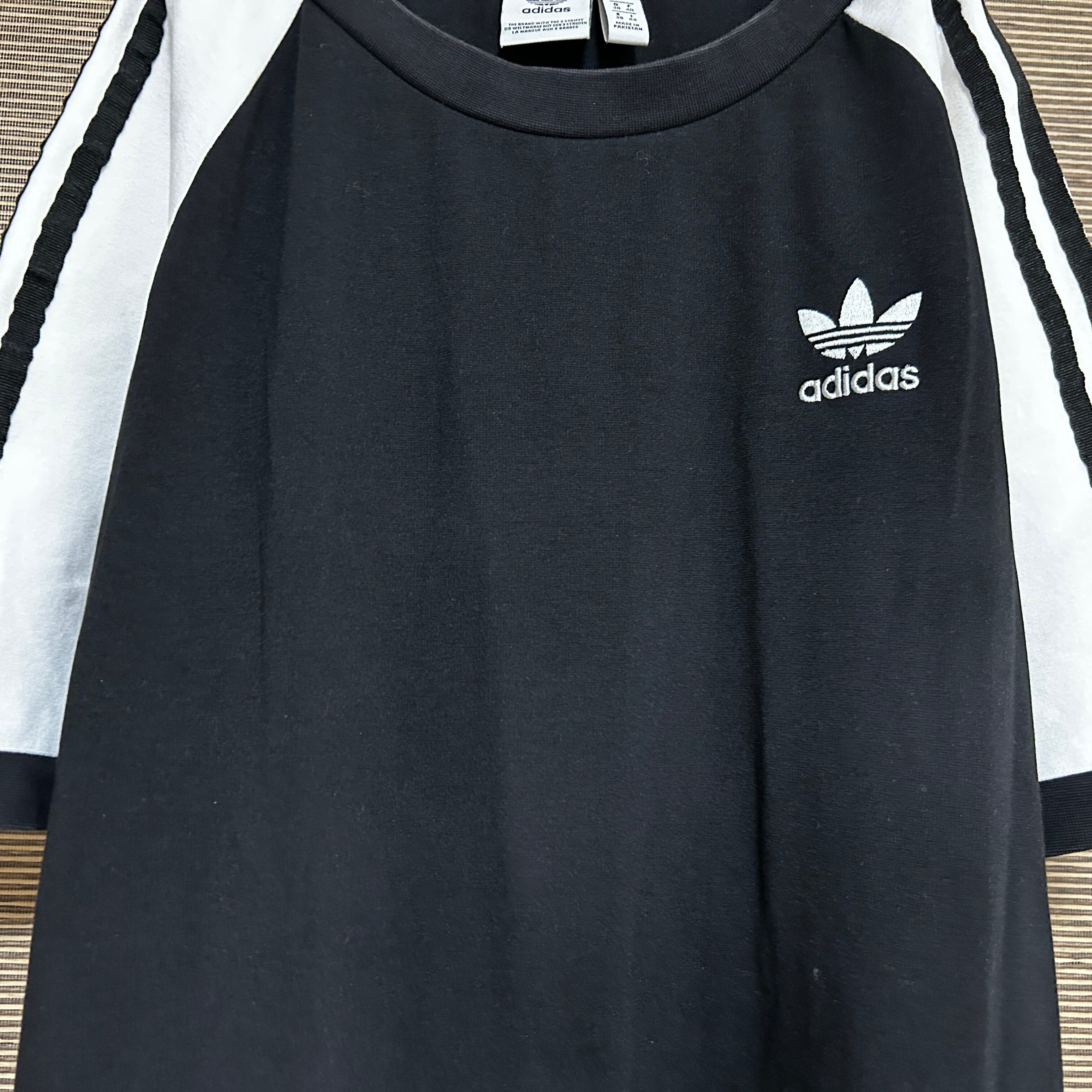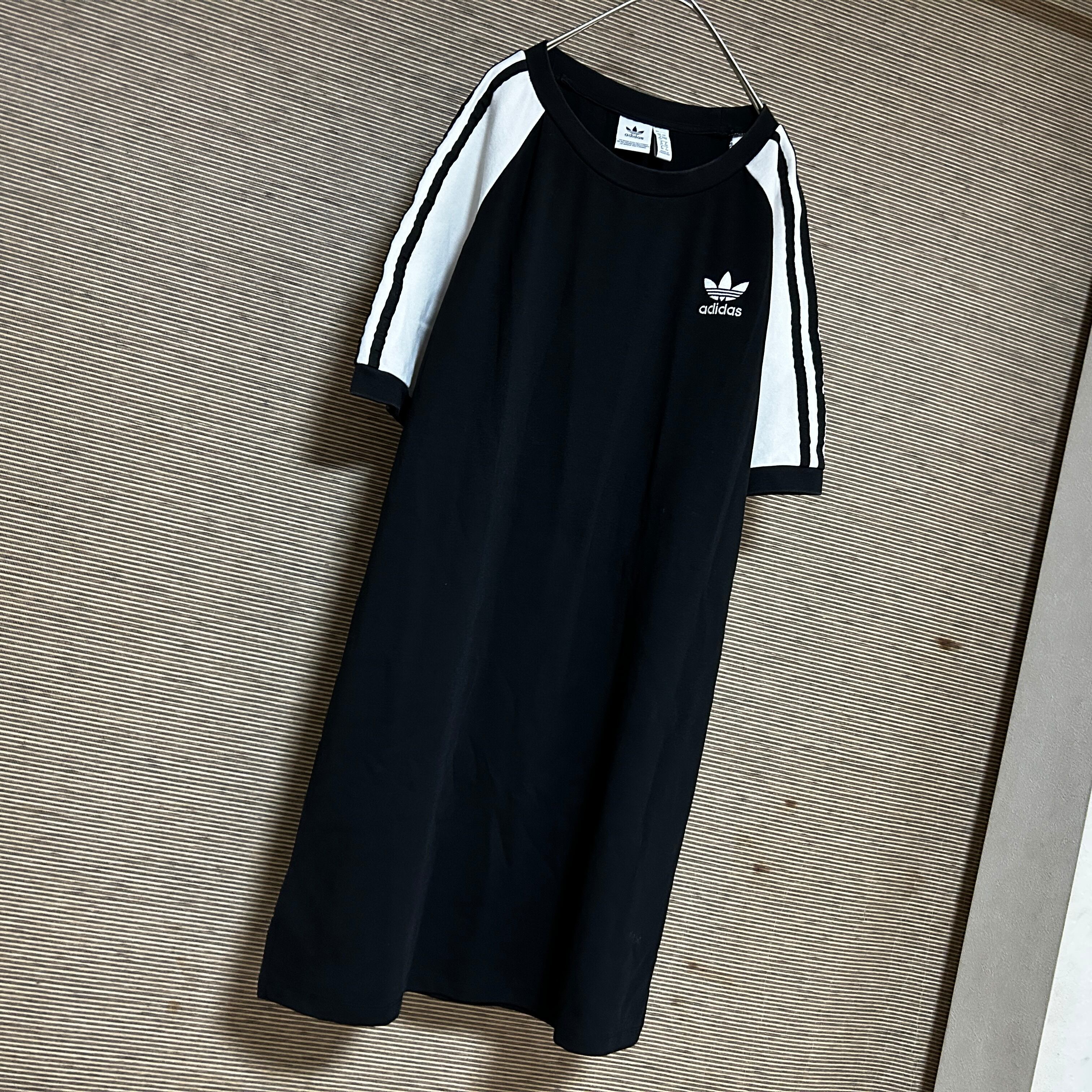 アディダス 半袖ワンピース チュニック黒 刺繍 Mトレフォイル 三本線N1 古着 レディース ワンポイントロゴ 人気