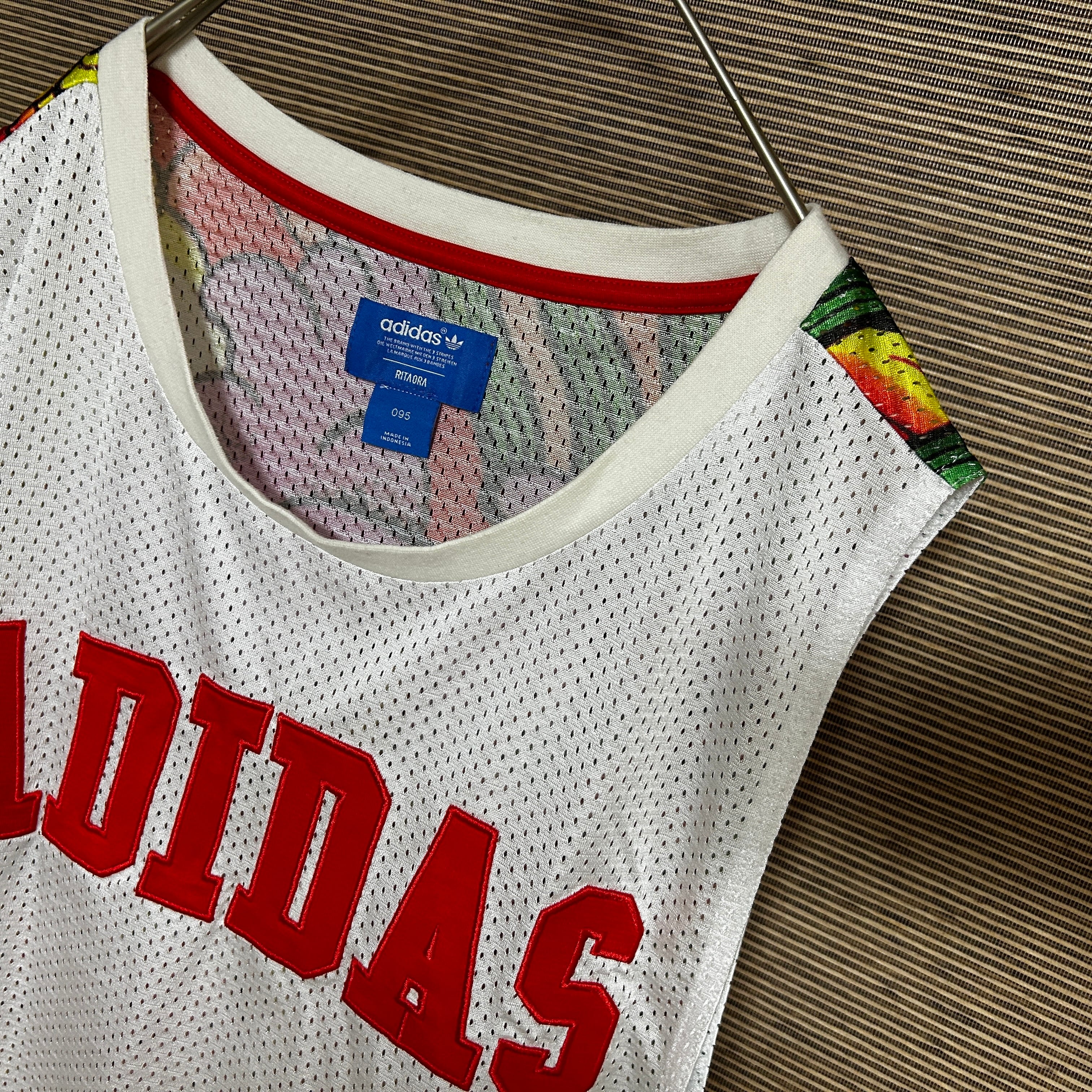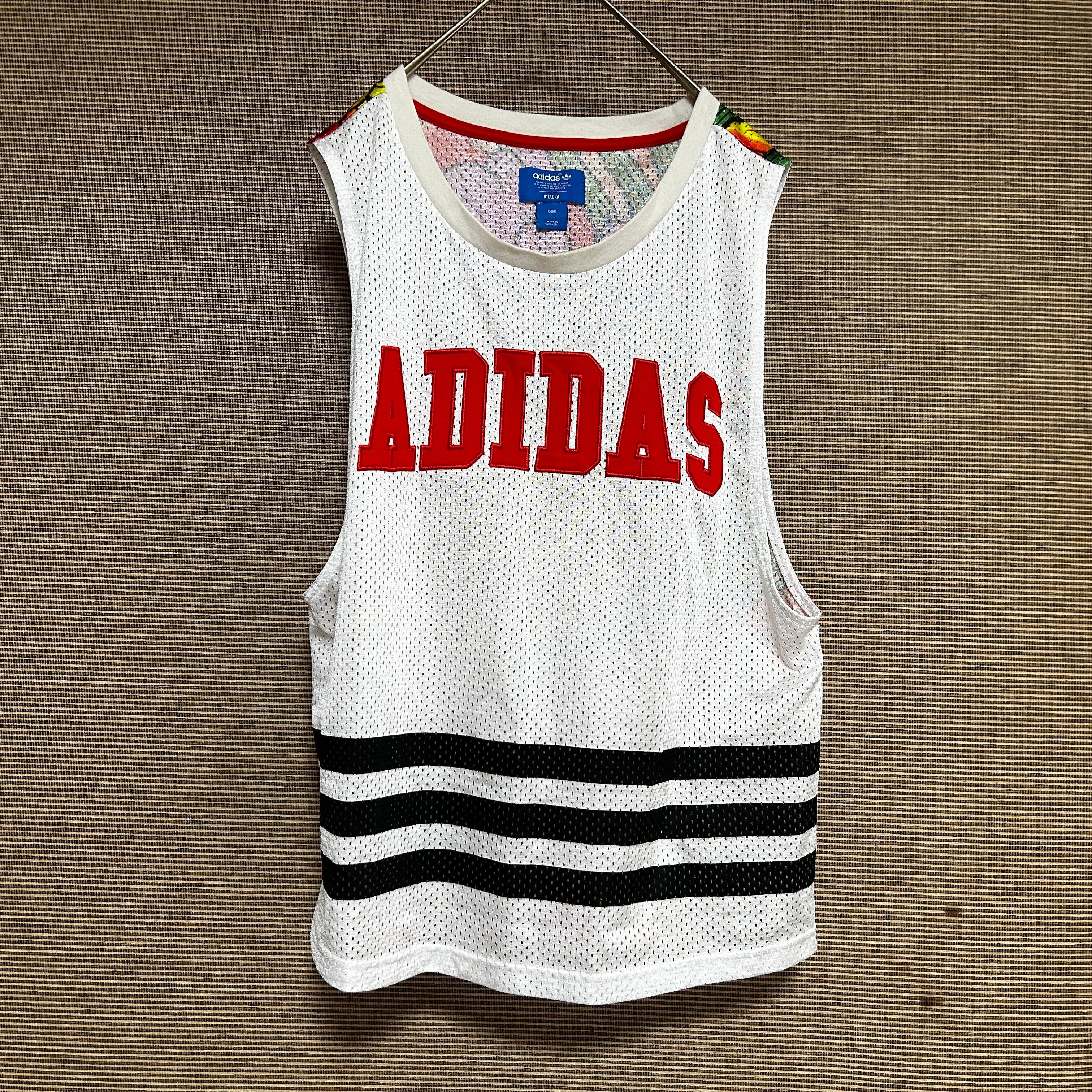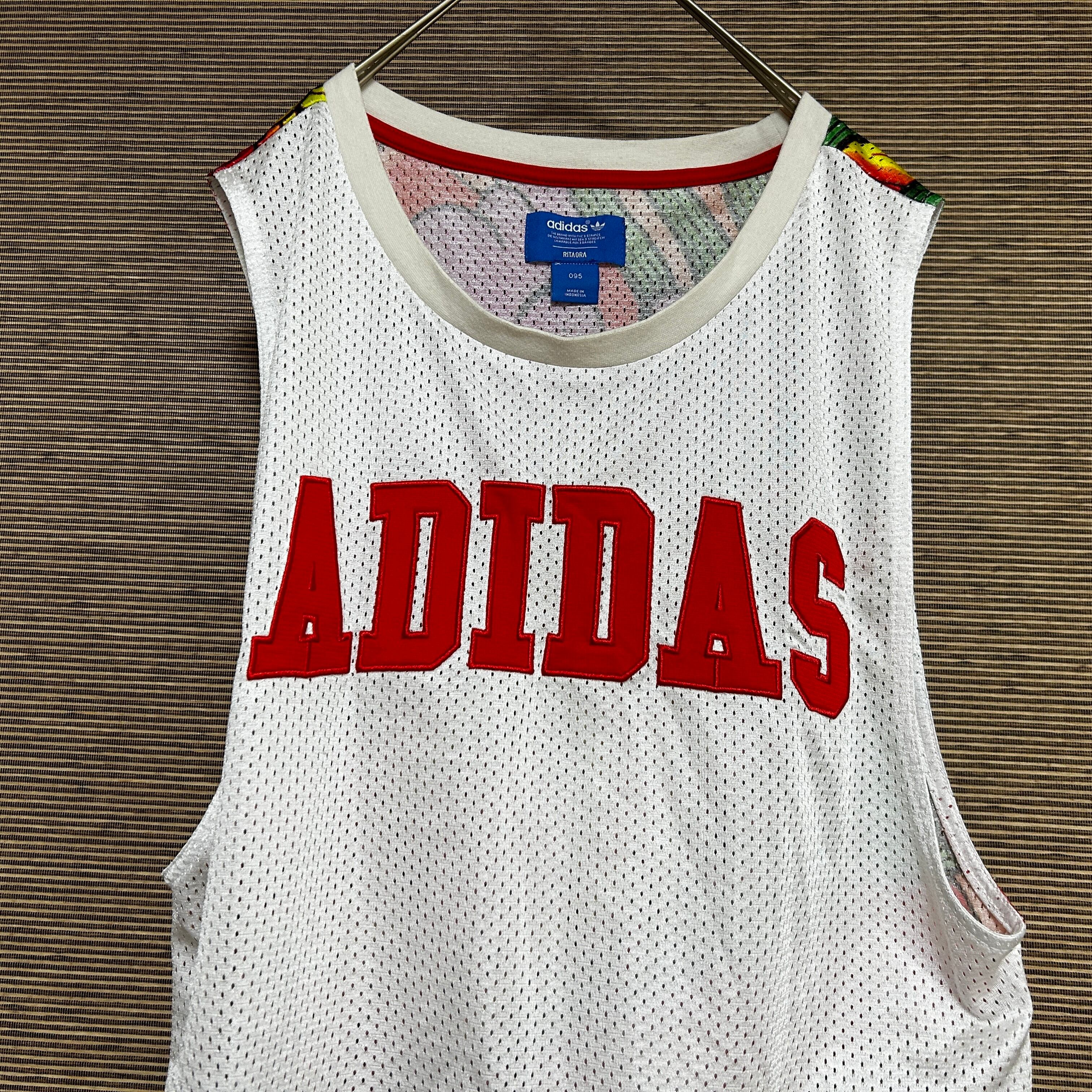 アディダス ノースリーブスタンクトップ 白メッシュドラゴントレフォイルロゴN 古着 デカロゴ 激レアデザイン ど派手