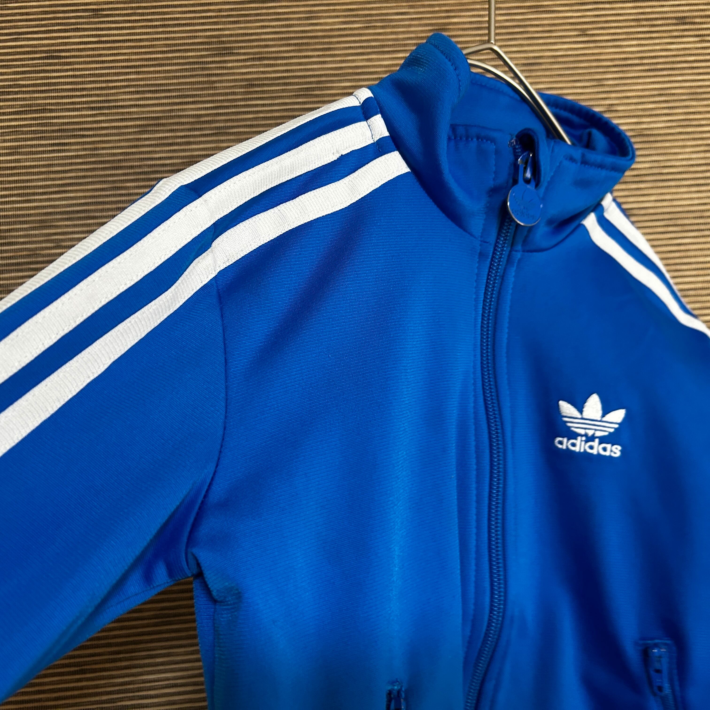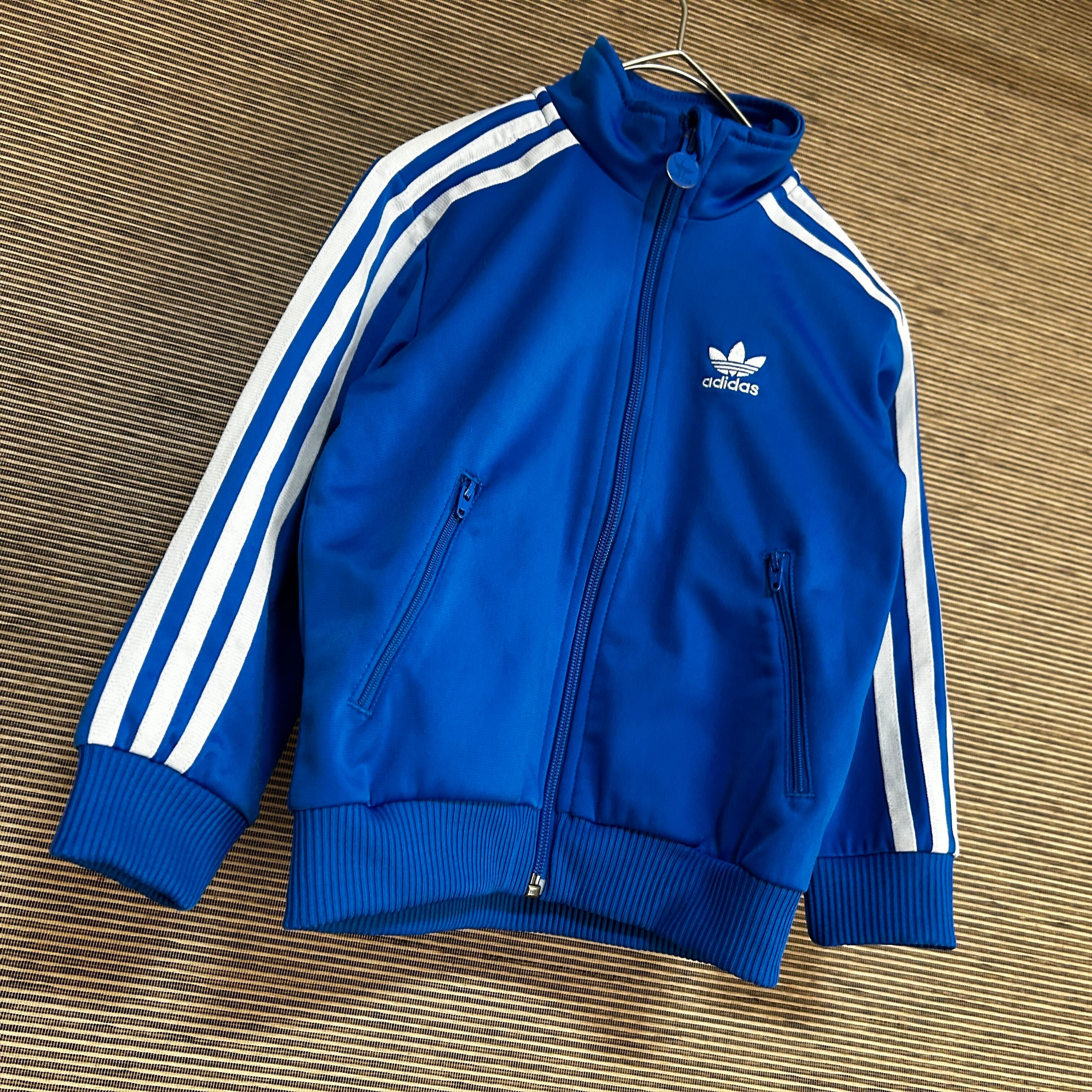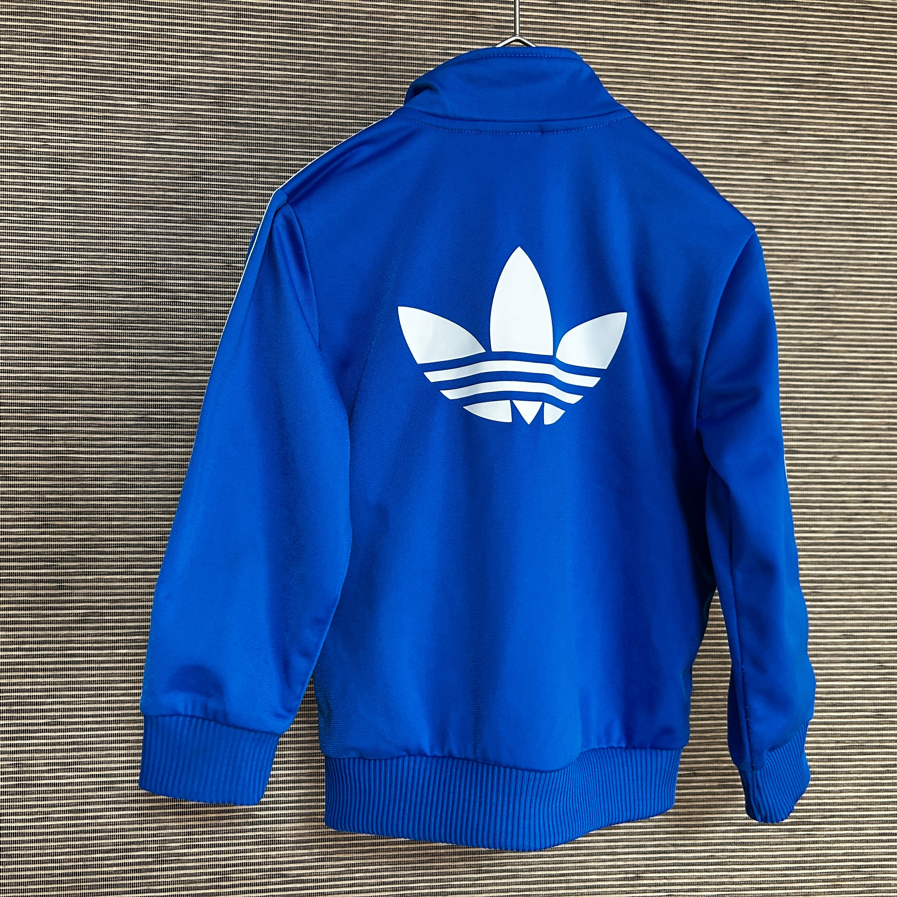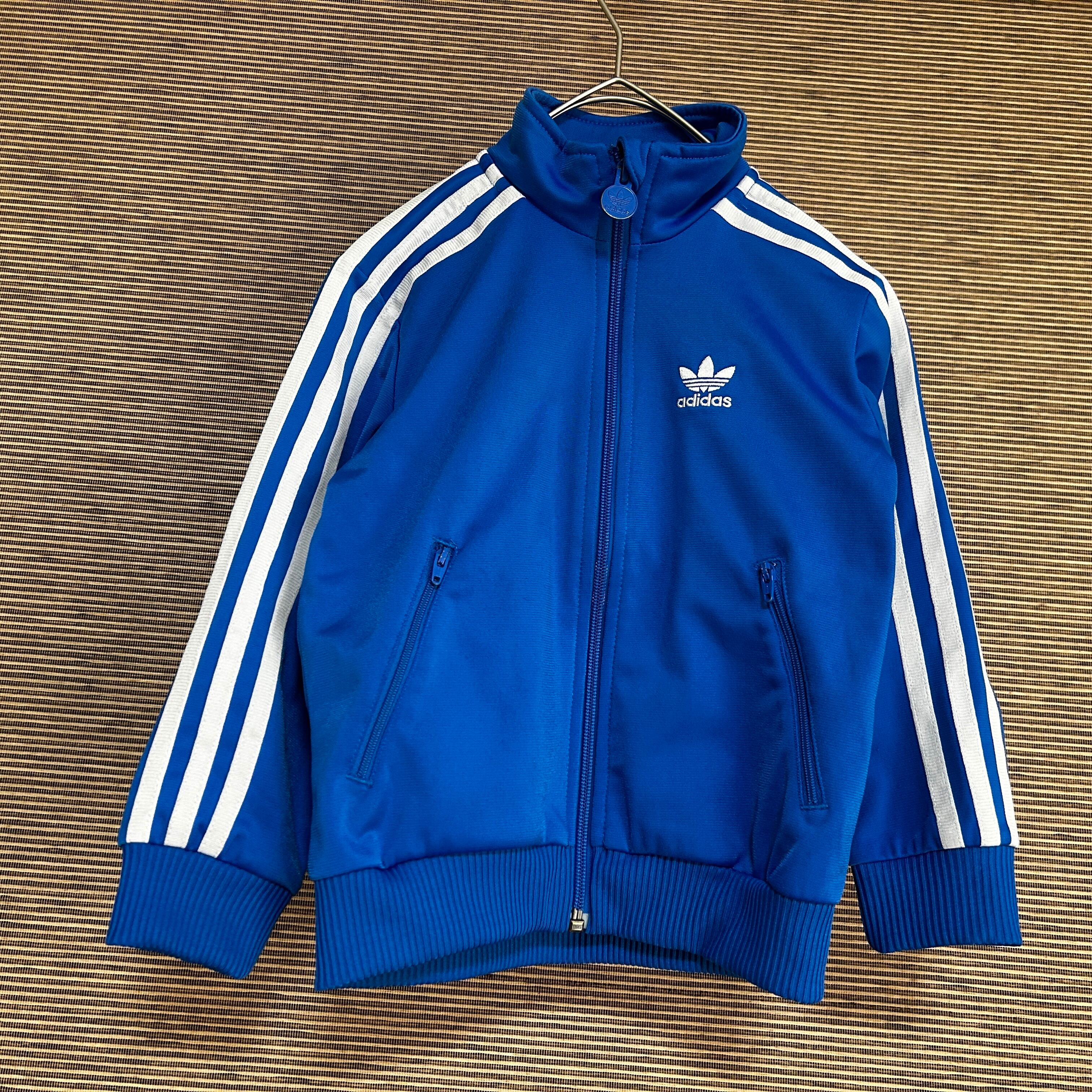 アディダス ジャージトラックジャケット青白子供110刺繍ファイヤーバードN 古着 キッズ 人気カラー トレフォイル ブルー