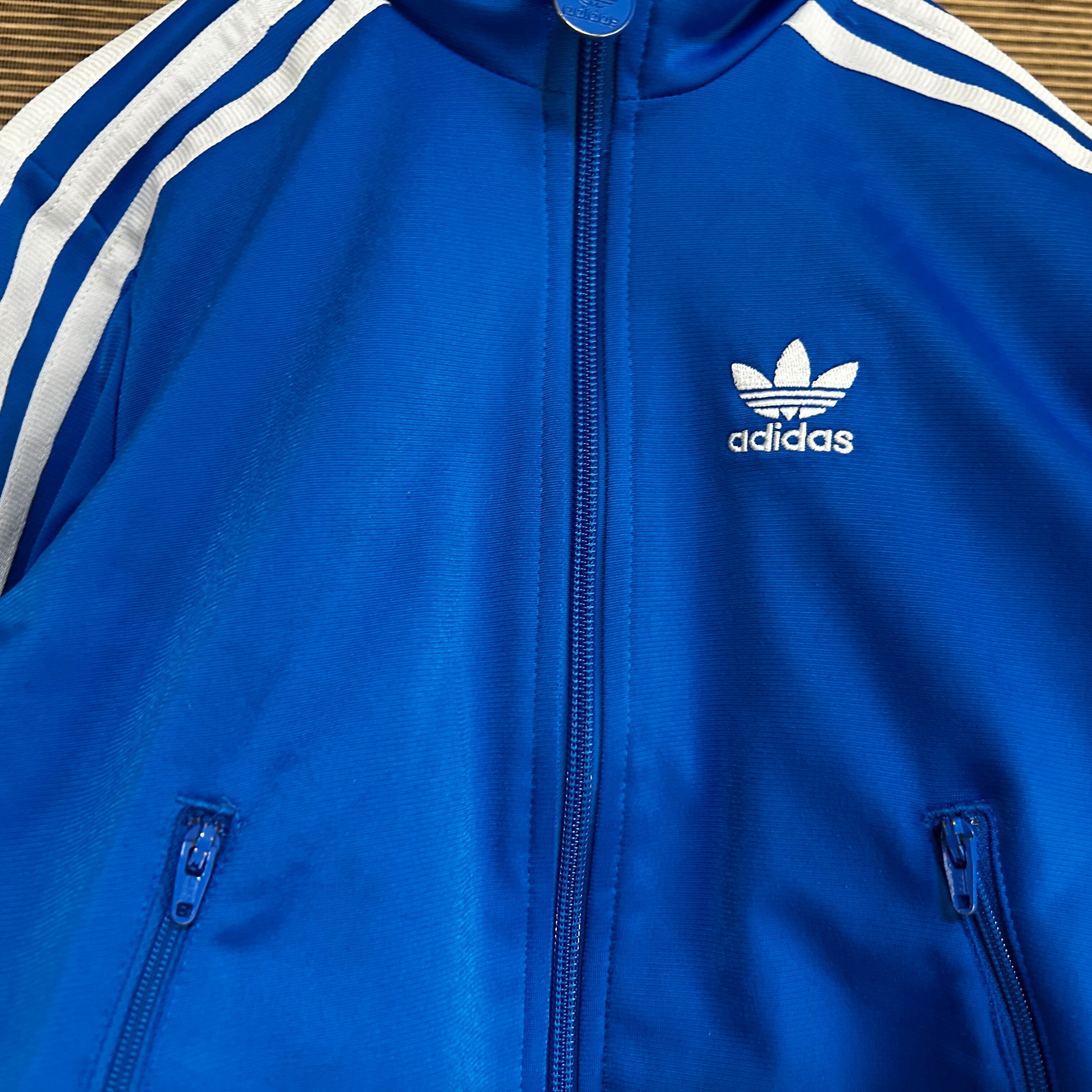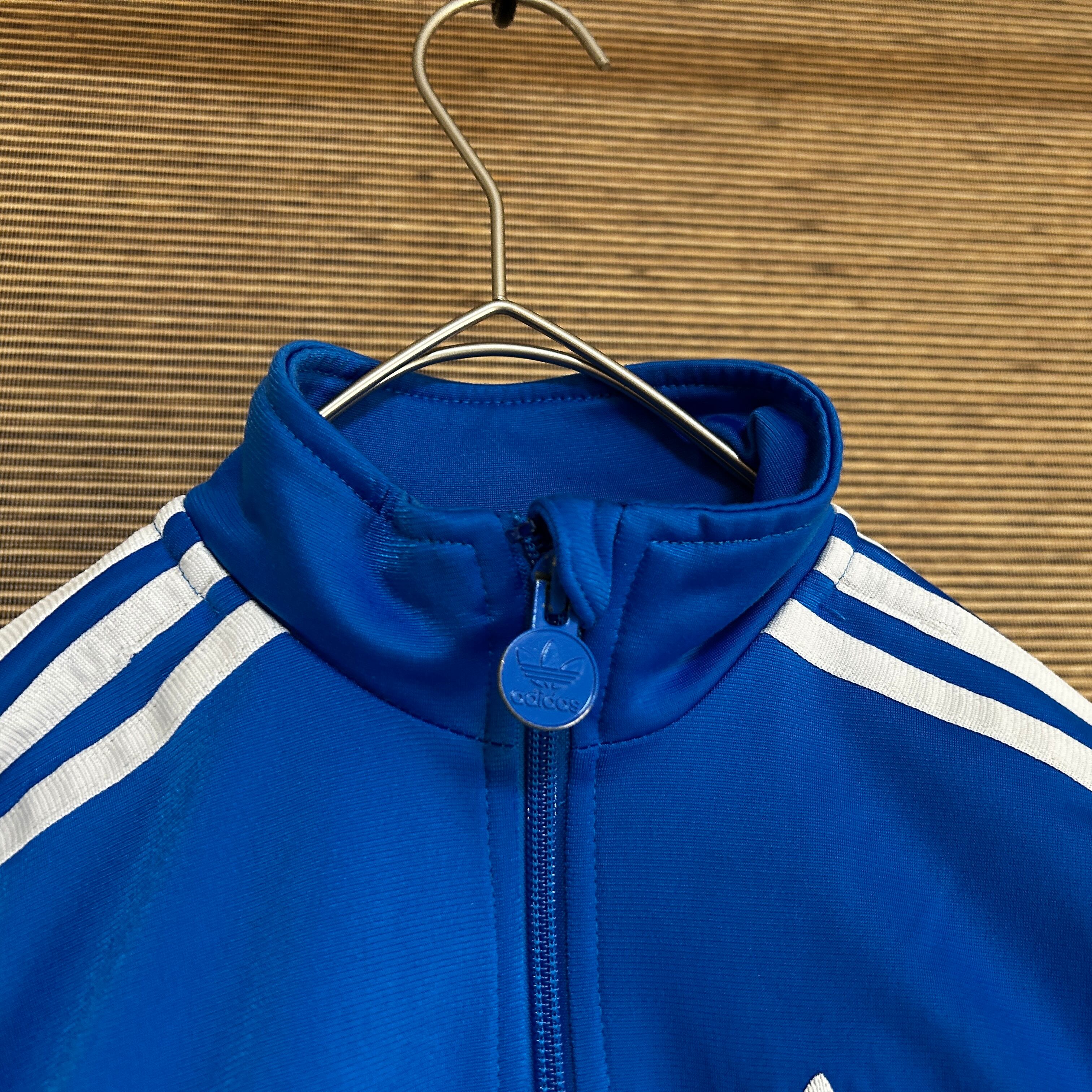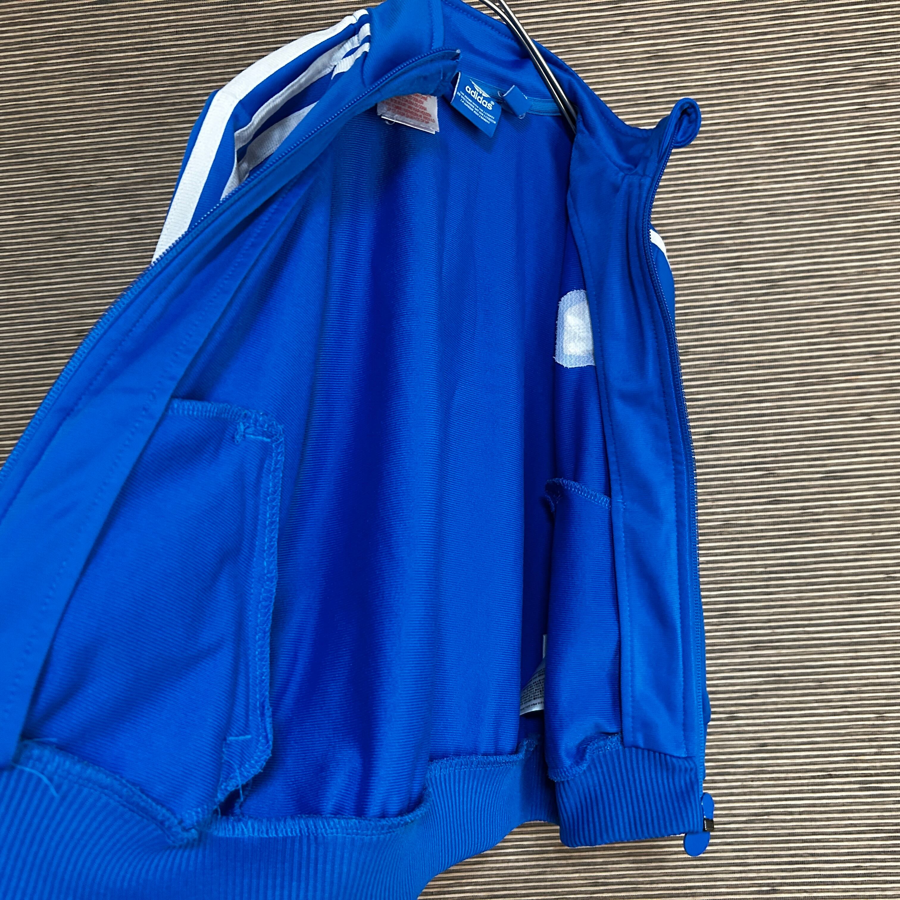 アディダス ジャージトラックジャケット青白子供110刺繍ファイヤーバードN 古着 キッズ 人気カラー トレフォイル ブルー