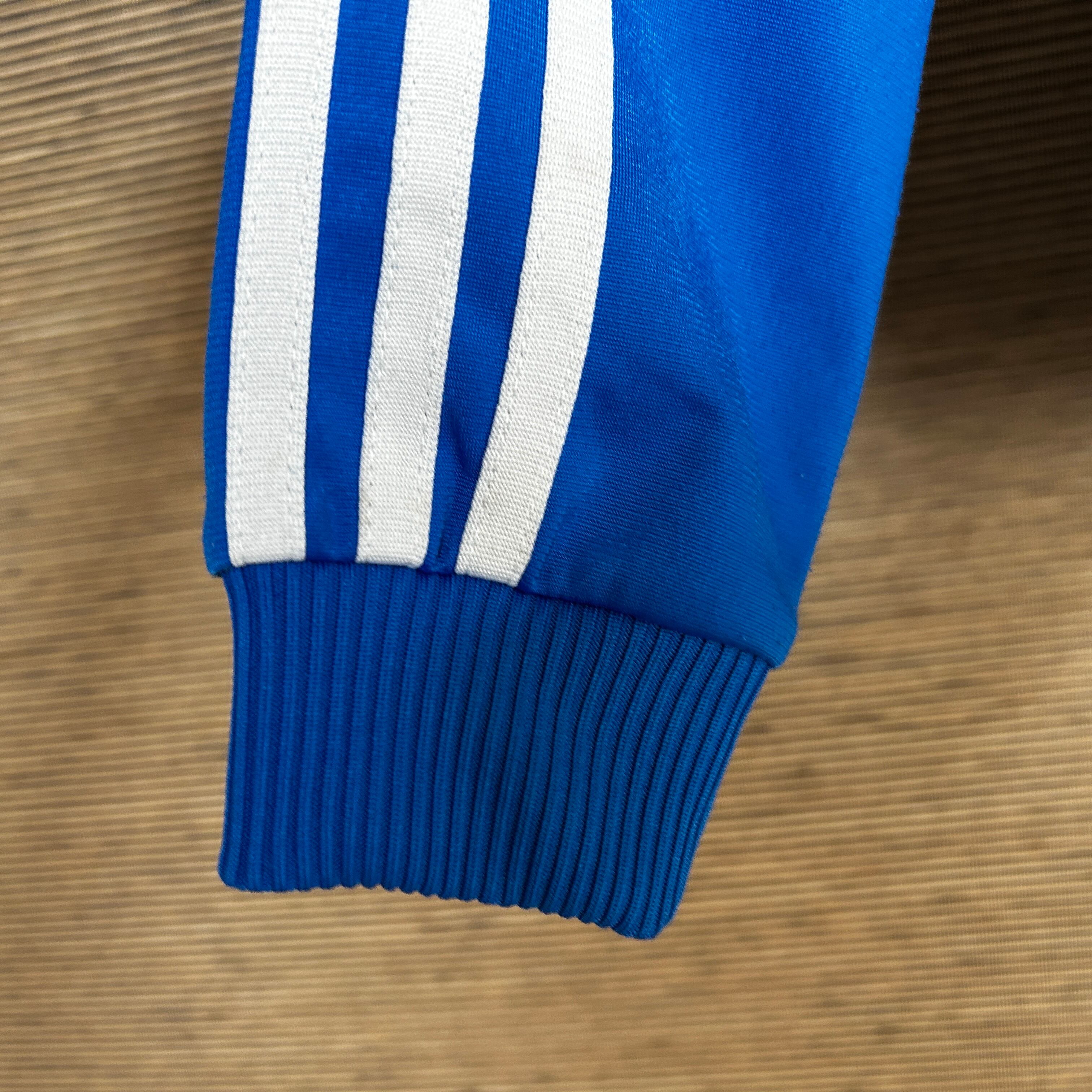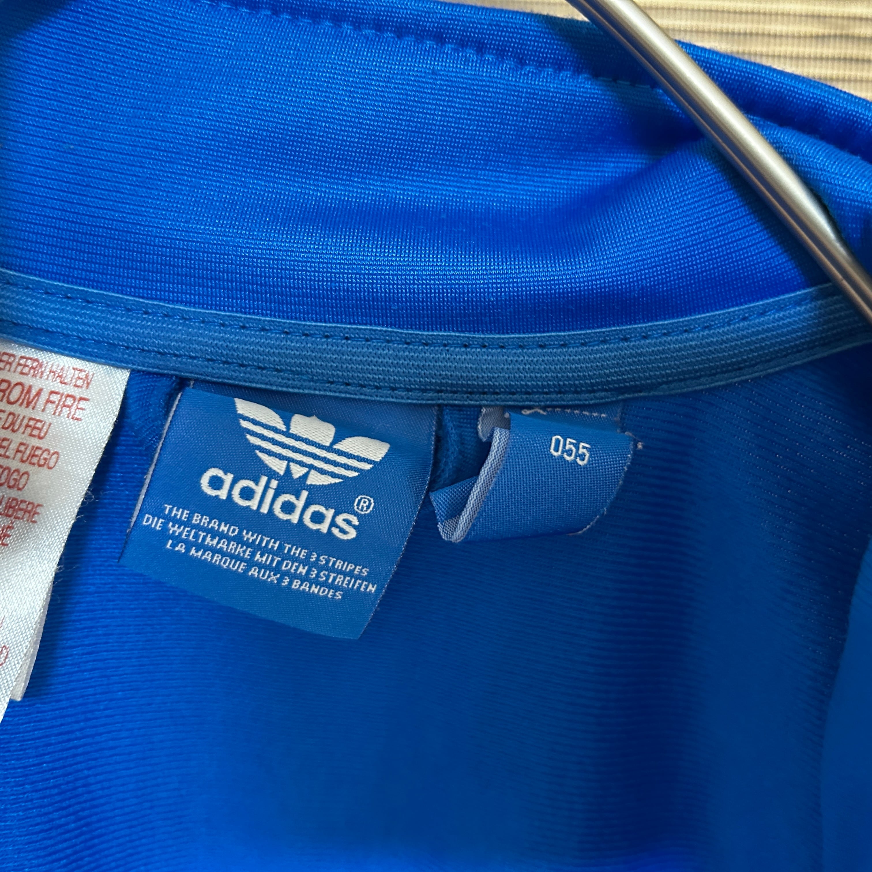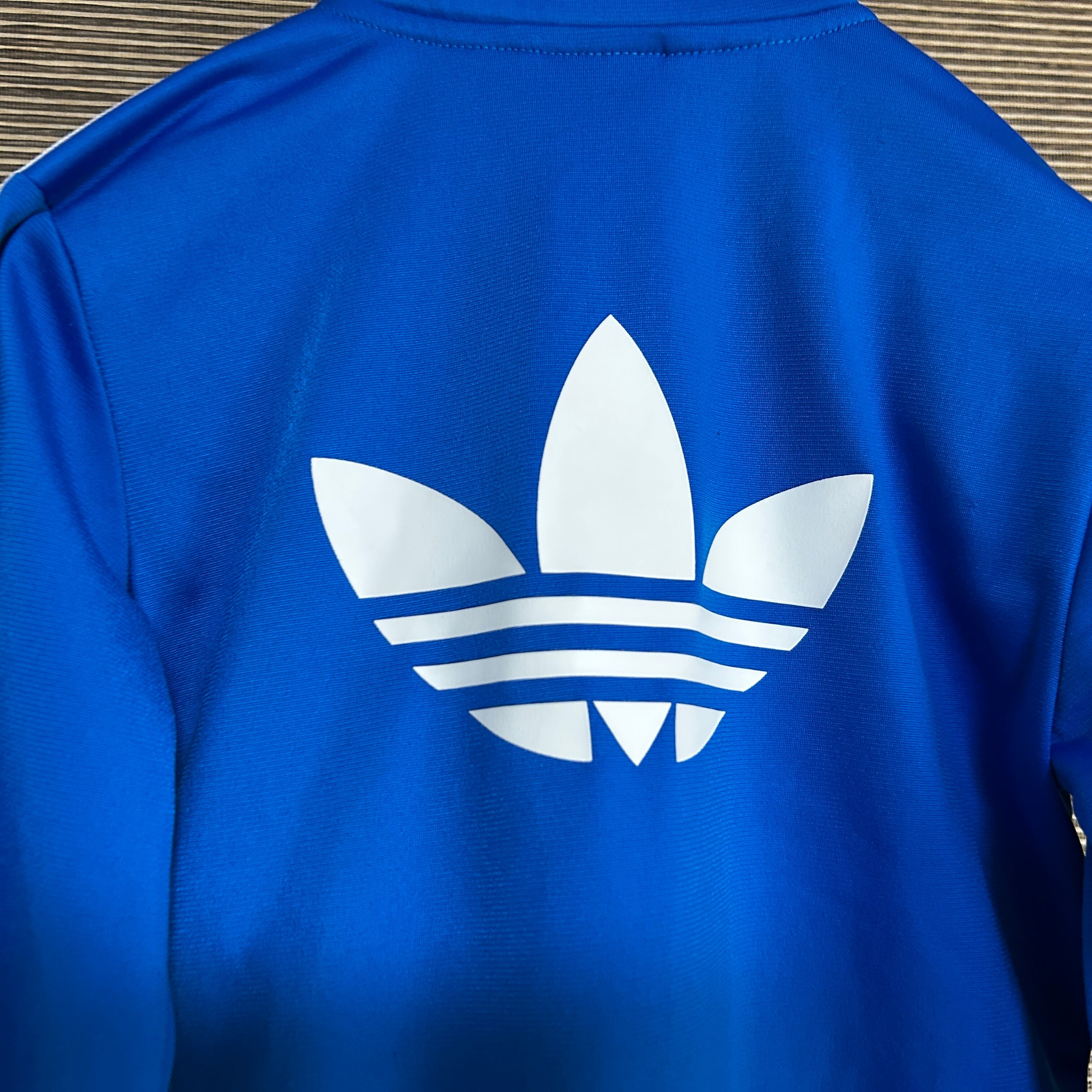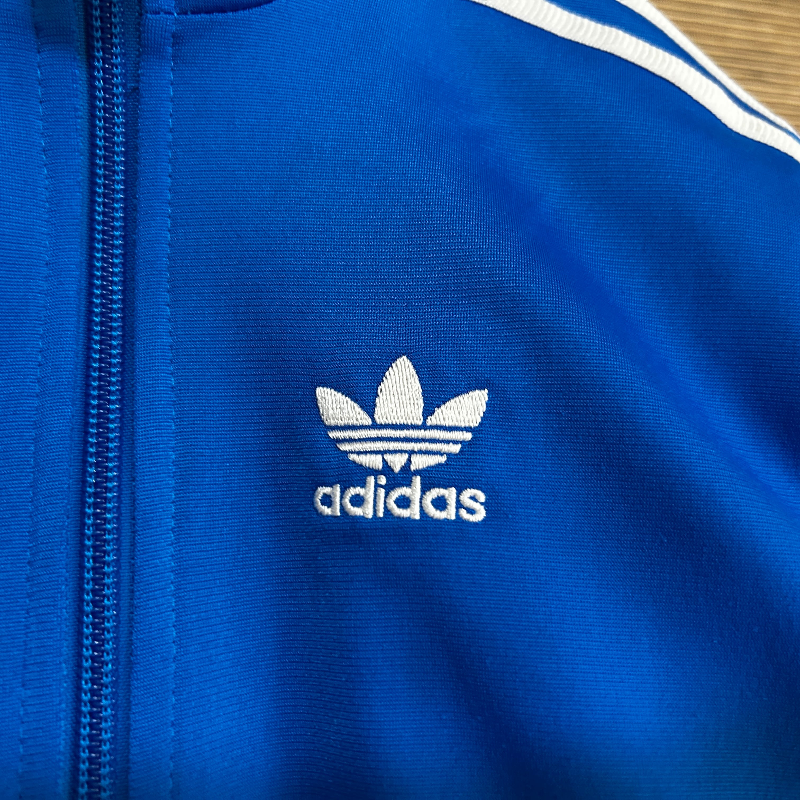 アディダス ジャージトラックジャケット青白子供110刺繍ファイヤーバードN 古着 キッズ 人気カラー トレフォイル ブルー