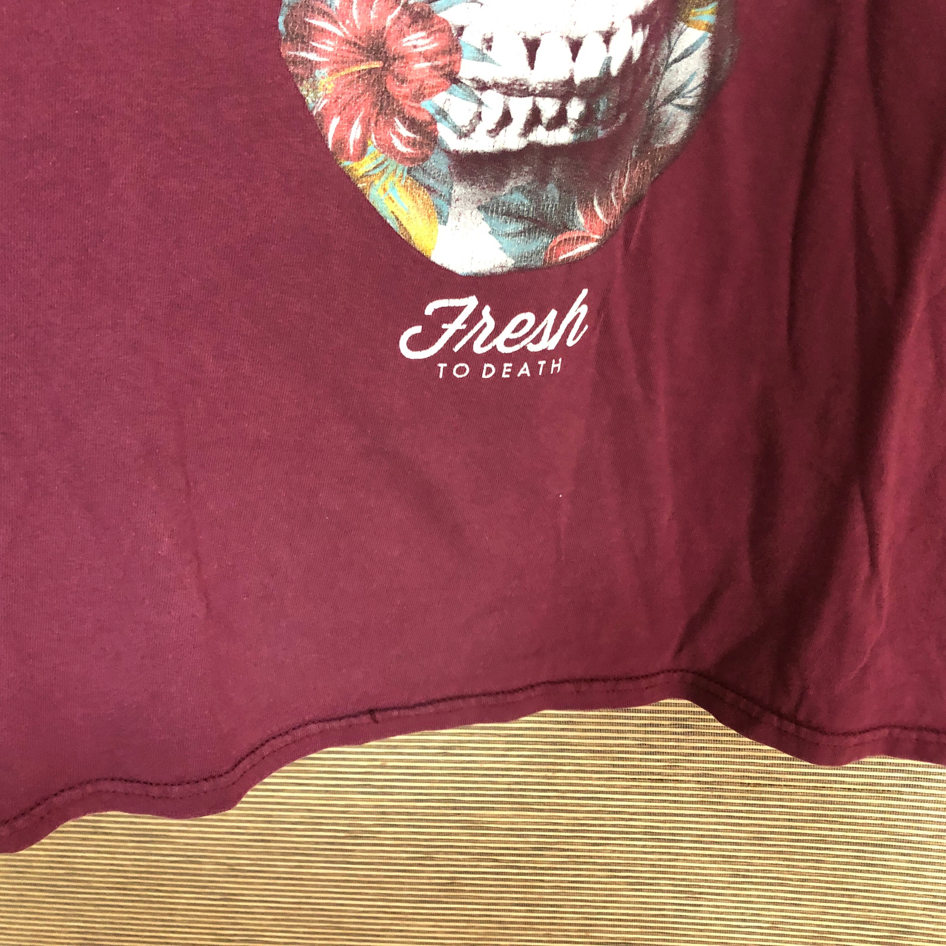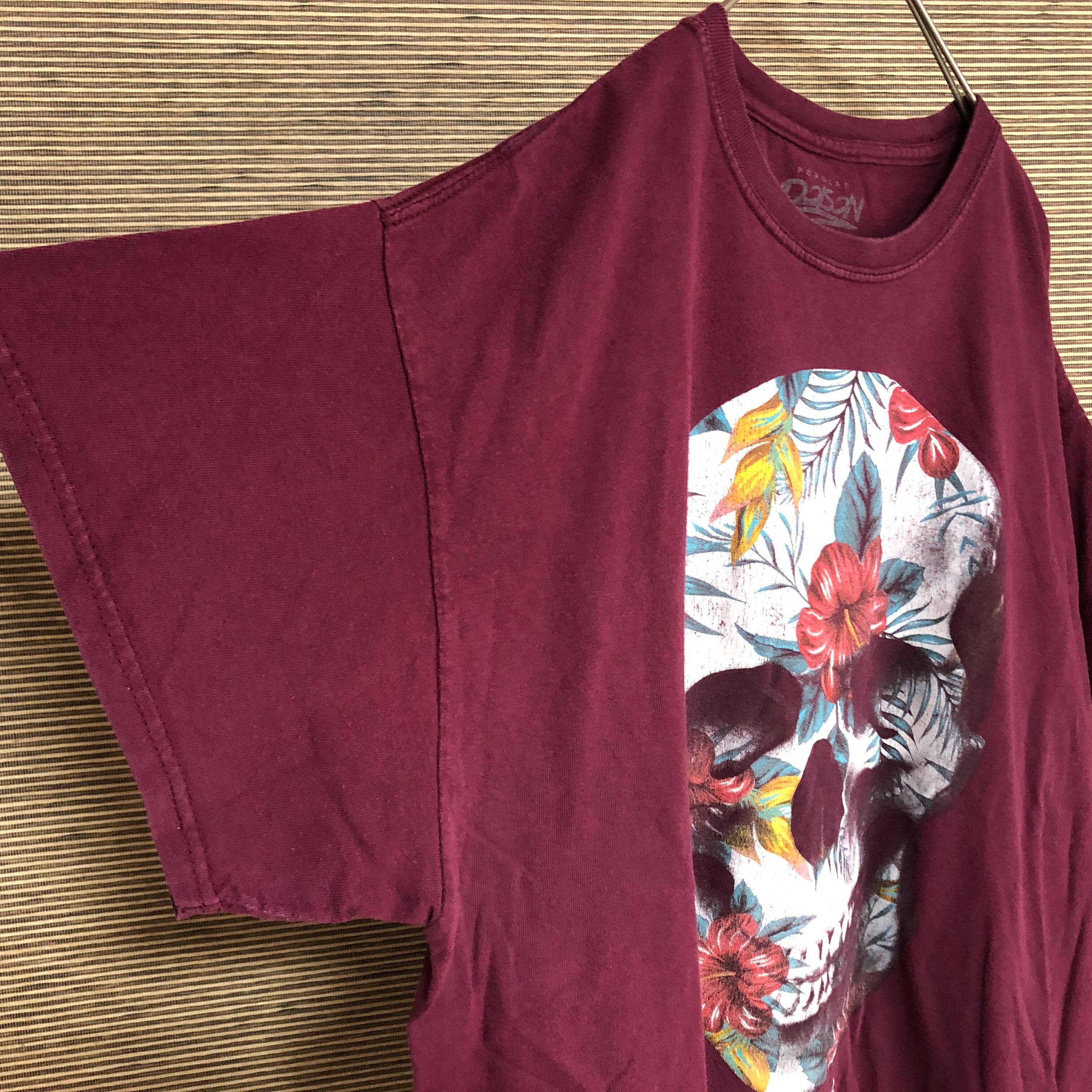総柄 半袖Tシャツ 花柄 ドクロ ガイコツ ボタニカル ワインレッド66 古着 ビッグサイズ XL 激レア 人気