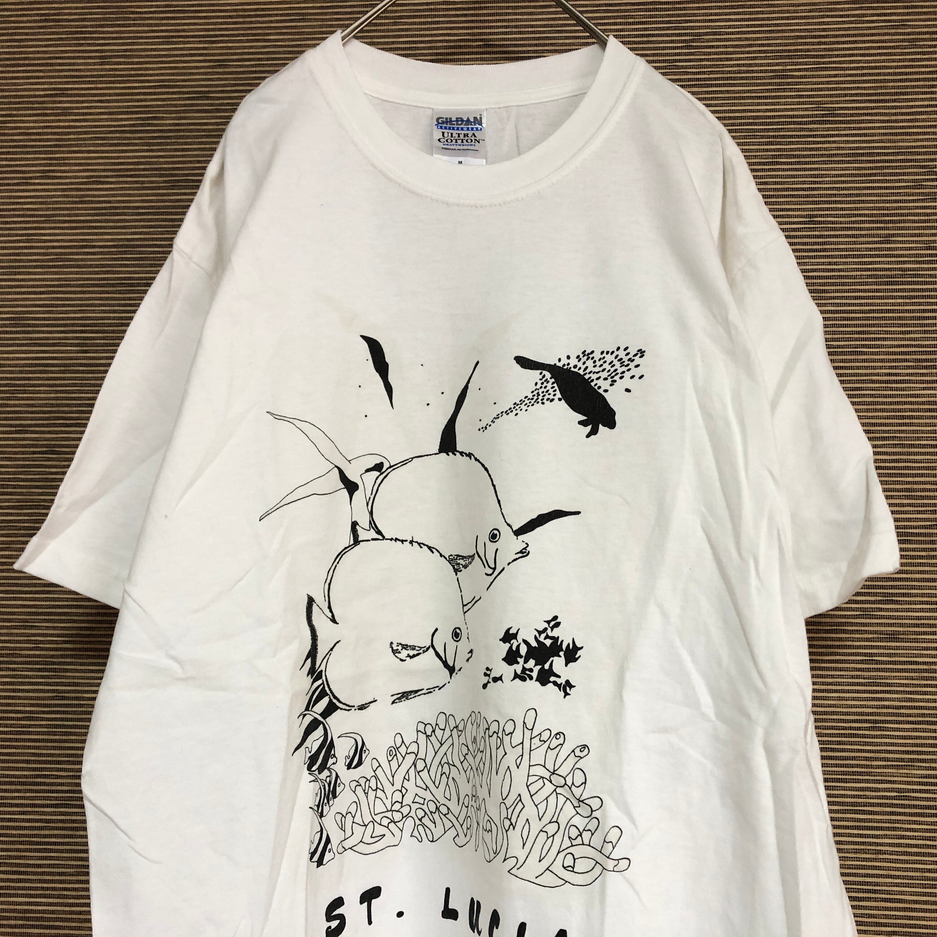 ギルダン 半袖Tシャツ 熱帯魚 ジュゴン サンゴ 海 ディスカス 白60 古着 デカプリント