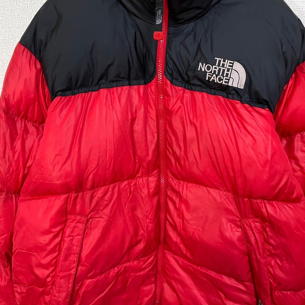ノースフェイス ダウンジャケット ヌプシ 700 赤レッド黒ブラック 刺繍8K 古着 バイカラー ワンポイントロゴ