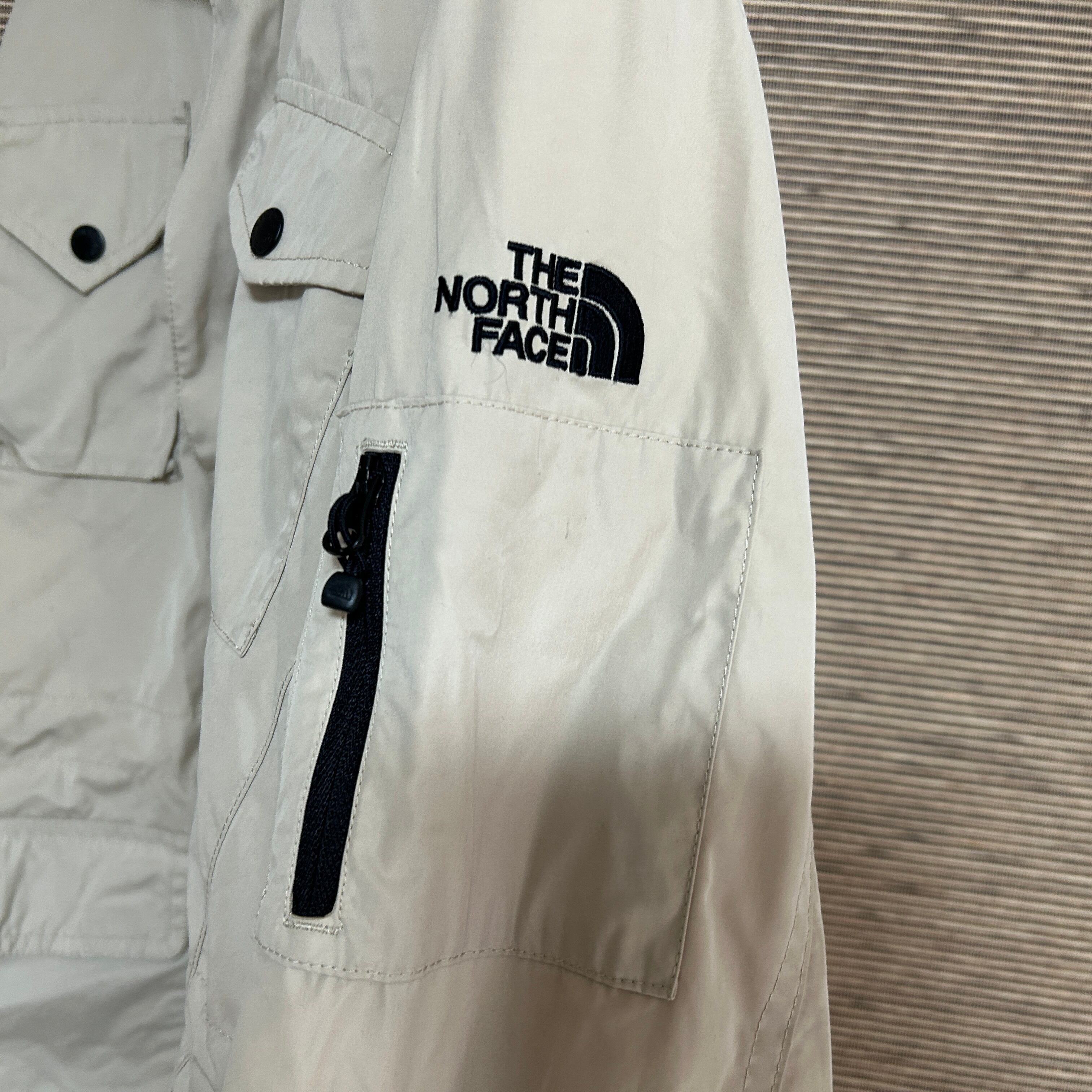 ノースフェイス マウンテンパーカー ベージュ 子供140 肩ロゴ 刺繍 A2 古着 キッズ 袖ロゴ スリーブロ