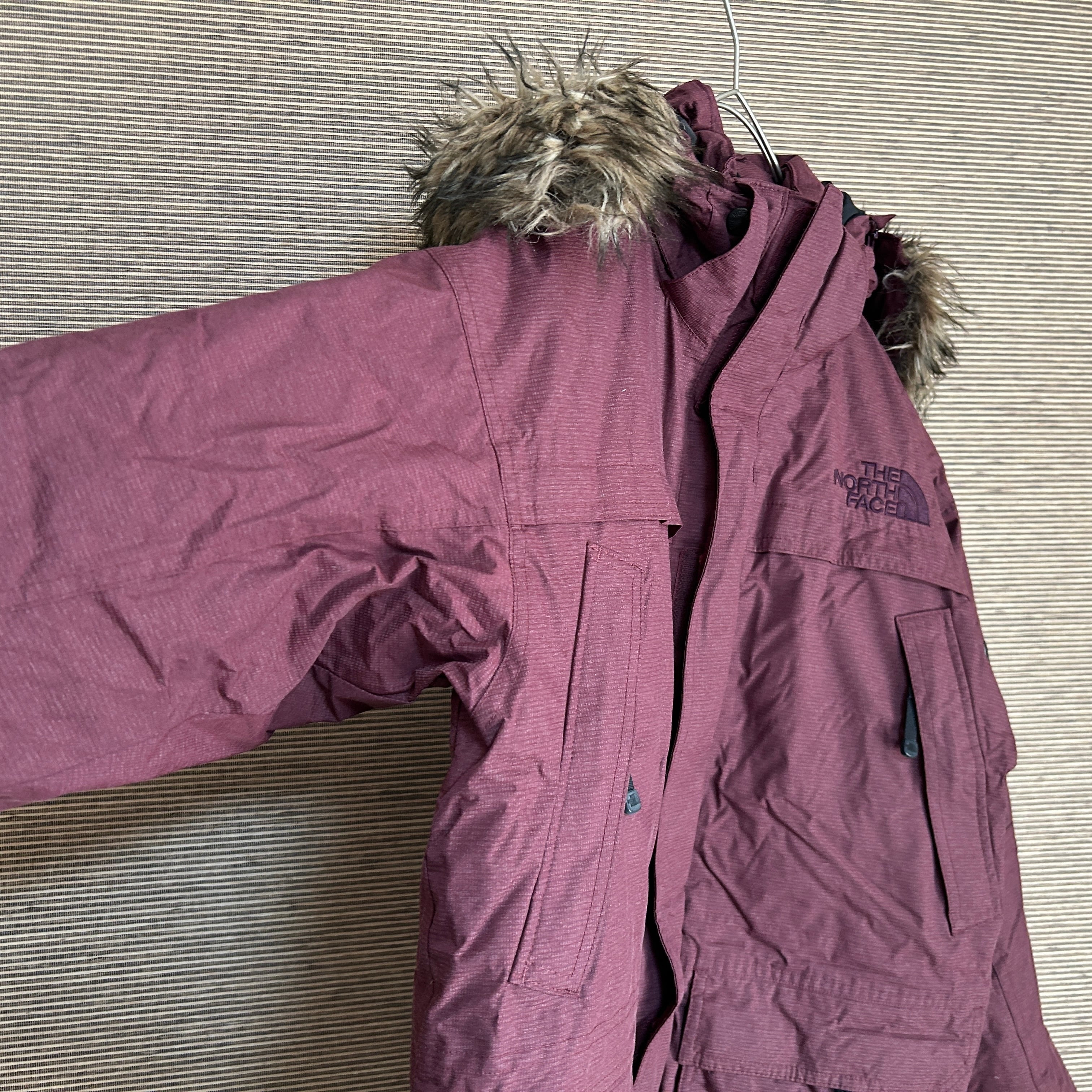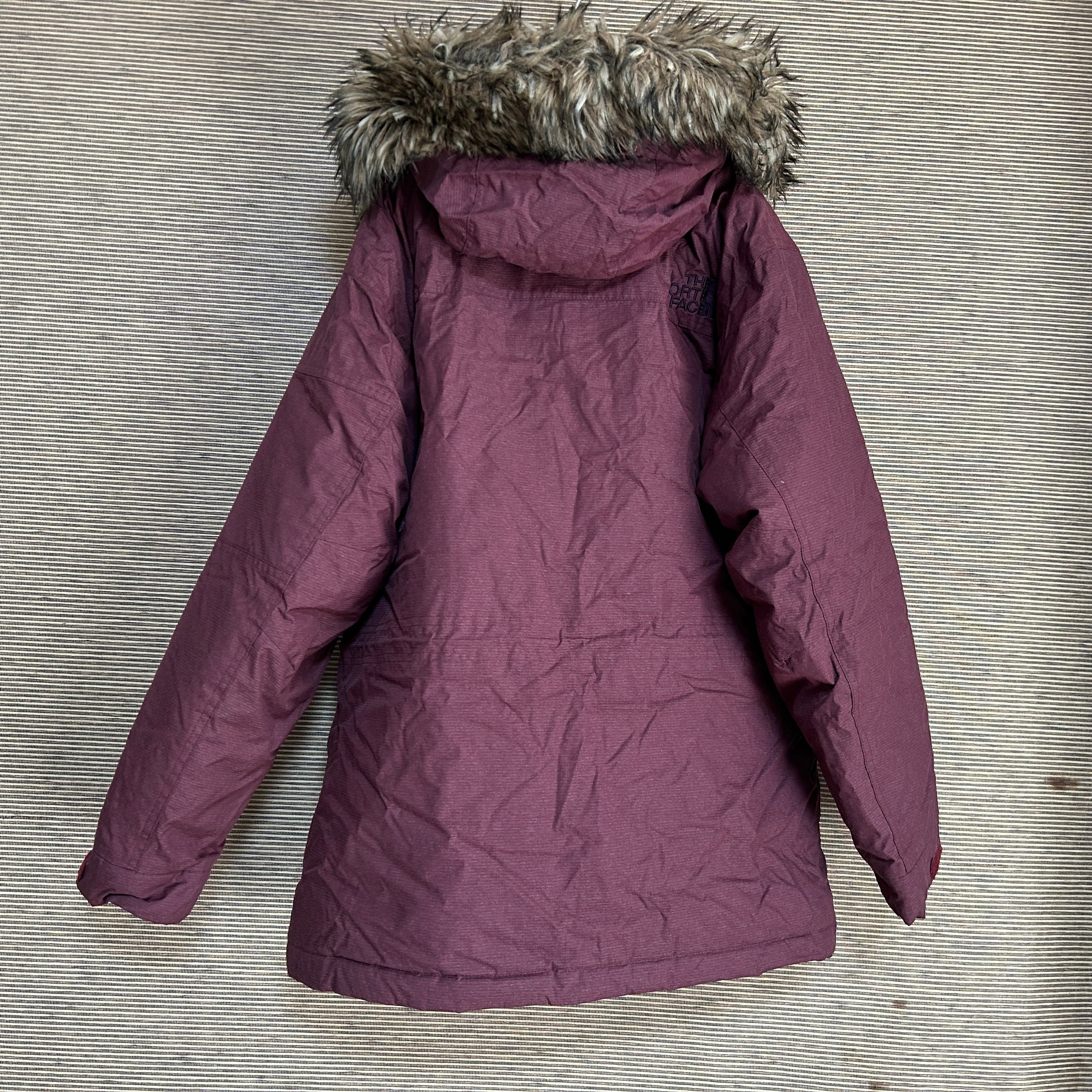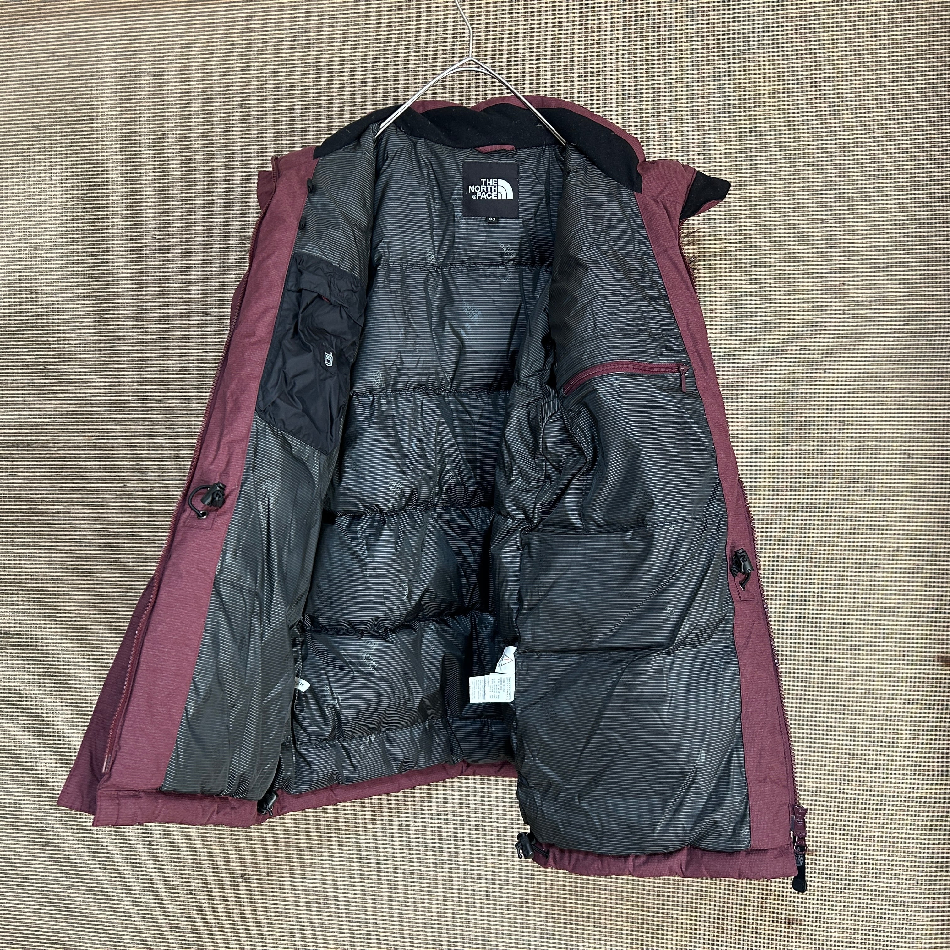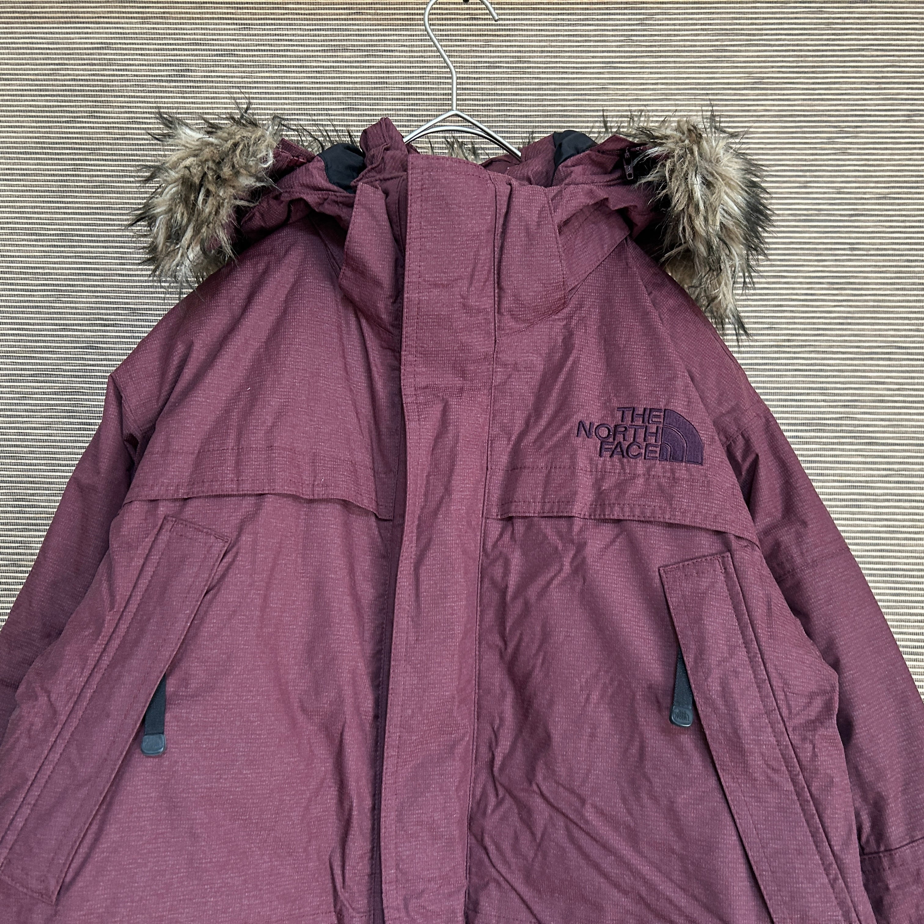 ノースフェイス ダウンジャケット モッズコートあずき色フェイクファーハイベント5R 古着 激レアカラー 袖ロゴ hyvent