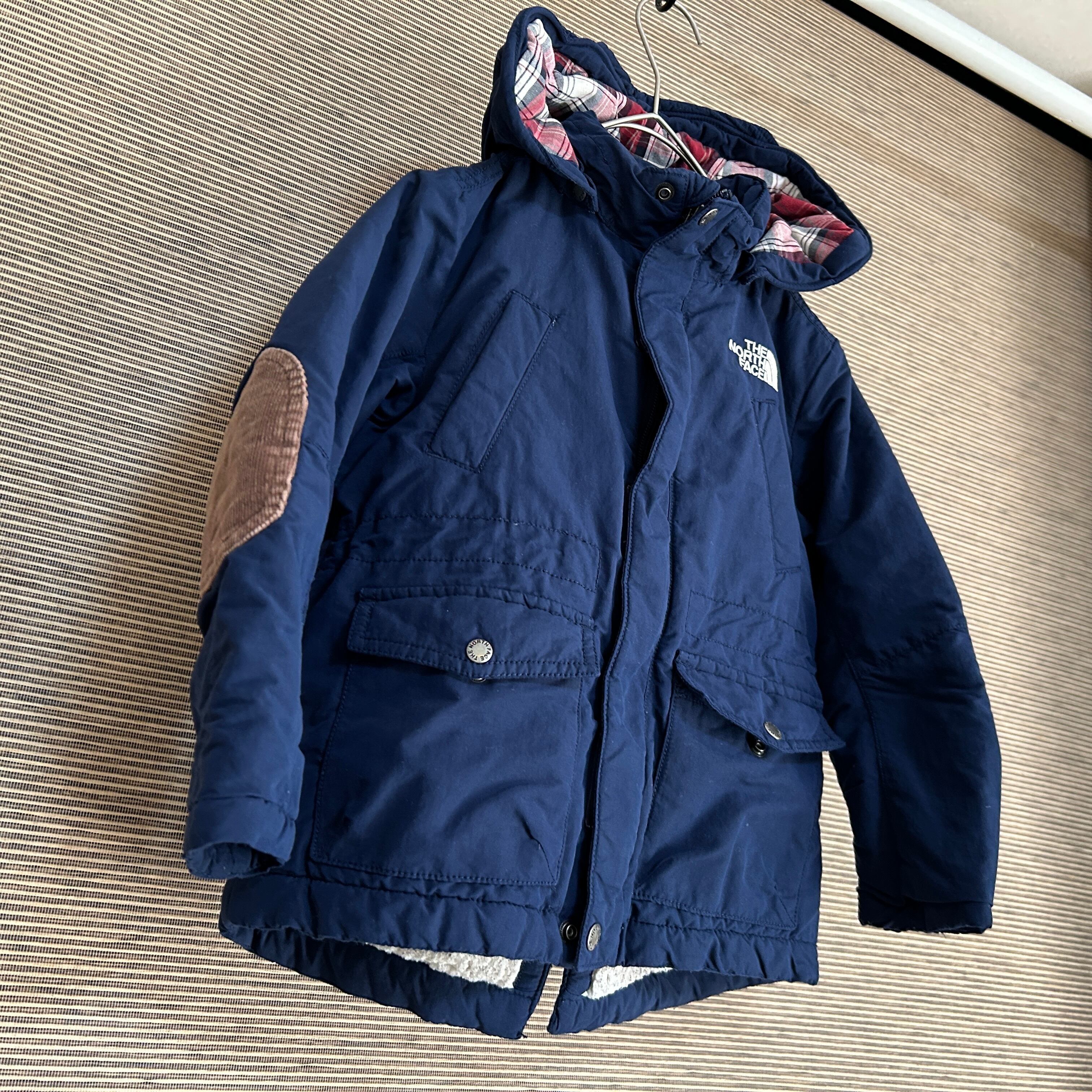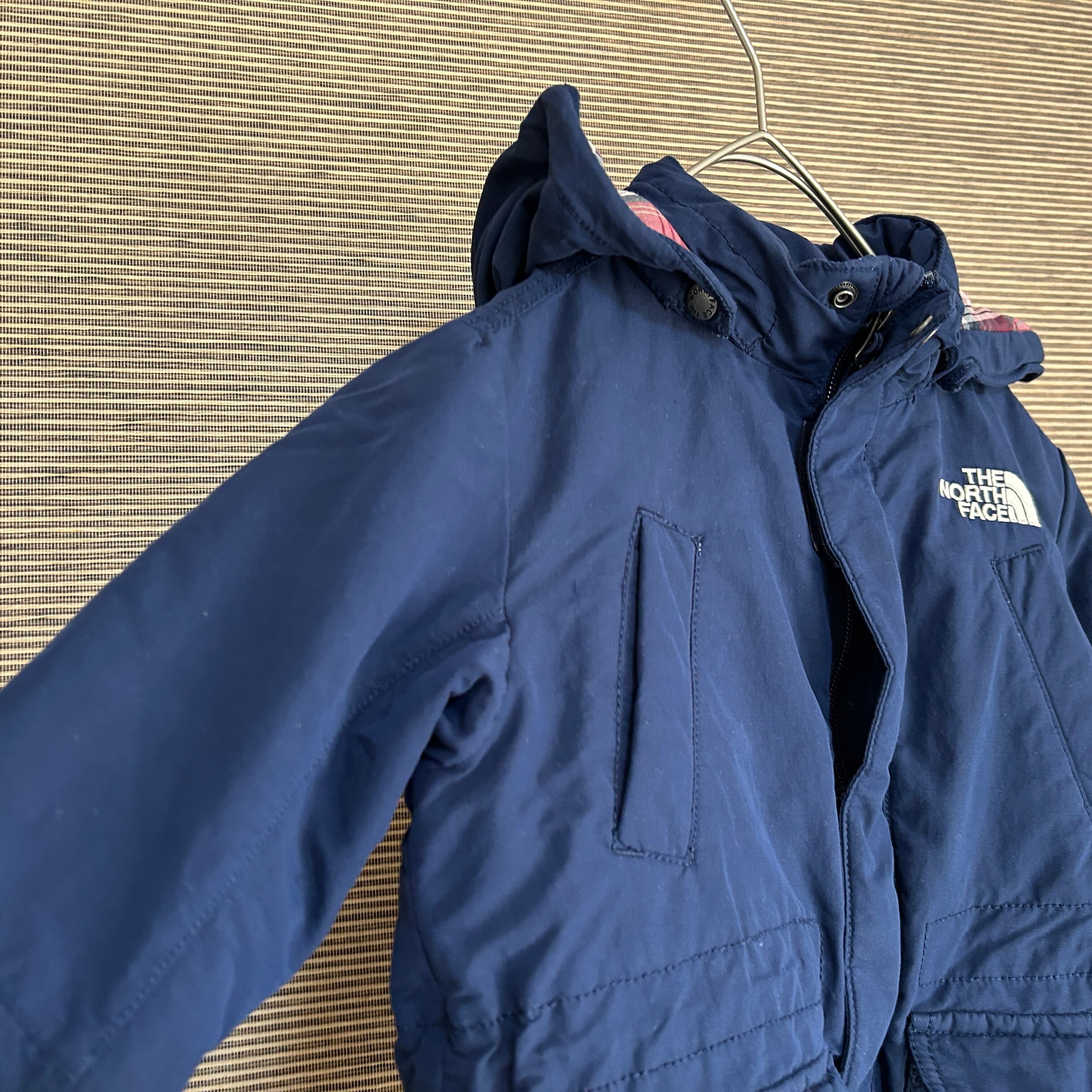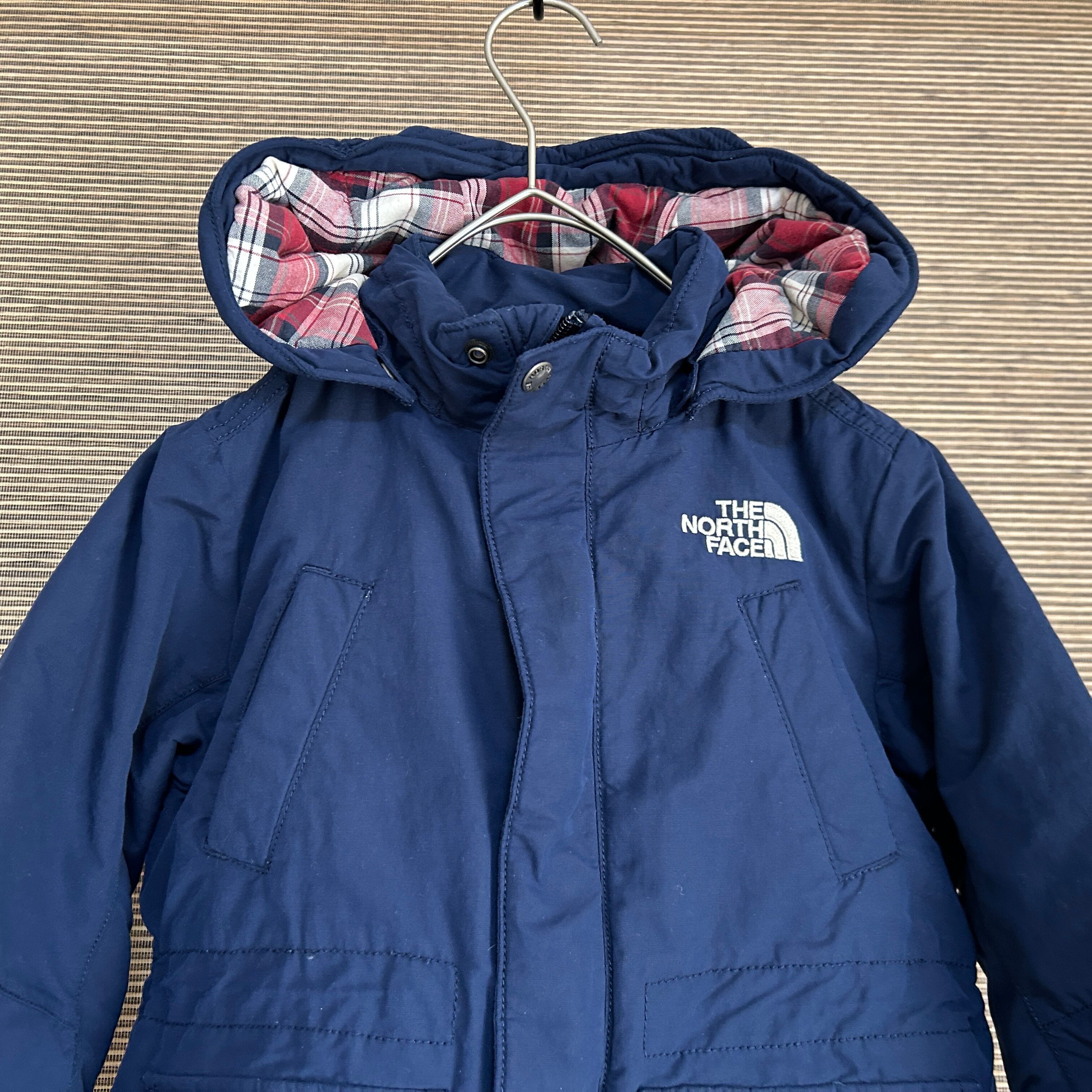 ノースフェイス マウンテンパーカー ネイビー 子供110 刺繍 もこもこC1 古着 キッズ ワンポイントロゴ チェック柄